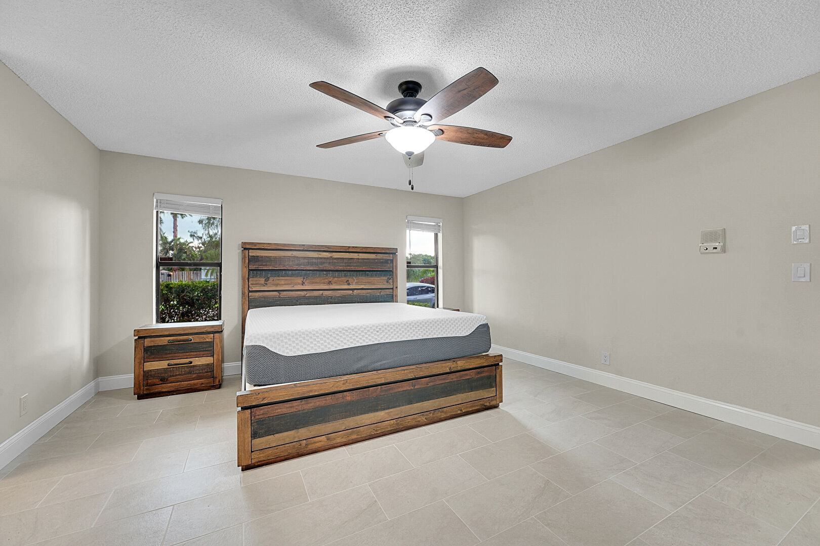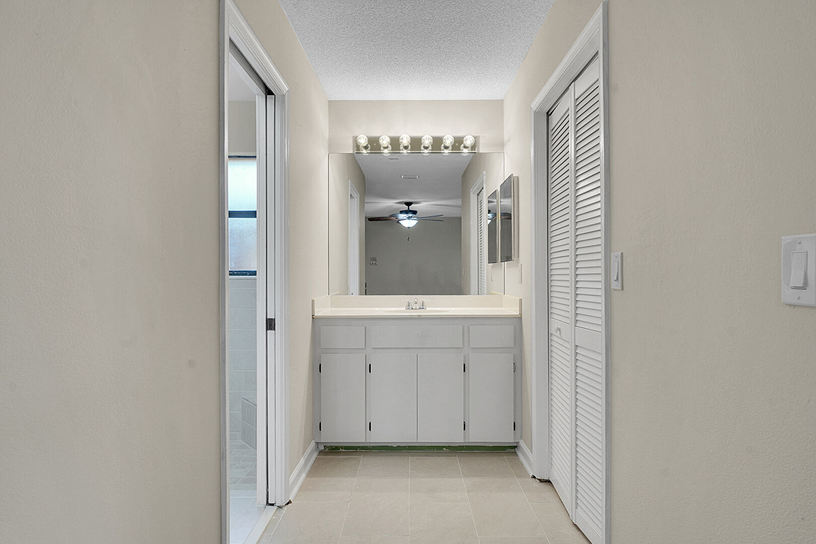 Baseboards Wall, Ceiling Fan, Drywall, Full Bathroom, Textured Ceiling, Textured Wall, Tile Floor, Vanity, Closet, Natural Light