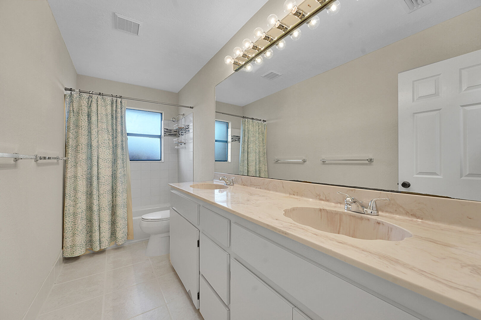 Baseboards Wall, Combined Bath Shower, Double Vanity, Drywall, Natural Light, Tile Floor, Vent, Full Bathroom