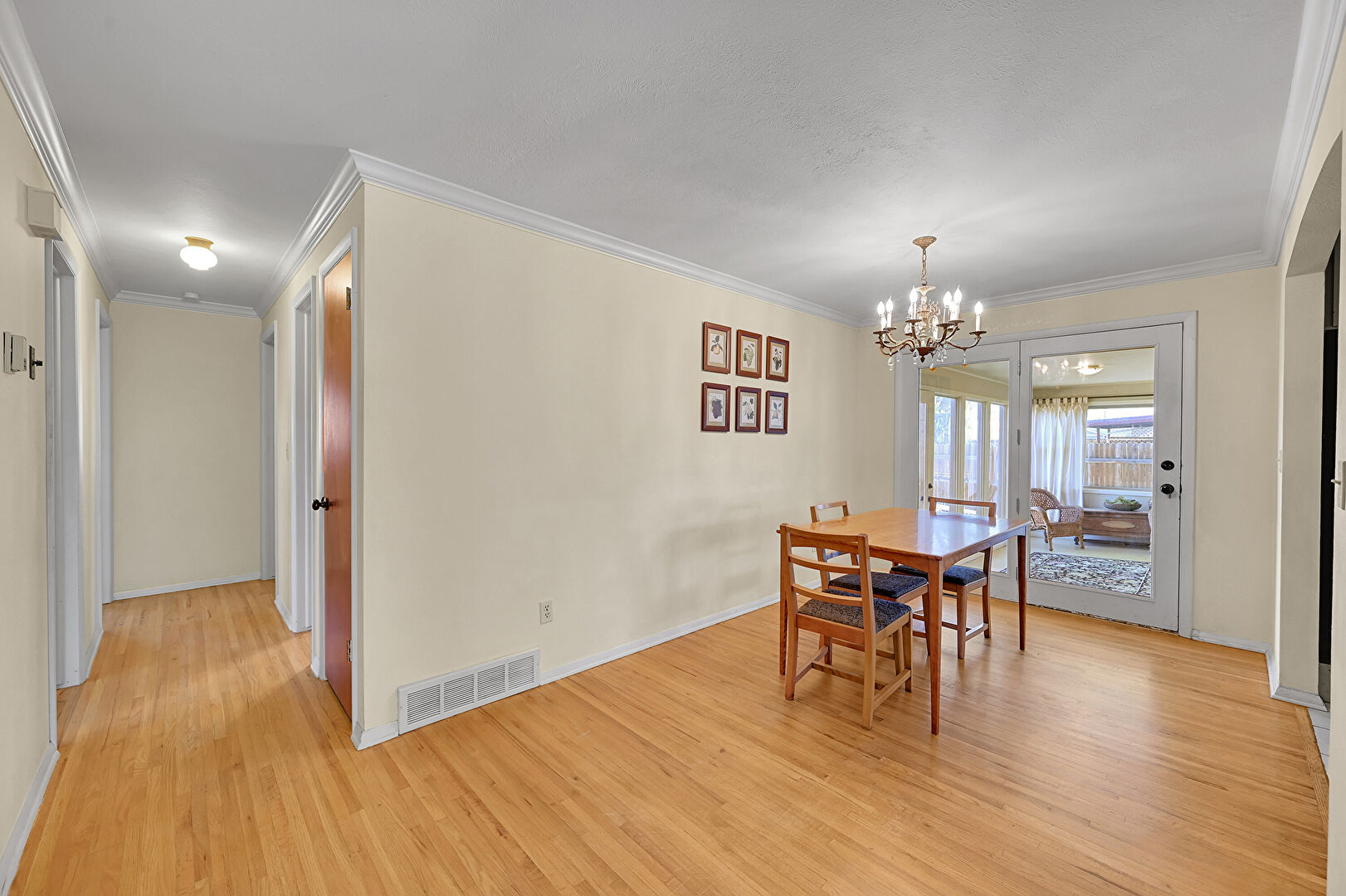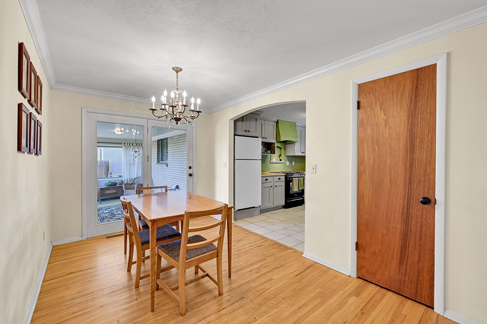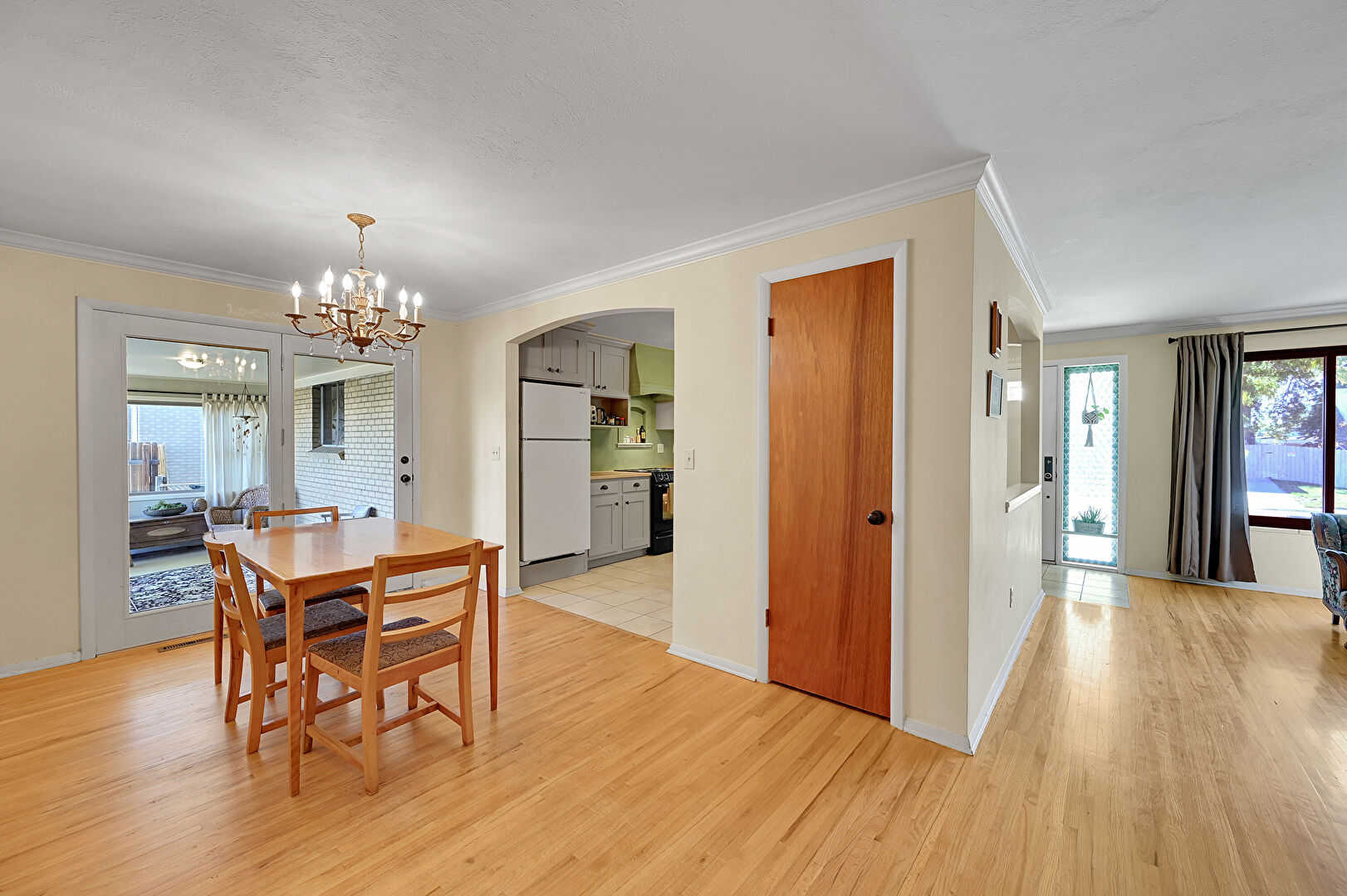 Arched Walkways, Baseboards Wall, Crown Molding, Drywall, Natural Light, Notable Chandelier, Textured Ceiling, Tile Floor, Vent, Wood Finish Floor, Baseboards Wall, Crown Molding, Notable Chandelier
