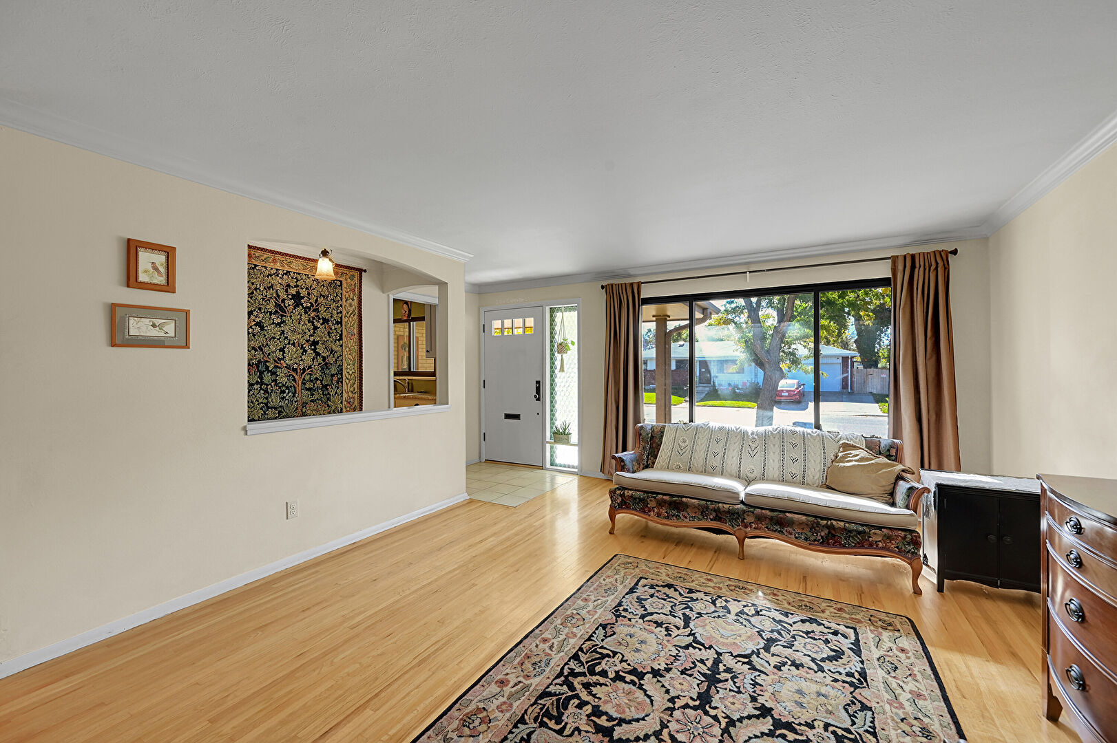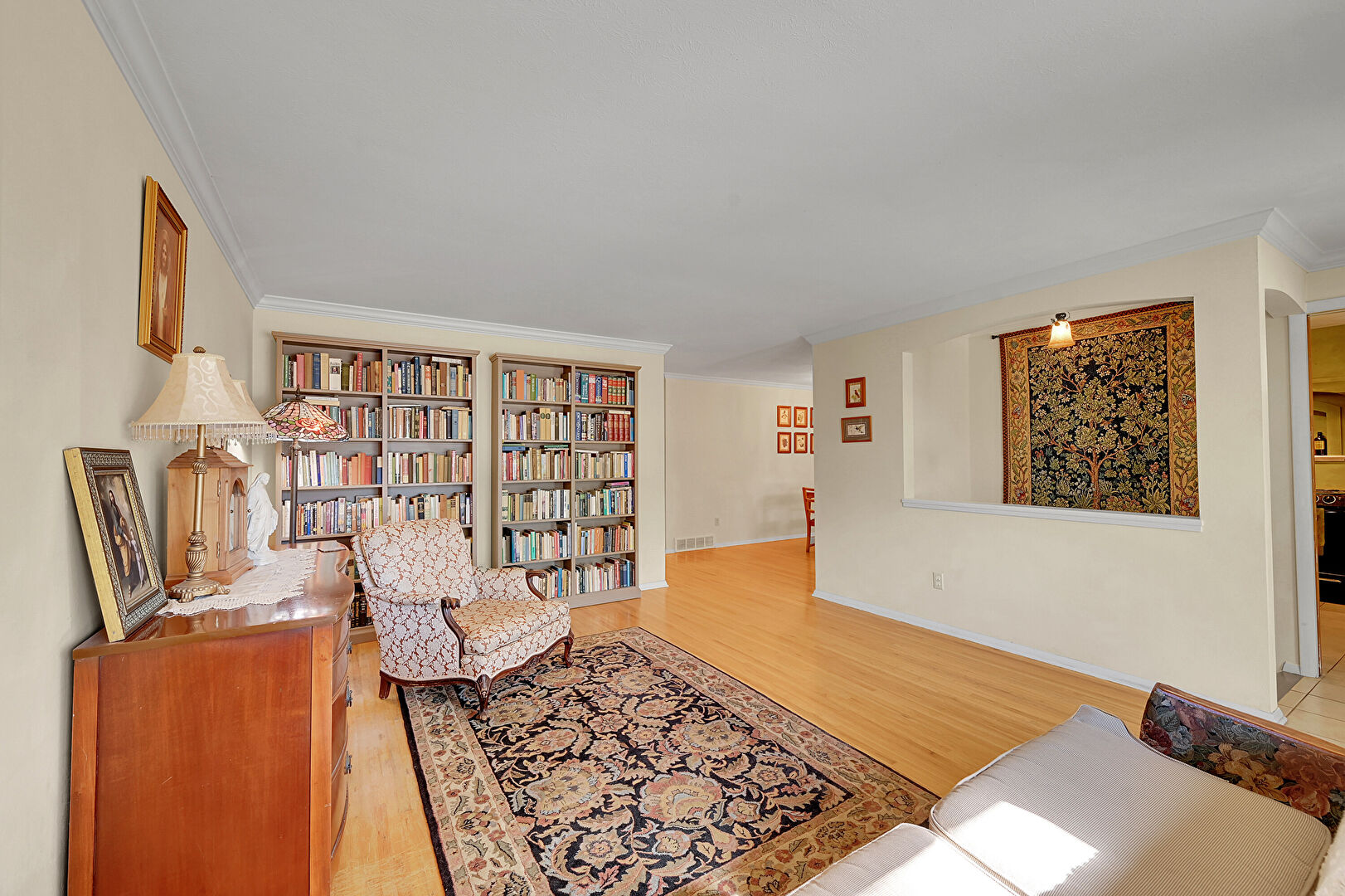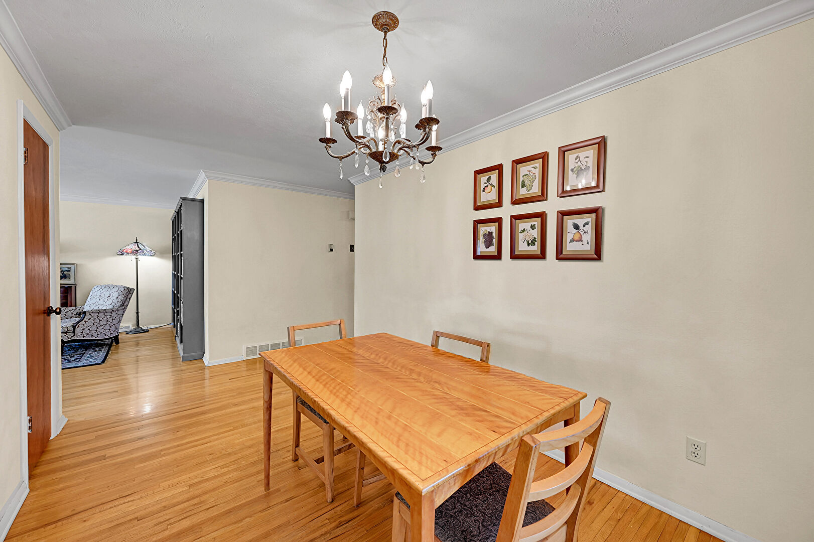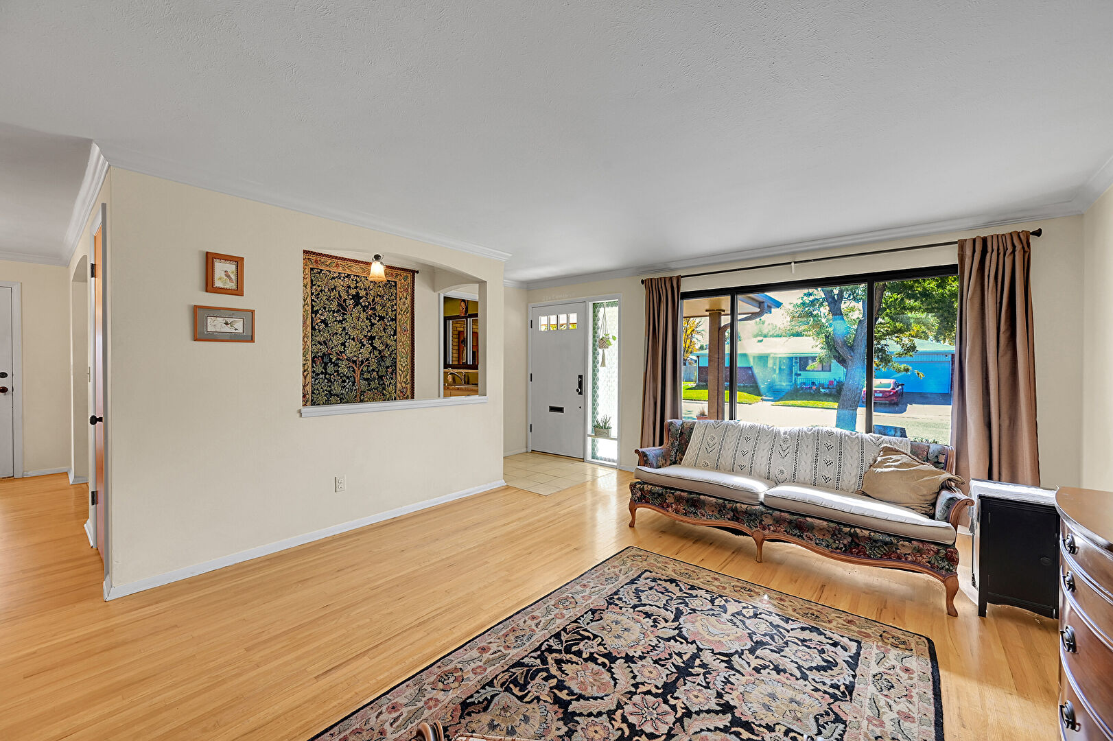 Arched Walkways, Baseboards Wall, Crown Molding, Drywall, Natural Light, Notable Chandelier, Textured Ceiling, Tile Floor, Vent, Wood Finish Floor, Baseboards Wall, Crown Molding, Notable Chandelier
