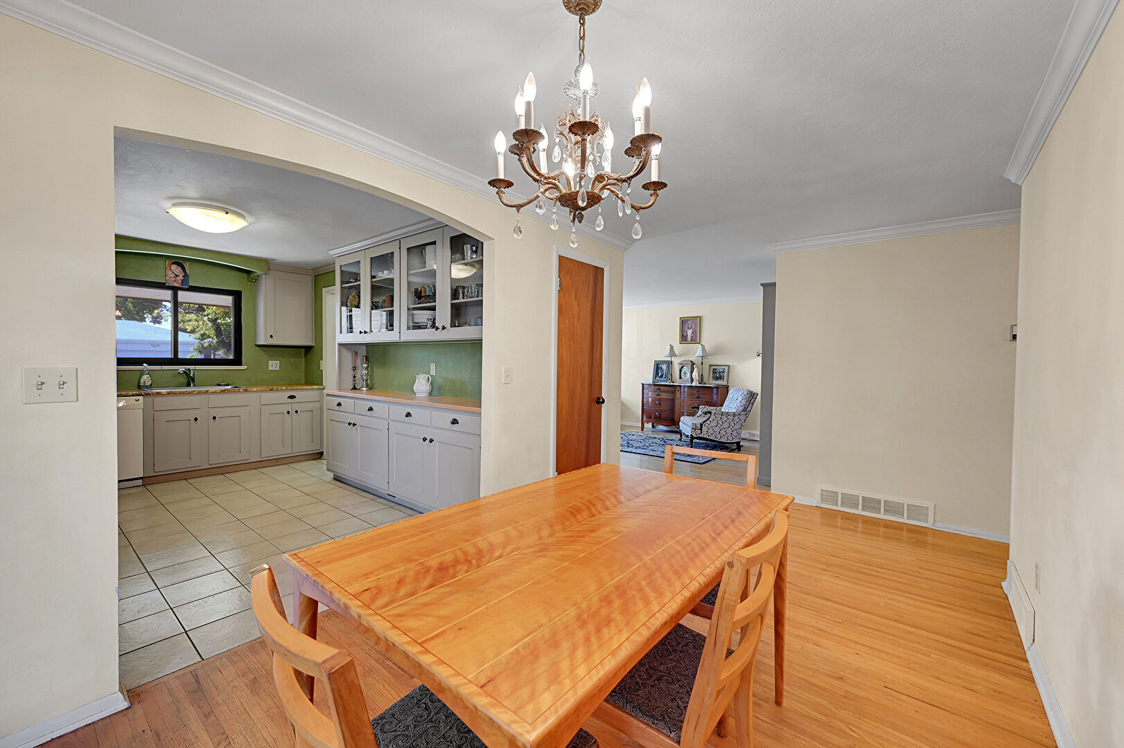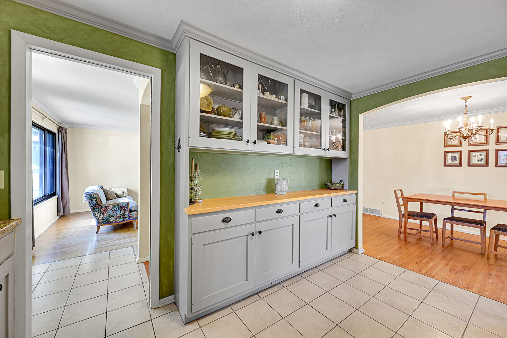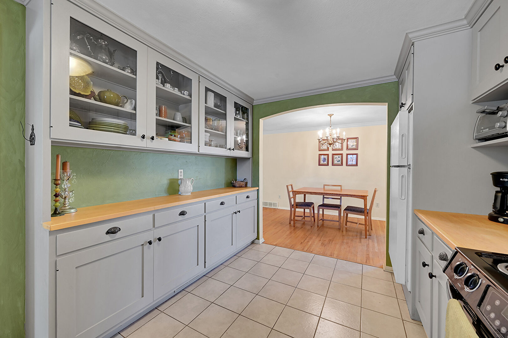 Arched Walkways, Baseboards Wall, Butcher Block Countertops, Crown Molding, Crown Molding Cabinets, Drywall, Glass Insert Cabinets, Gray Cabinets, Natural Light, Notable Chandelier, Open Shelves, Pendant Lighting, Shaker Cabinets, Tile Floor, Toaster, Vent, Wood Finish Floor, Arched Walkways, Butcher Block Countertops, Crown Molding Cabinets, Drywall, Gray Cabinets