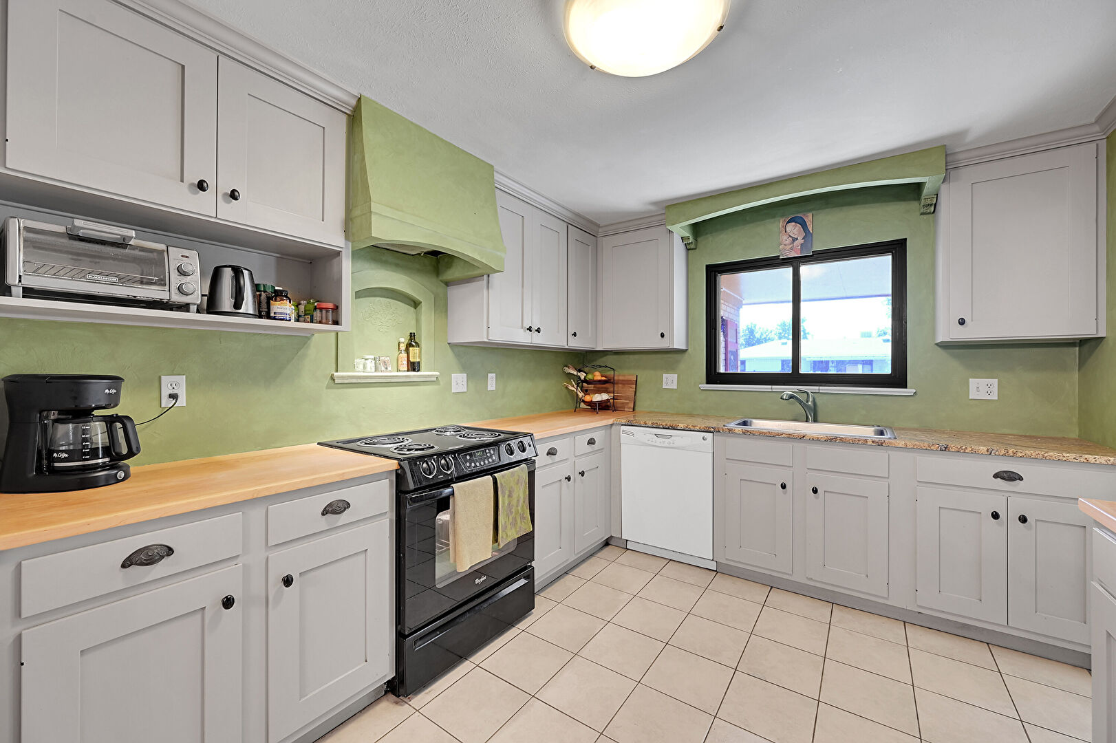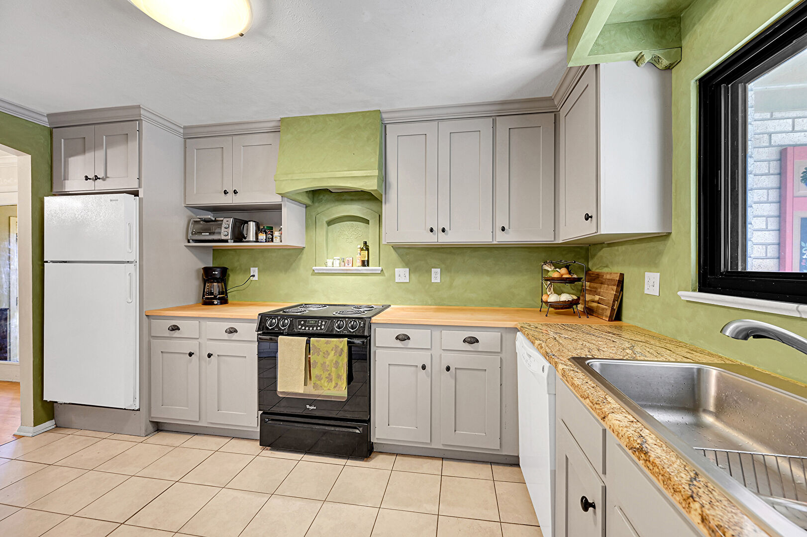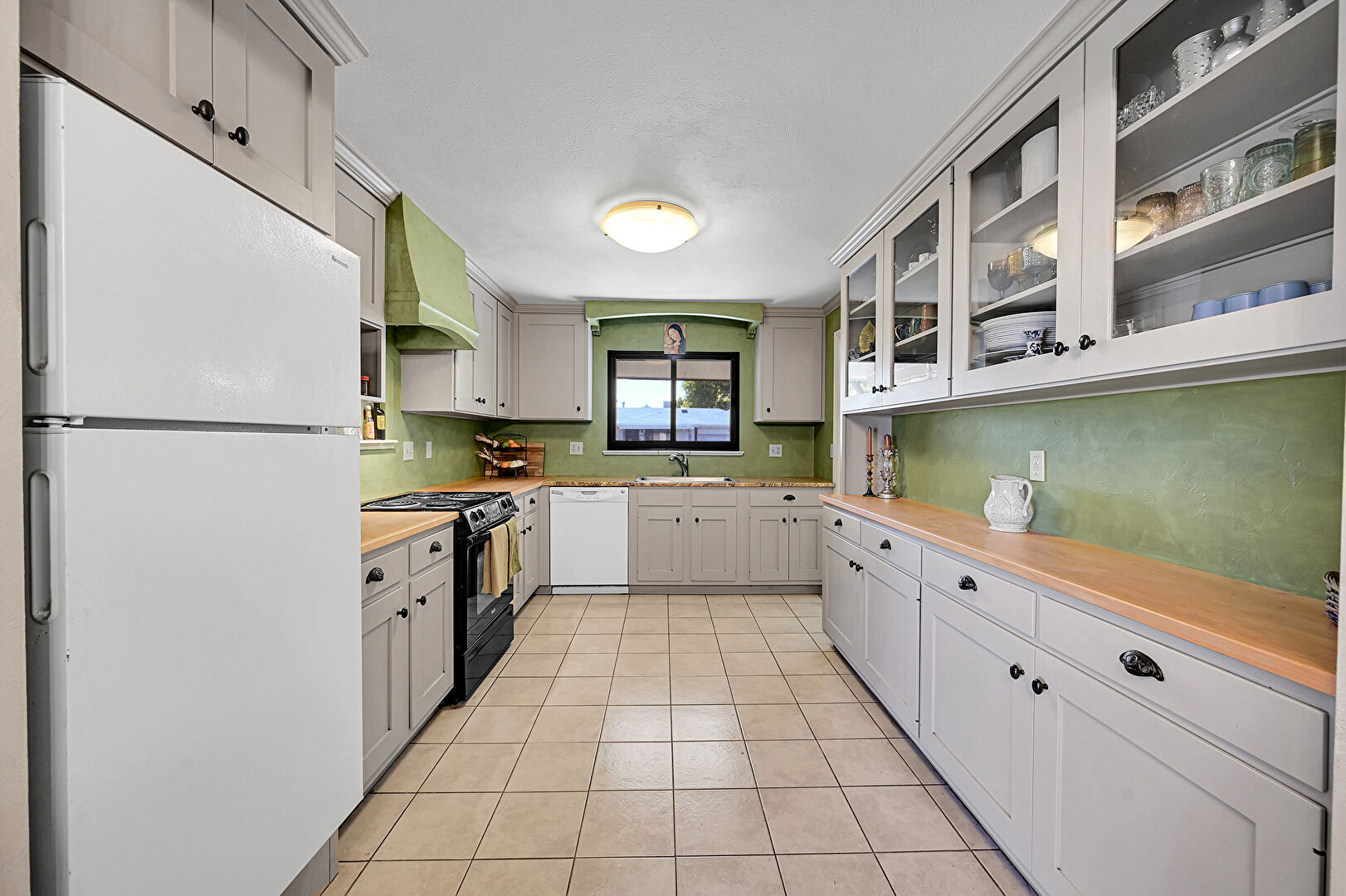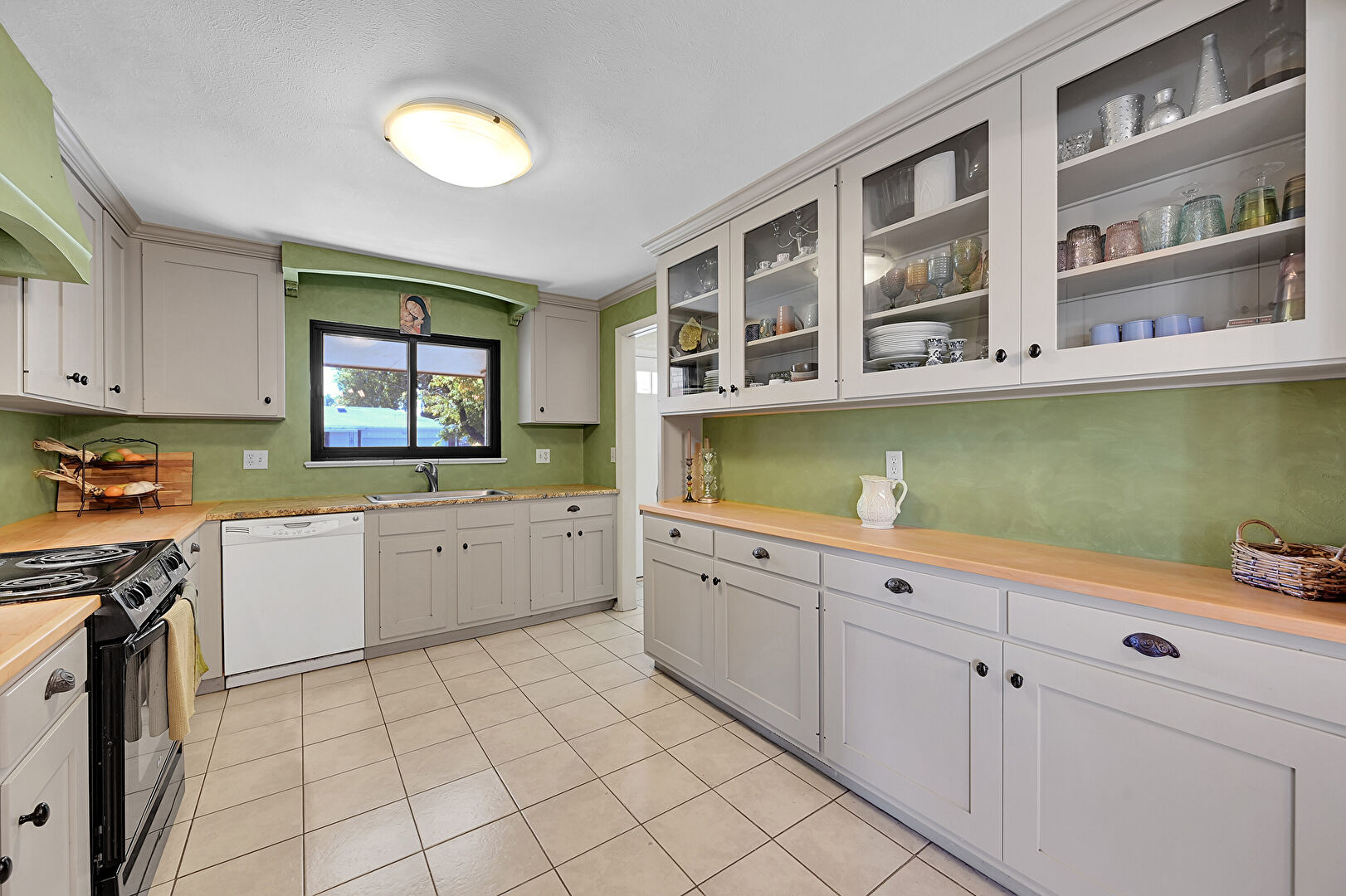 Arched Walkways, Baseboards Wall, Butcher Block Countertops, Crown Molding, Crown Molding Cabinets, Drywall, Glass Insert Cabinets, Gray Cabinets, Natural Light, Notable Chandelier, Open Shelves, Pendant Lighting, Shaker Cabinets, Tile Floor, Toaster, Vent, Wood Finish Floor, Arched Walkways, Butcher Block Countertops, Crown Molding Cabinets, Drywall, Gray Cabinets