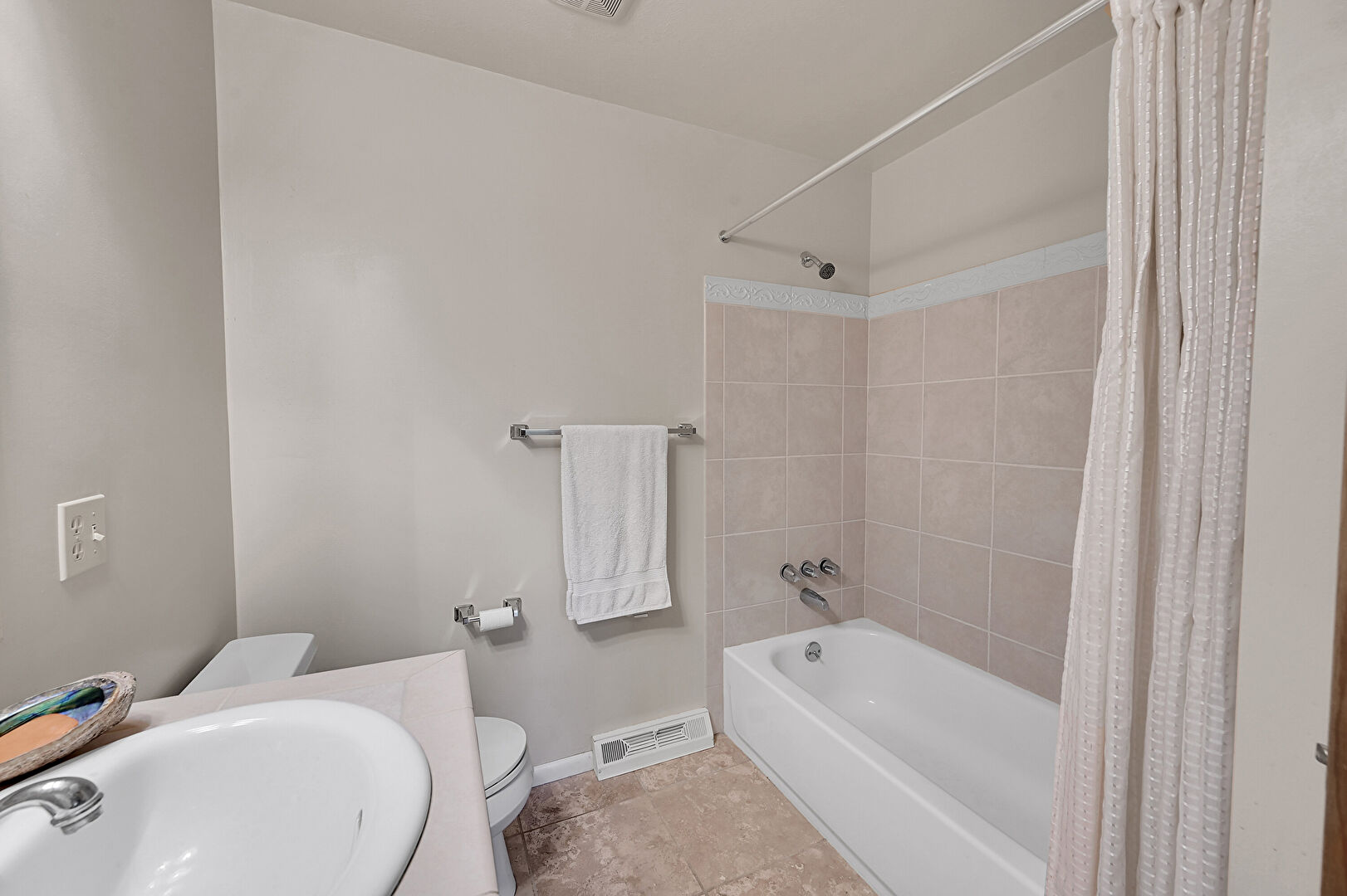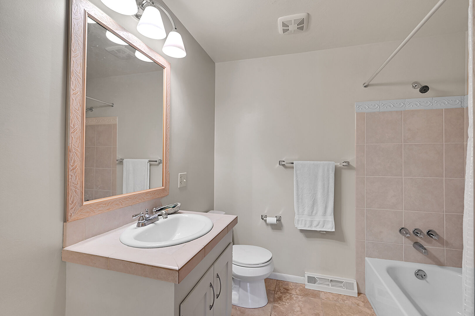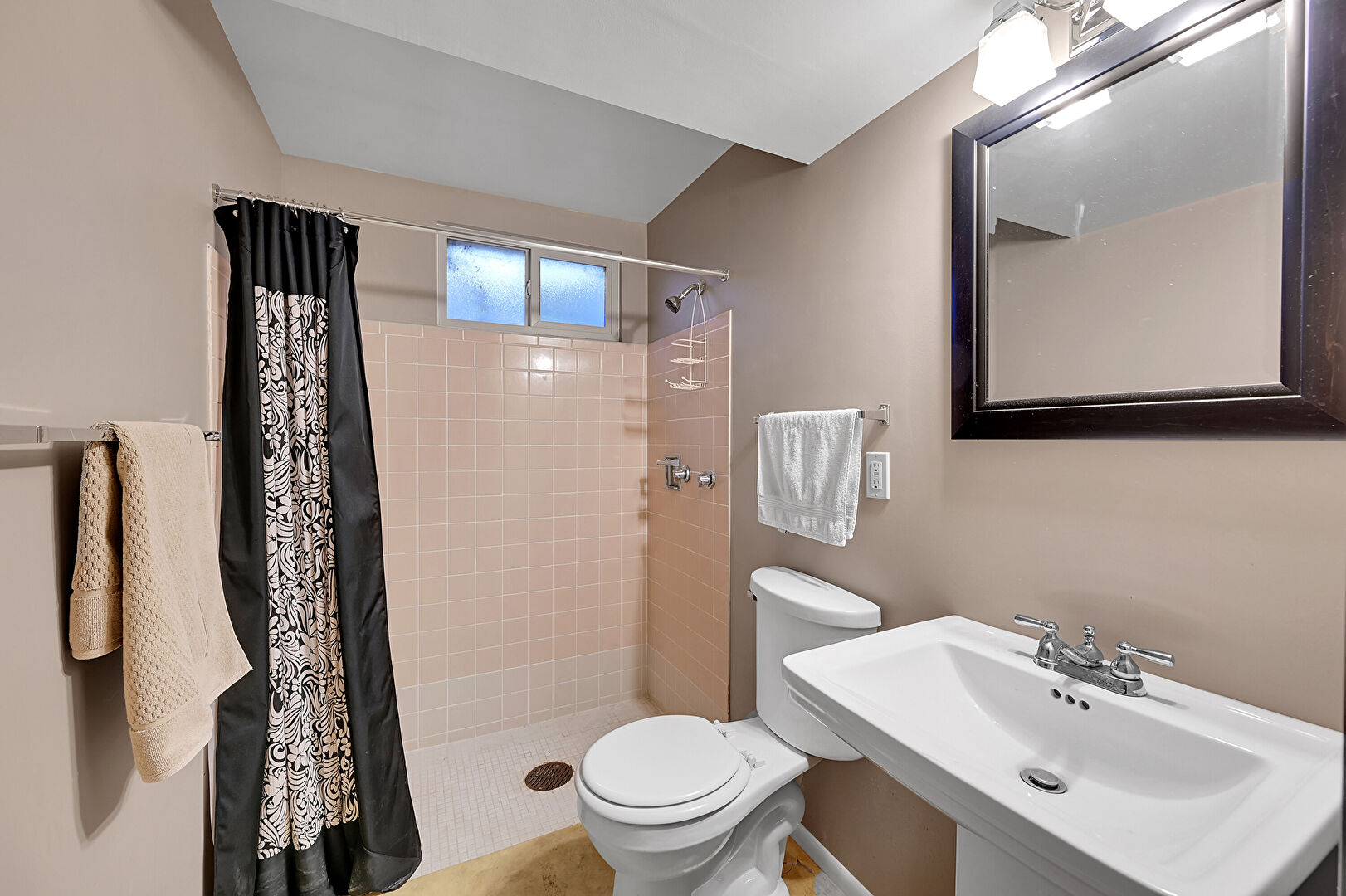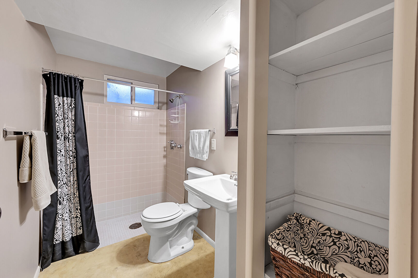 Baseboards Wall, Basement, Combined Bath Shower, Drywall, Full Bathroom, Natural Light, Tile Floor, Vanity, Vent, Basement, Closet, Combined Bath Shower, Vanity