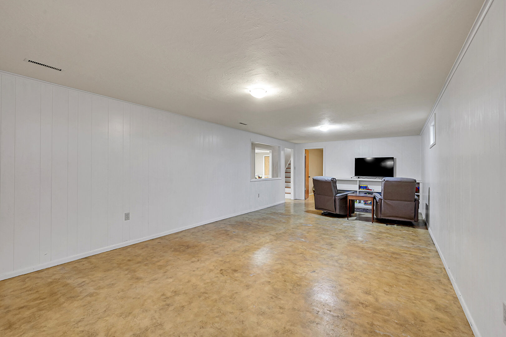 Baseboards Wall, Basement, Concrete Floor, Crown Molding, Natural Light, Office Area, Stairs, Textured Ceiling, Vent, Wood Wall, Basement, Concrete Floor, Vent