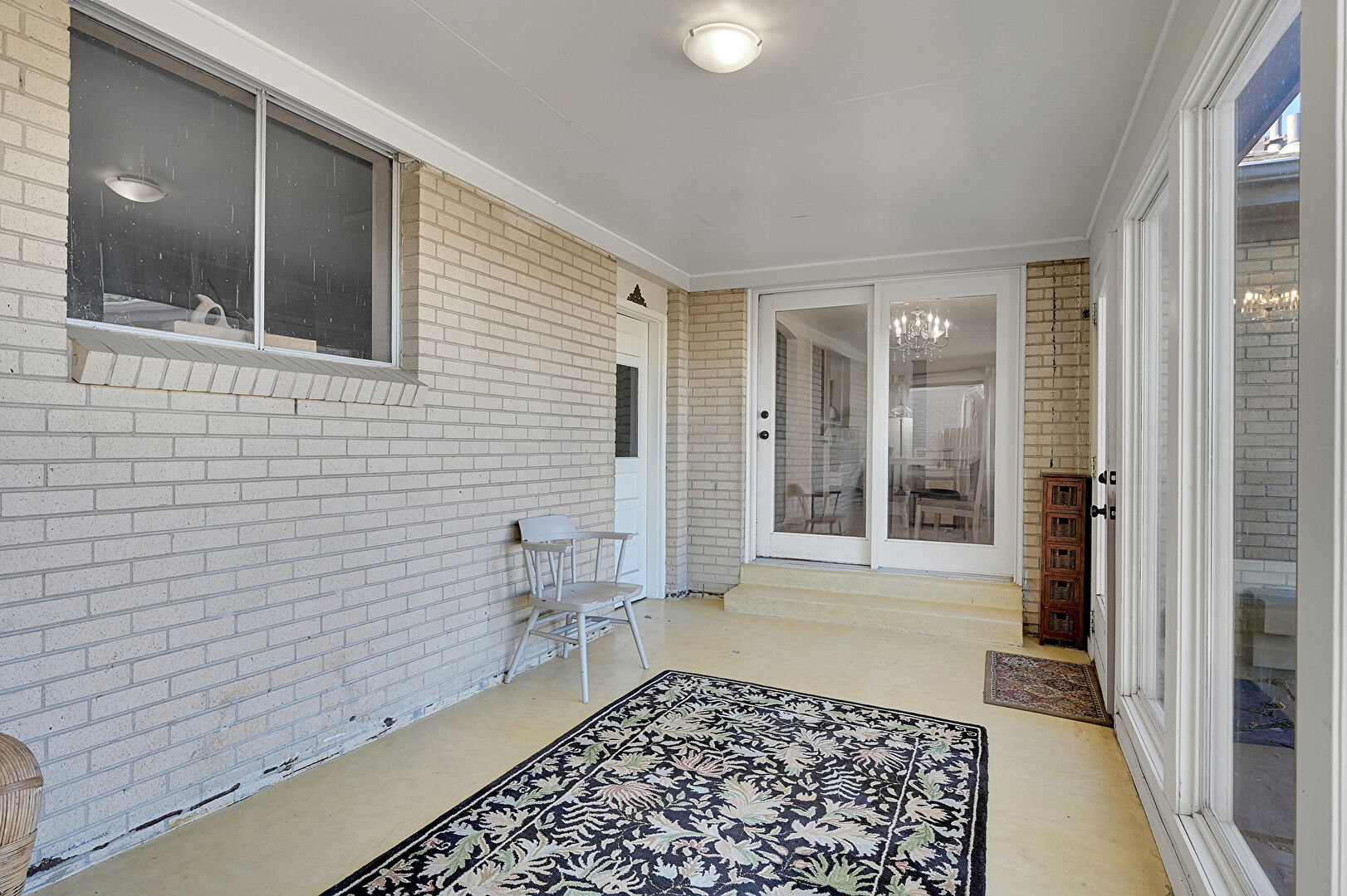 Brick Wall, Concrete Floor, Crown Molding, Natural Light, Notable Chandelier, Brick Wall, Carpet