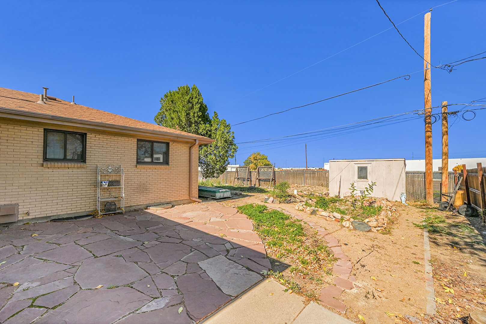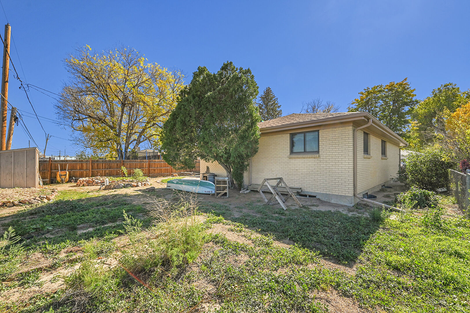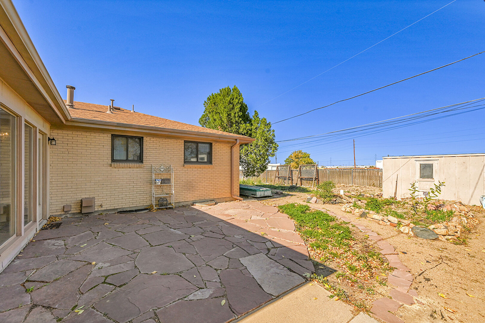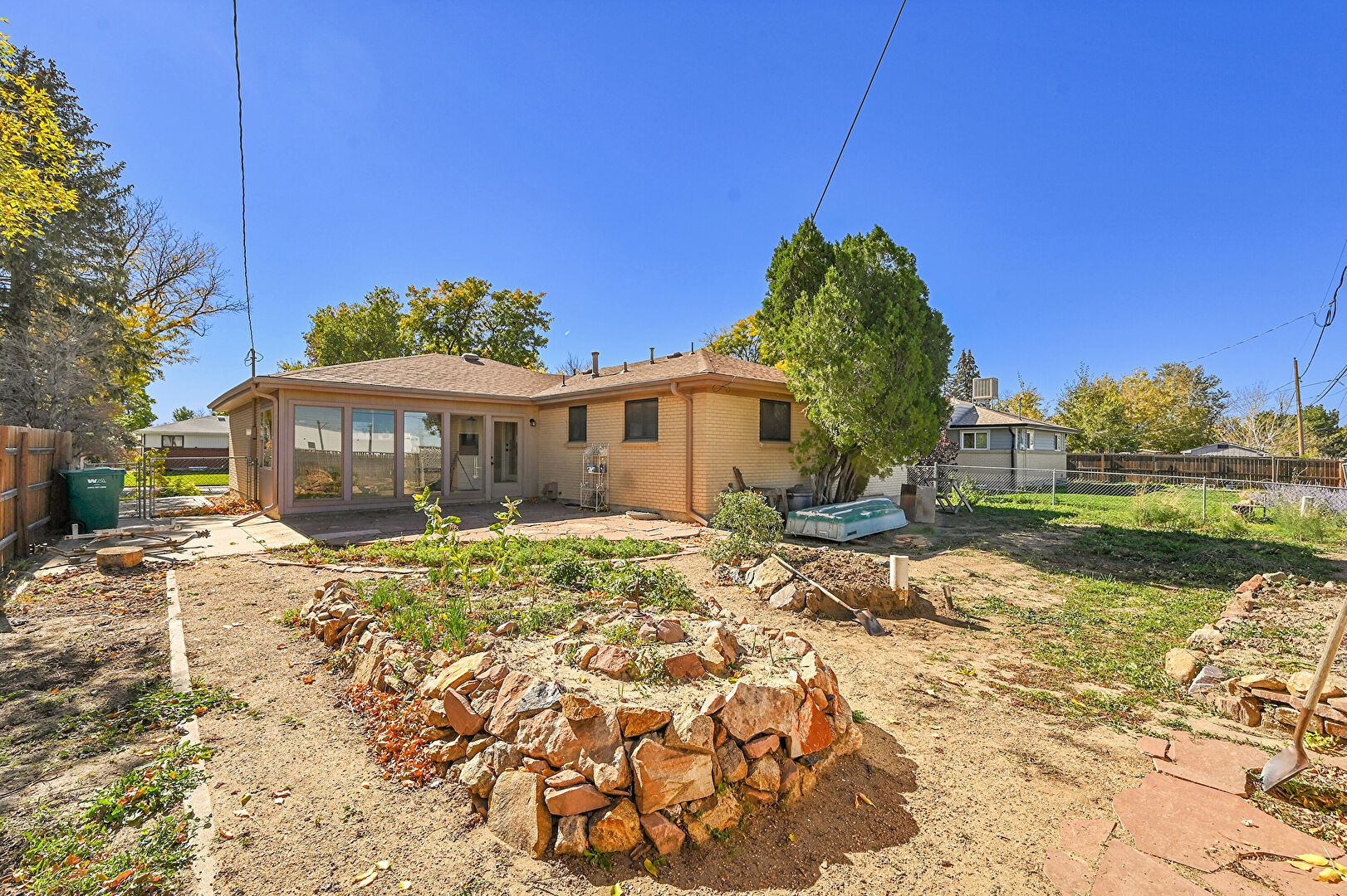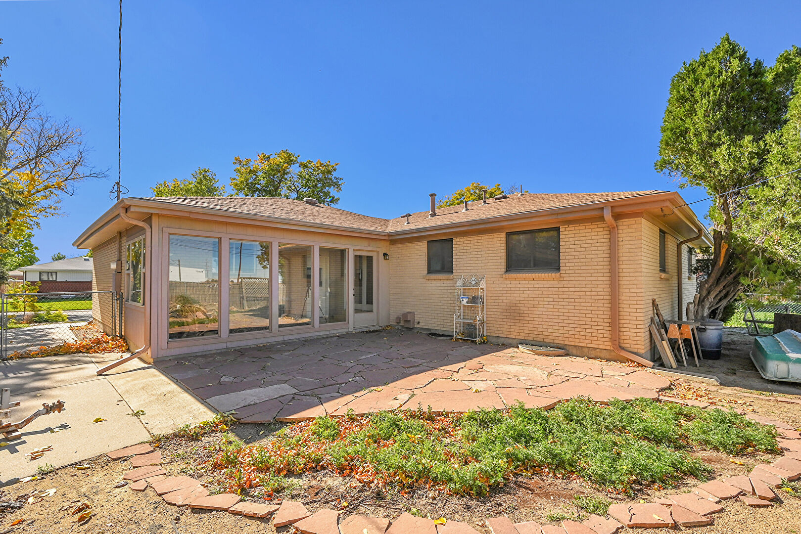 Brick Siding, Concrete Foundation, Downspout, Fence, Gutters, Lawn, Patio, Shed, Shingle Roof, Sunroom, Brick Siding, Fence, Outdoor Structure, Patio