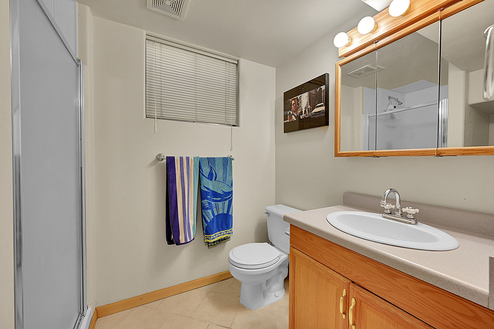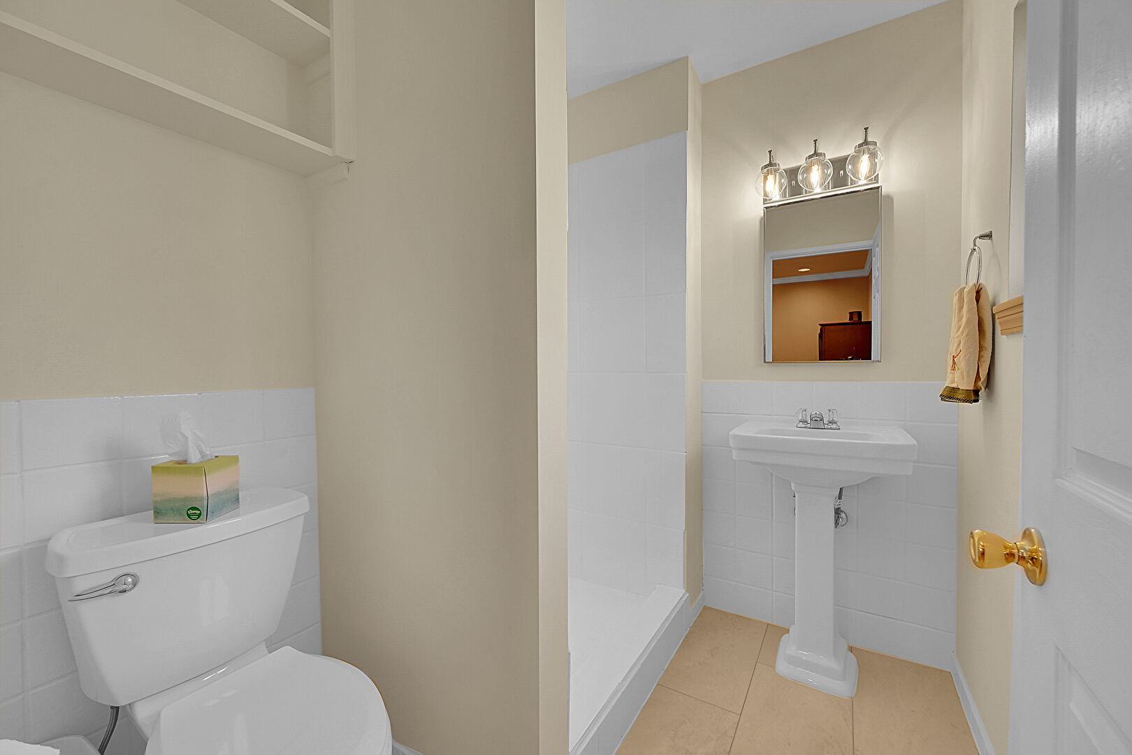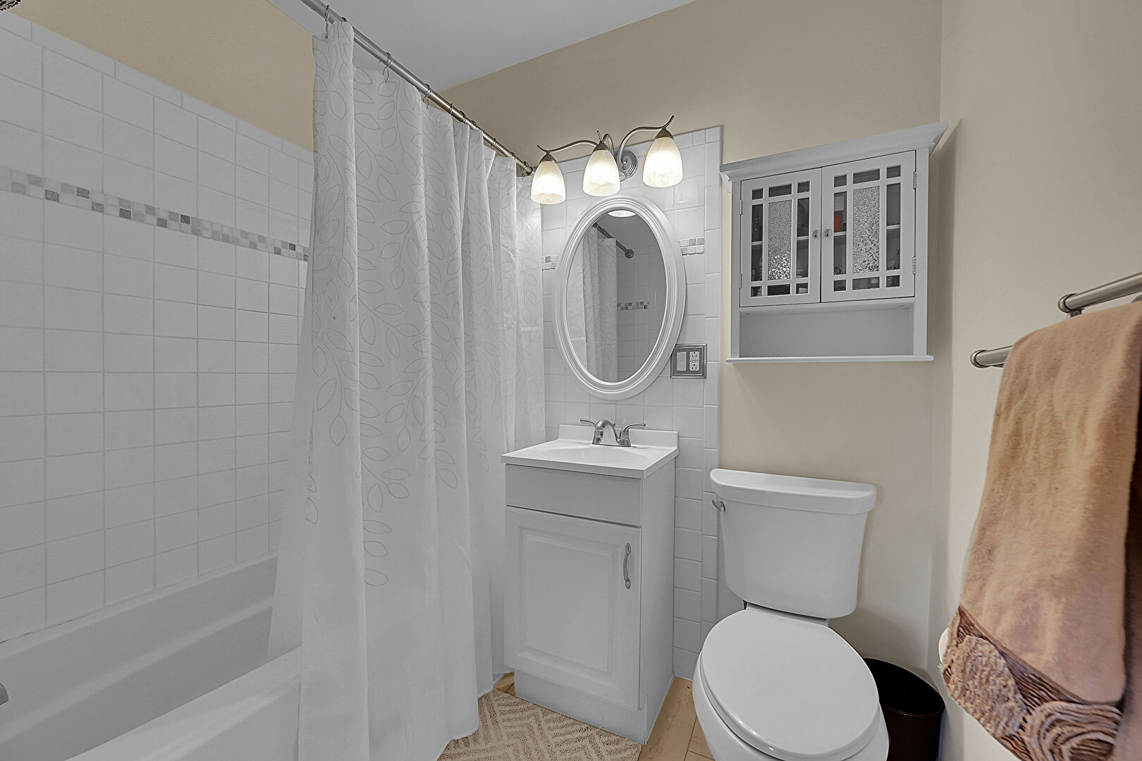 Baseboards Wall, Combined Bath Shower, Drywall, Full Bathroom, Tile Floor, Tile Wall, Vanity, Vent, Wainscot Wall, Full Bathroom, Tile Floor