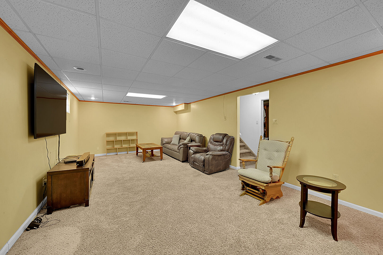 Baseboards Wall, Basement, Carpet, Crown Molding, Drywall, Natural Light, Notable Chandelier, Recessed Lighting, Vent, Wood Finish Floor, Drywall, Wood Finish Floor