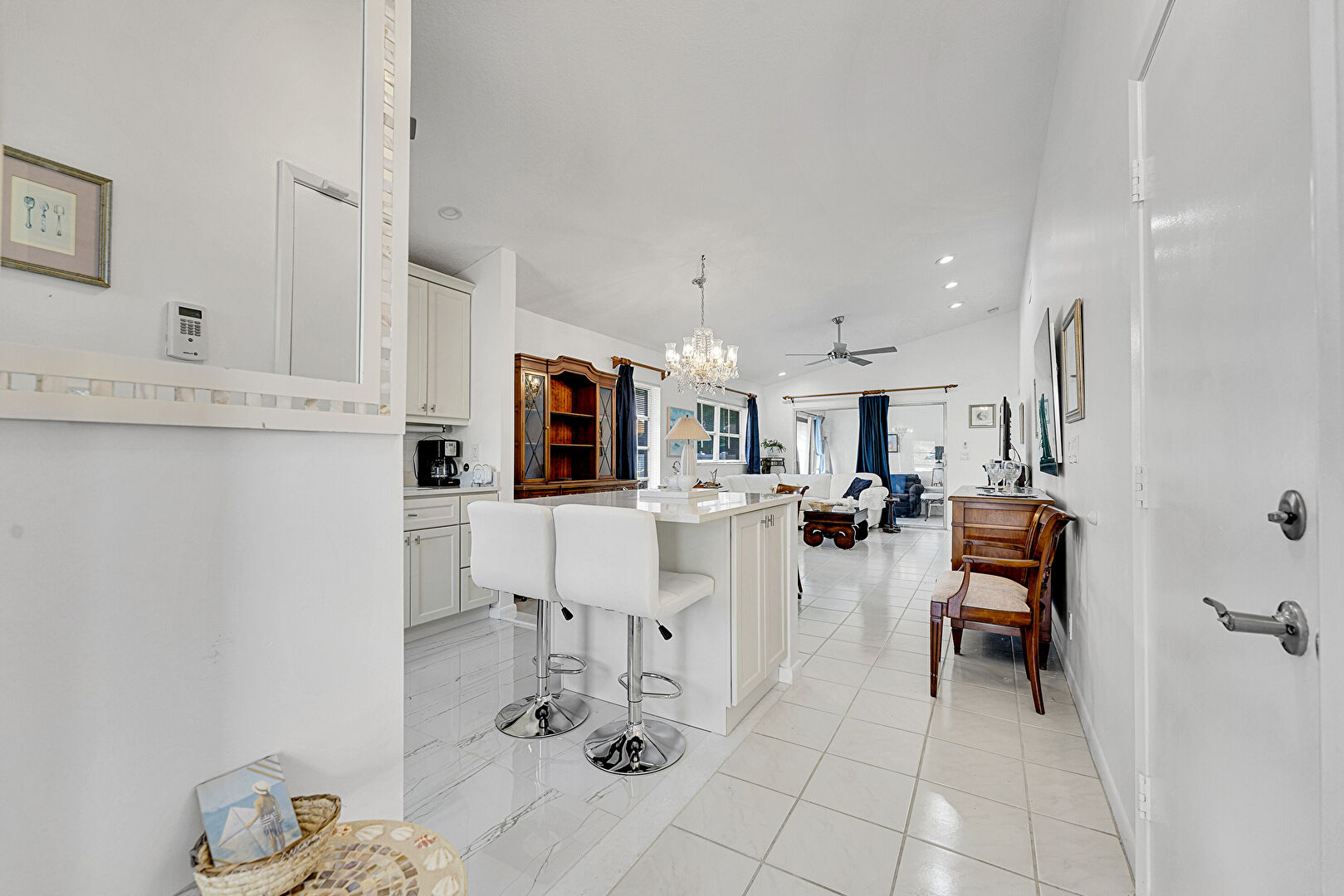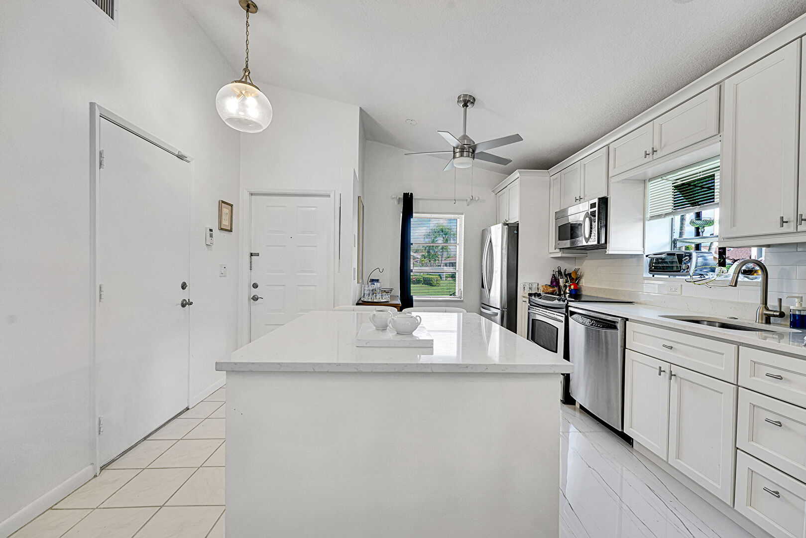 Baseboards Wall, Ceiling Fan, Crown Molding Cabinets, Drywall, Kitchen Bar, Kitchen Island, Marble Finish Floor, Natural Light, Notable Chandelier, Pendant Lighting, Recessed Lighting, Shaker Cabinets, Stone Countertops, Tile Floor, Toaster, Vaulted Ceiling, Vent, Notable Chandelier, Opens To Living Area, Pendant Lighting