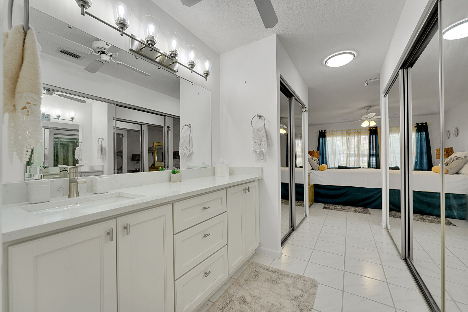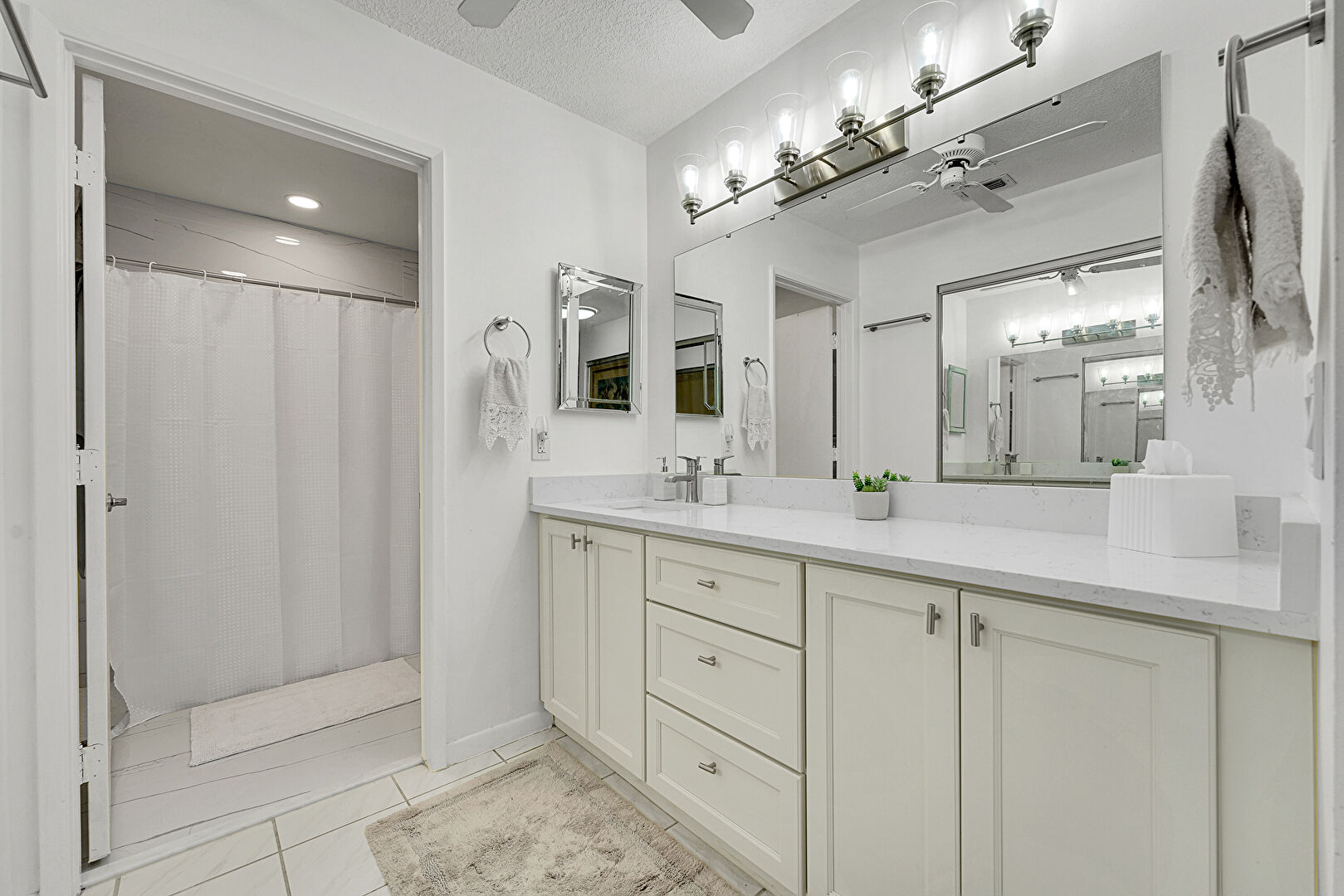 Baseboards Wall, Ceiling Fan, Double Vanity, Drywall, Ensuite Bathroom, Full Bathroom, Natural Light, Recessed Lighting, Textured Ceiling, Tile Floor, Vanity, Combined Bath Shower, Drywall, Vent