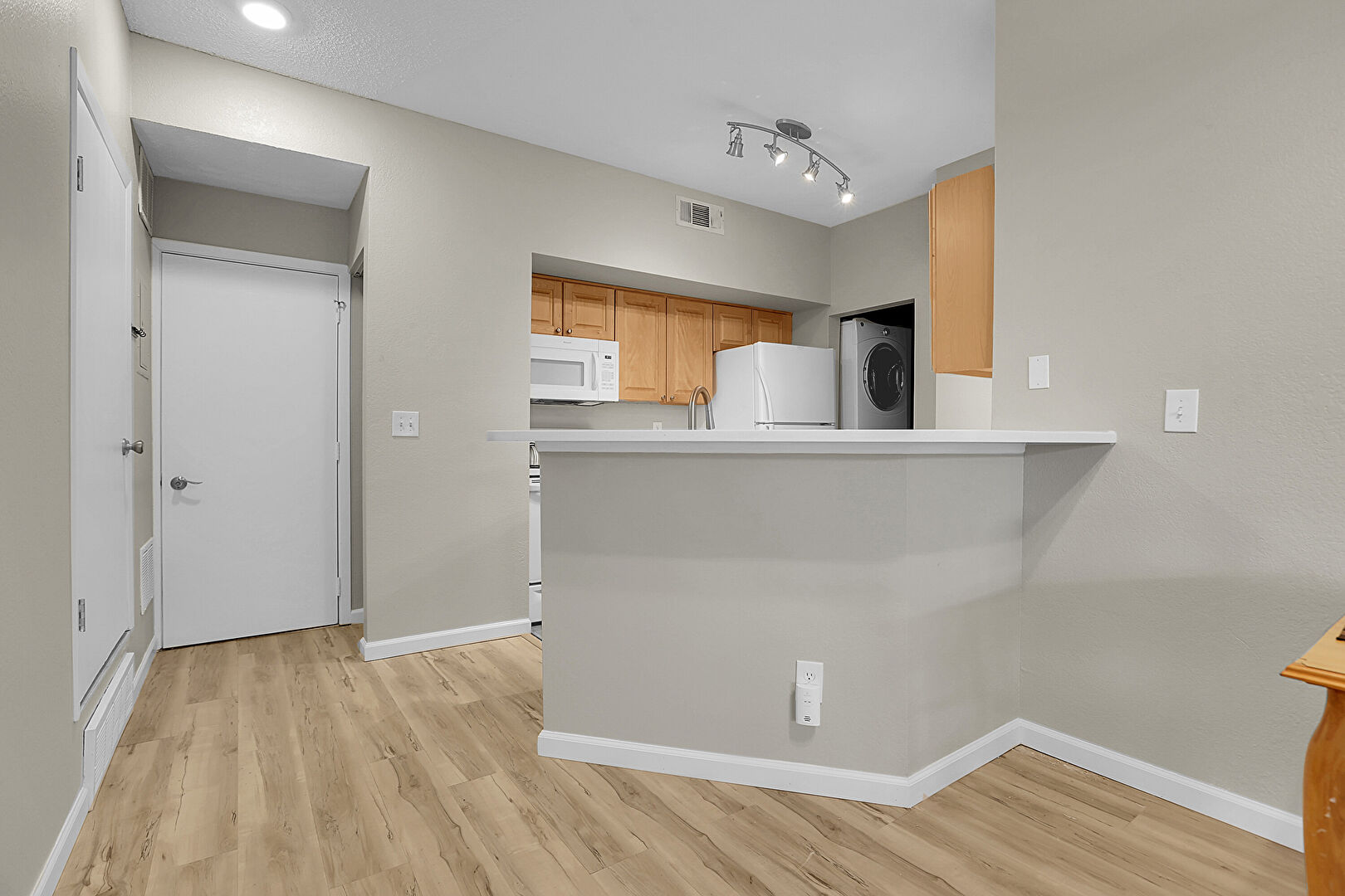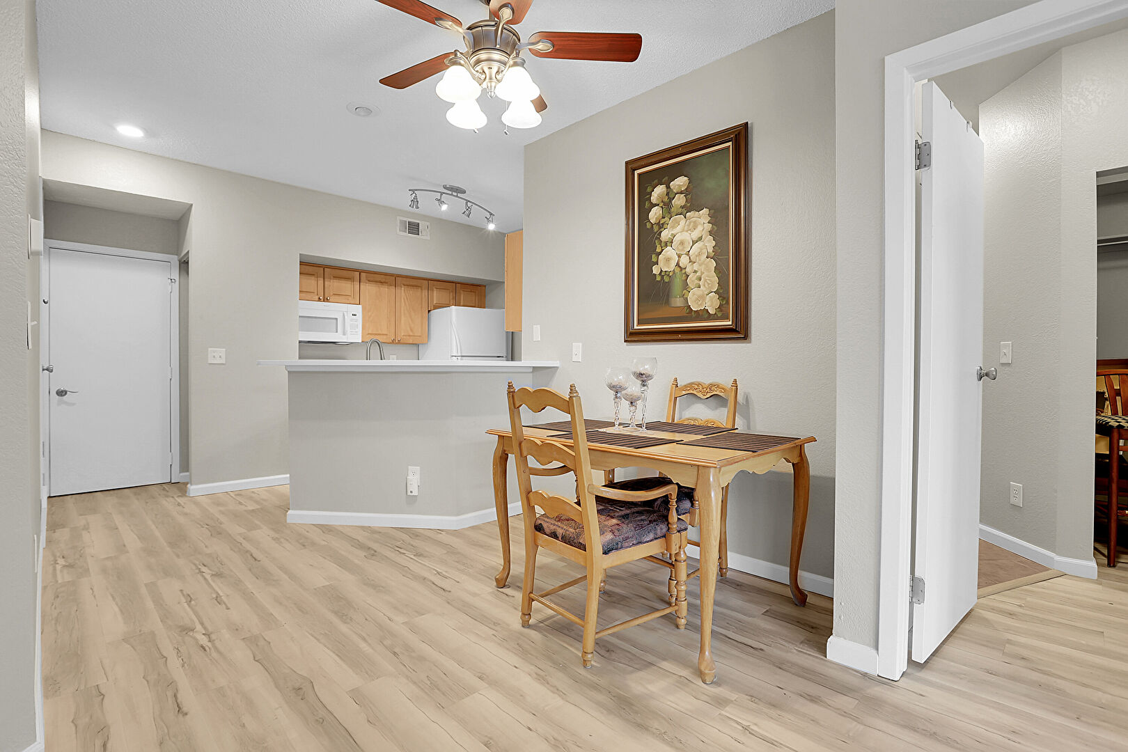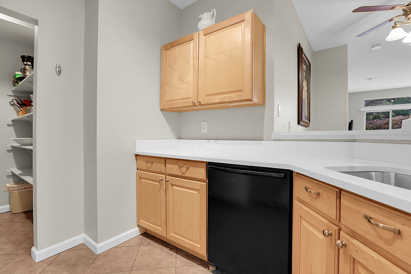 Baseboards Wall, Ceiling Fan, Drywall, Kitchen Peninsula, Laundry, Natural Light, Open Shelves, Raised Cabinets, Recessed Lighting, Stone Countertops, Tile Floor, Vent, Wood Finish Floor, Baseboards Wall, Laundry, Raised Cabinets, Stone Countertops