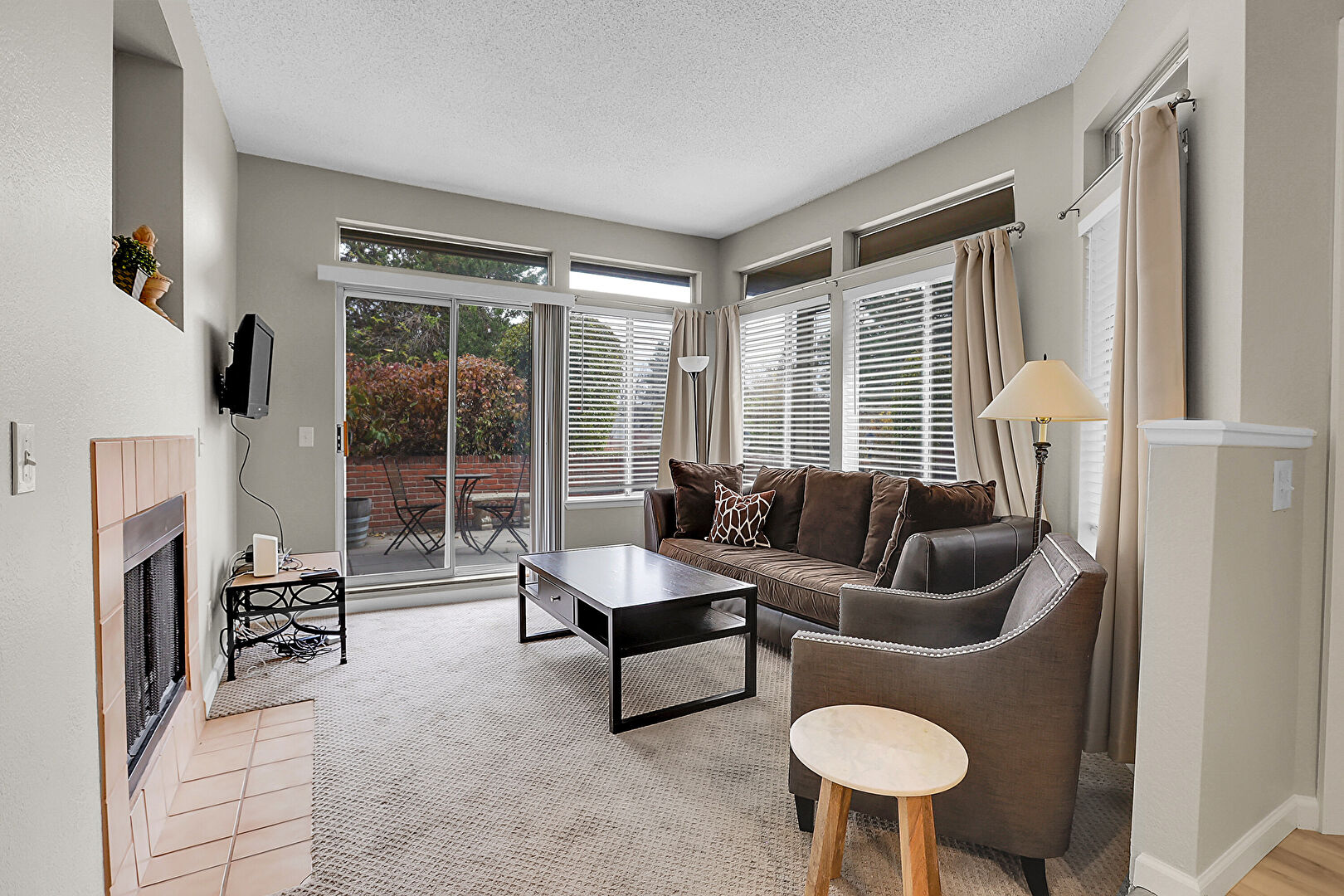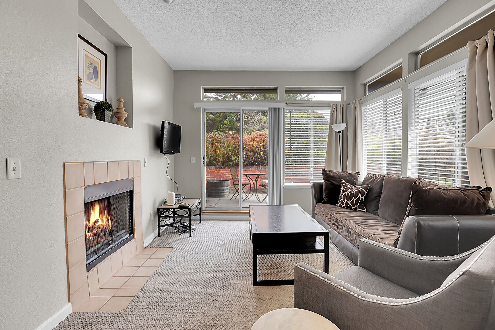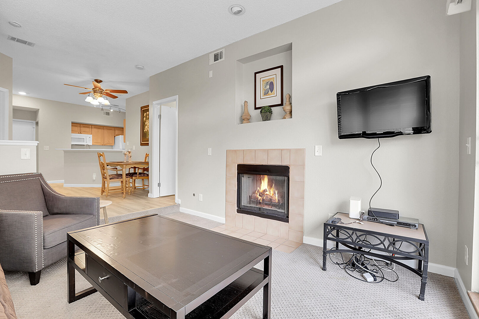 Baseboards Wall, Carpet, Ceiling Fan, Drywall, Fireplace, Natural Light, Recessed Lighting, Textured Ceiling, Tile Floor, Vent, Carpet, Drywall, Textured Ceiling, Textured Wall
