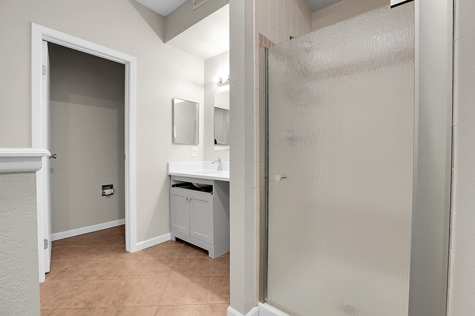 Baseboards Wall, Drywall, Full Bathroom, Textured Wall, Tile Floor, Vanity, Vent, Baseboards Wall, Textured Wall, Tile Floor, Vanity