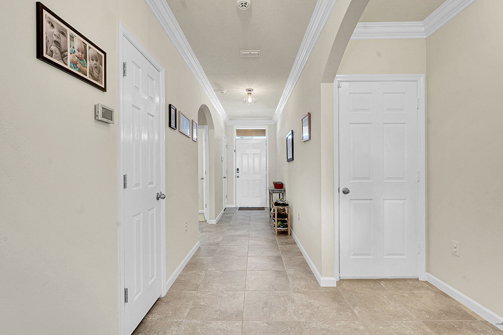 Baseboards Wall, Crown Molding, Drywall, Tile Floor, Vent, Arched Walkways
