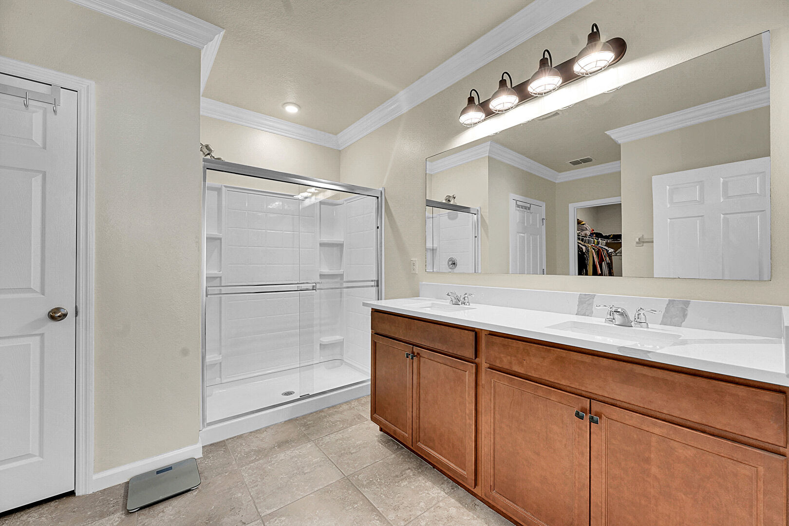Baseboards Wall, Crown Molding, Drywall, Full Bathroom, Recessed Lighting, Tile Floor, Vent, Walk In Closet, Double Vanity