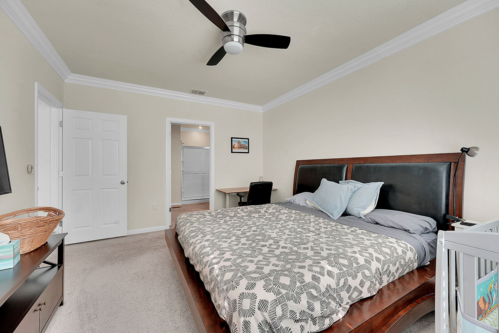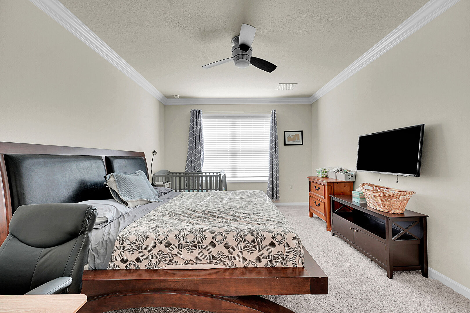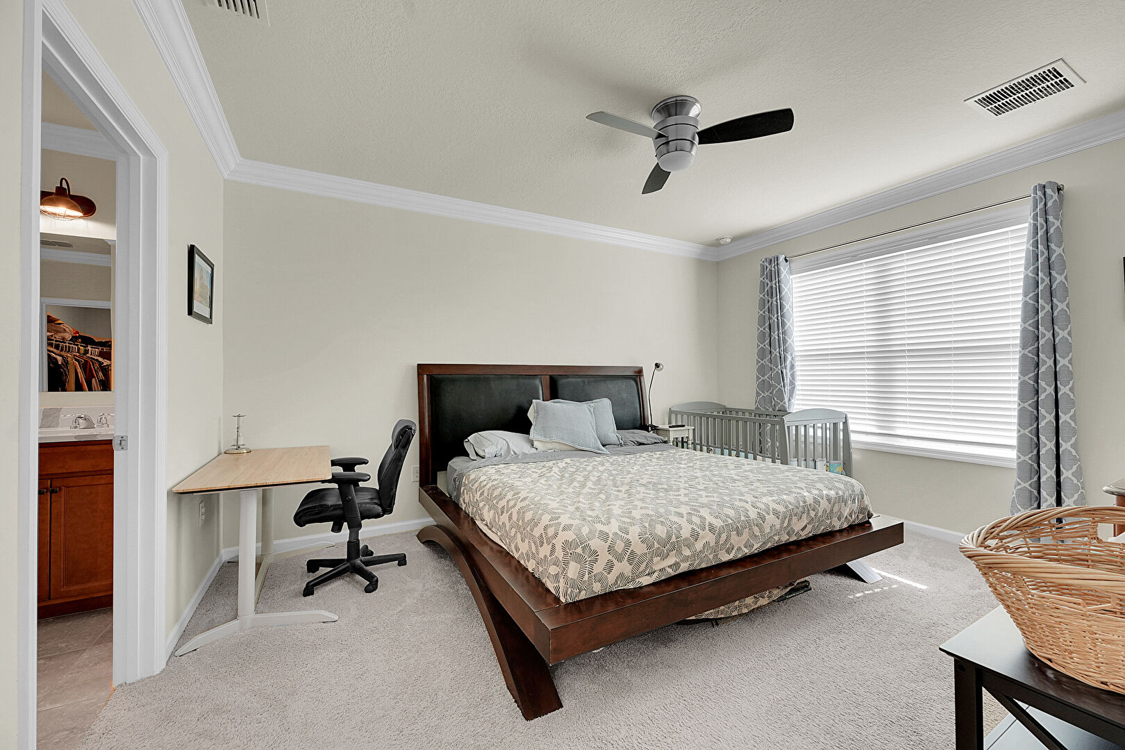 Baseboards Wall, Carpet, Ceiling Fan, Crown Molding, Drywall, Ensuite Bathroom, Natural Light, Textured Ceiling, Vent, Carpet, Drywall, Natural Light
