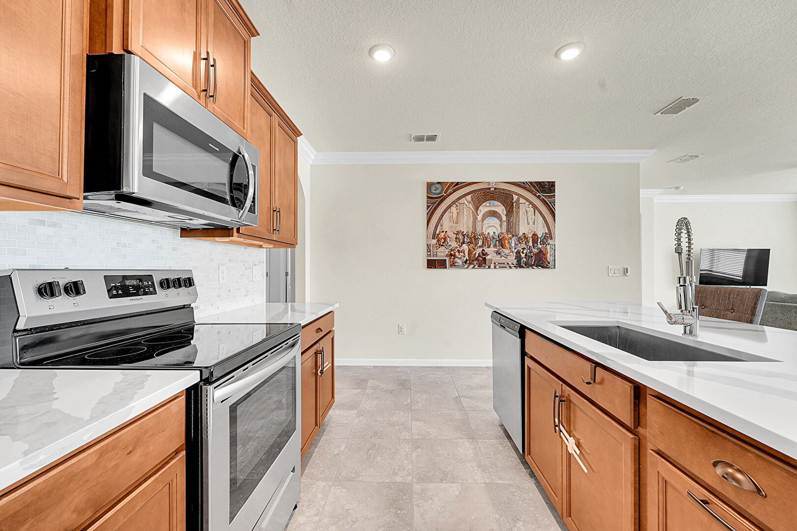 Arched Walkways, Baseboards Wall, Ceiling Fan, Crown Molding, Crown Molding Cabinets, Drywall, Kitchen Bar, Kitchen Island, L Shaped Kitchen, Medium Brown Cabinets, Natural Light, Opens To Living Area, Pendant Lighting, Recessed Lighting, Shaker Cabinets, Stone Countertops, Textured Ceiling, Tile Floor, Vent, Crown Molding, Crown Molding Cabinets, Recessed Lighting