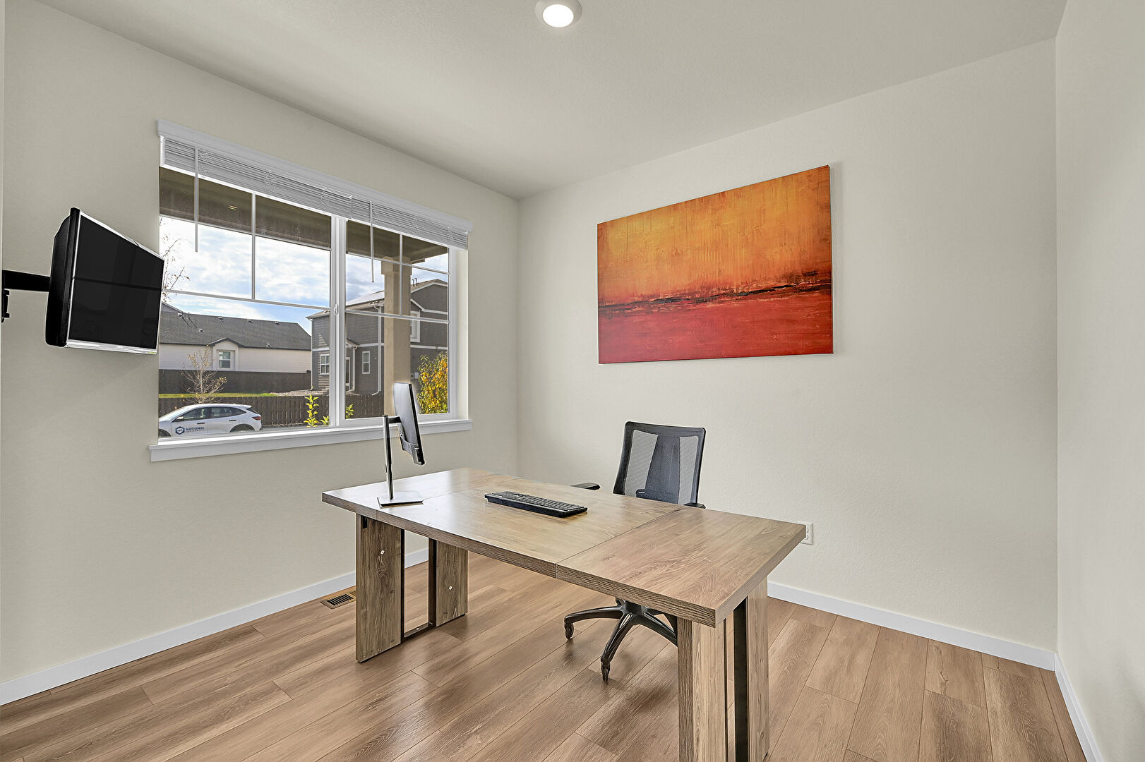 Baseboards Wall, Drywall, Natural Light, Office Area, Recessed Lighting, Vent, Wood Finish Floor, Drywall, Vent