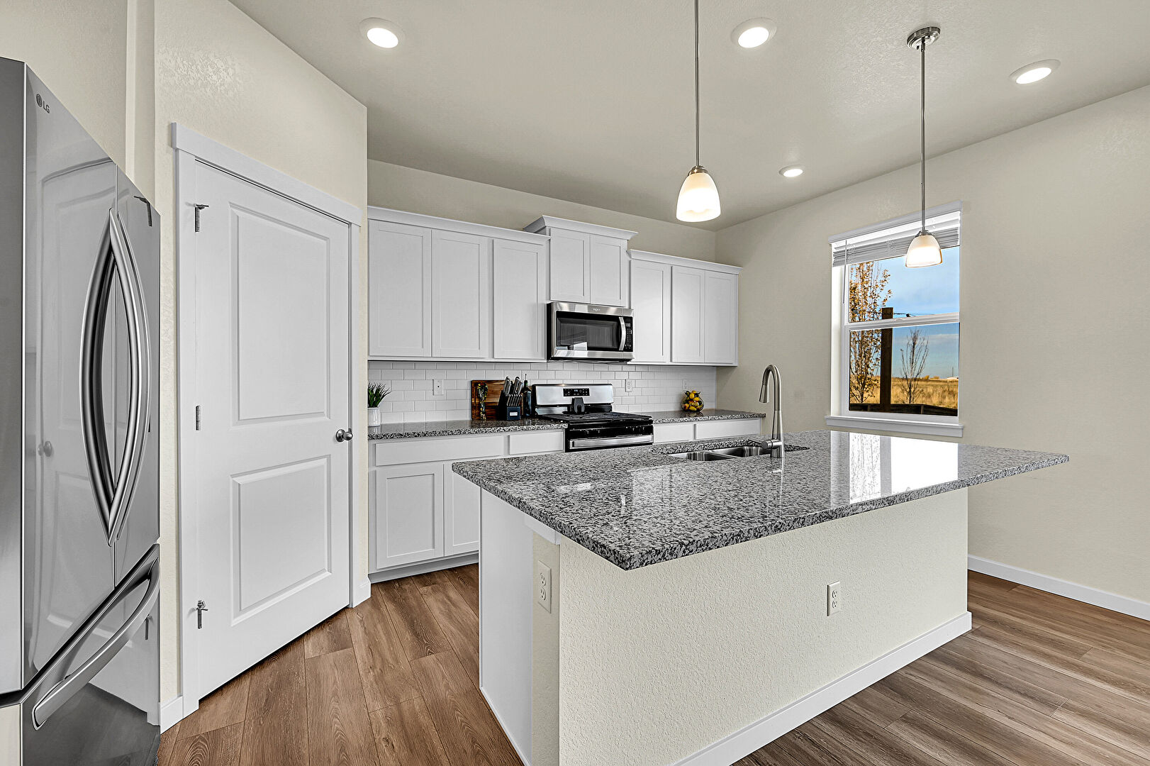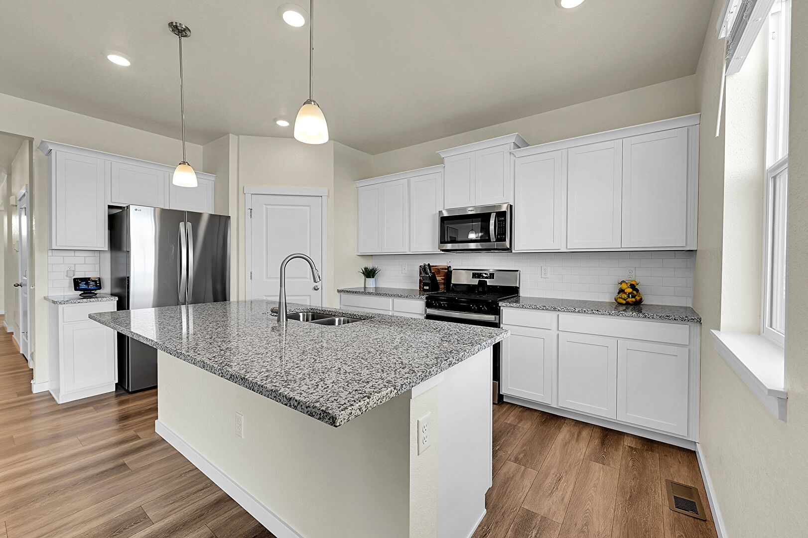 Baseboards Wall, Crown Molding Cabinets, Drywall, Kitchen Bar, Kitchen Island, L Shaped Kitchen, Natural Light, Notable Chandelier, Opens To Living Area, Pendant Lighting, Recessed Lighting, Shaker Cabinets, Stone Countertops, Vent, Wood Finish Floor, Notable Chandelier, Shaker Cabinets, Wood Finish Floor