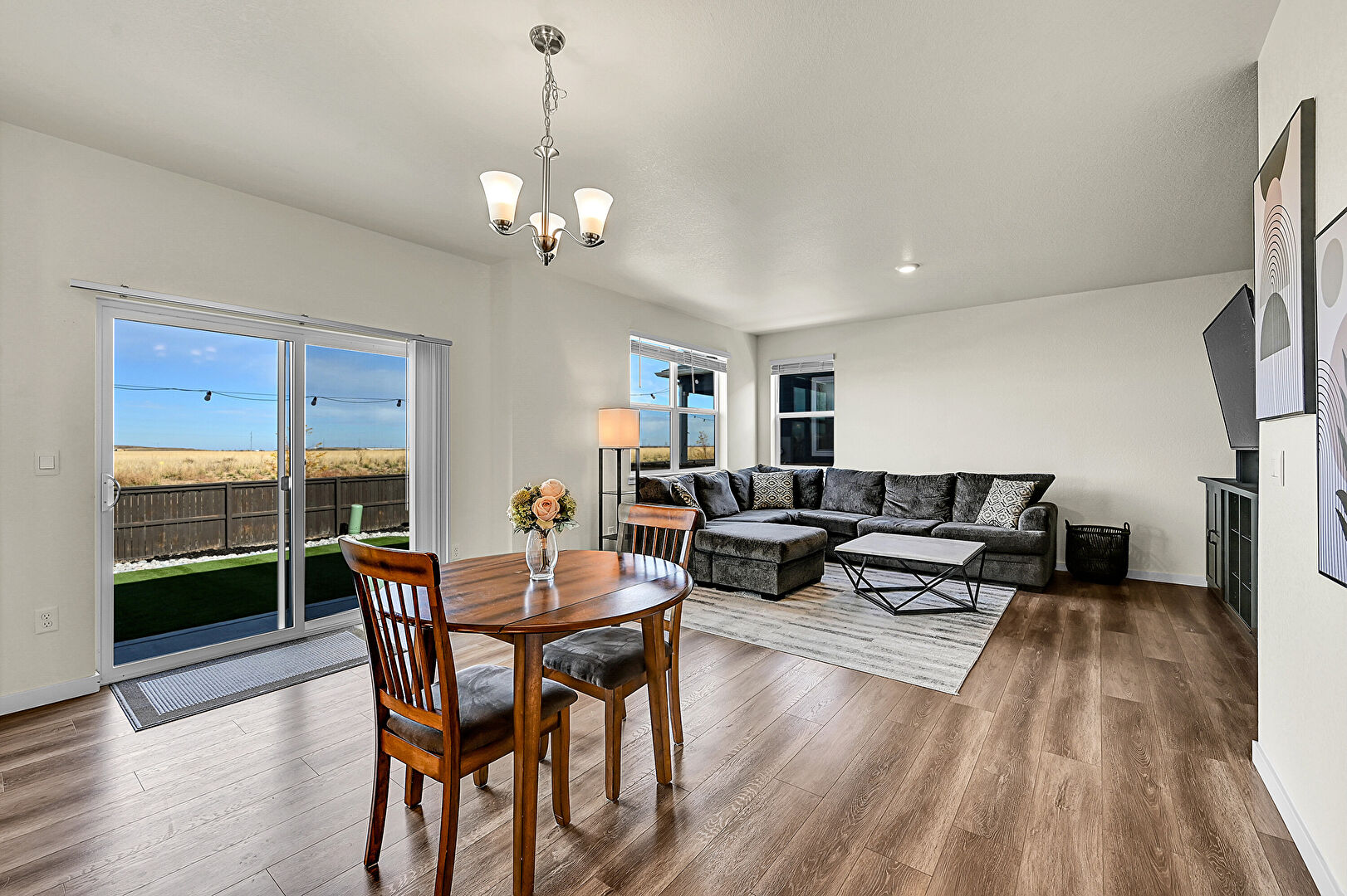 Baseboards Wall, Drywall, L Shaped Kitchen, Natural Light, Notable Chandelier, Recessed Lighting, Wood Finish Floor, Baseboards Wall, Natural Light