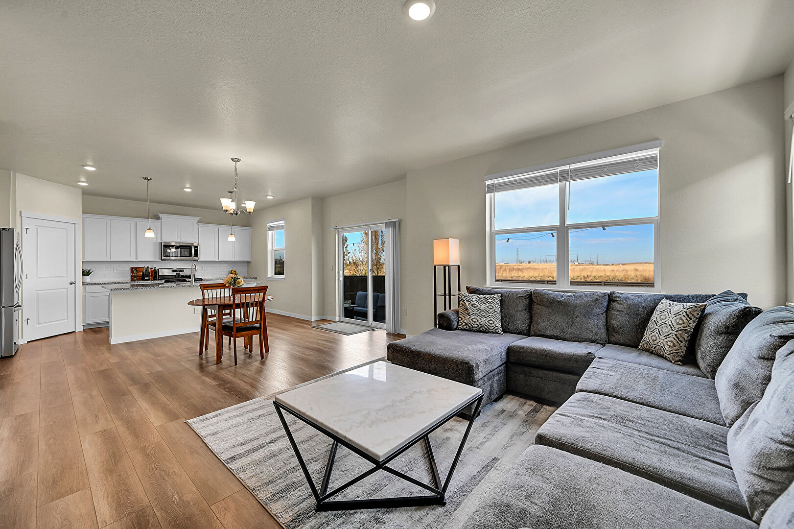 Baseboards Wall, Carpet, Drywall, L Shaped Kitchen, Natural Light, Notable Chandelier, Recessed Lighting, Vent, Wood Finish Floor, Carpet, Natural Light, Recessed Lighting, Wood Finish Floor