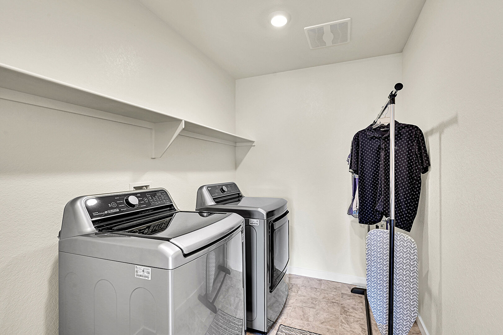 Baseboards Wall, Drywall, Laundry, Recessed Lighting, Tile Floor, Vent, Washer Hookup