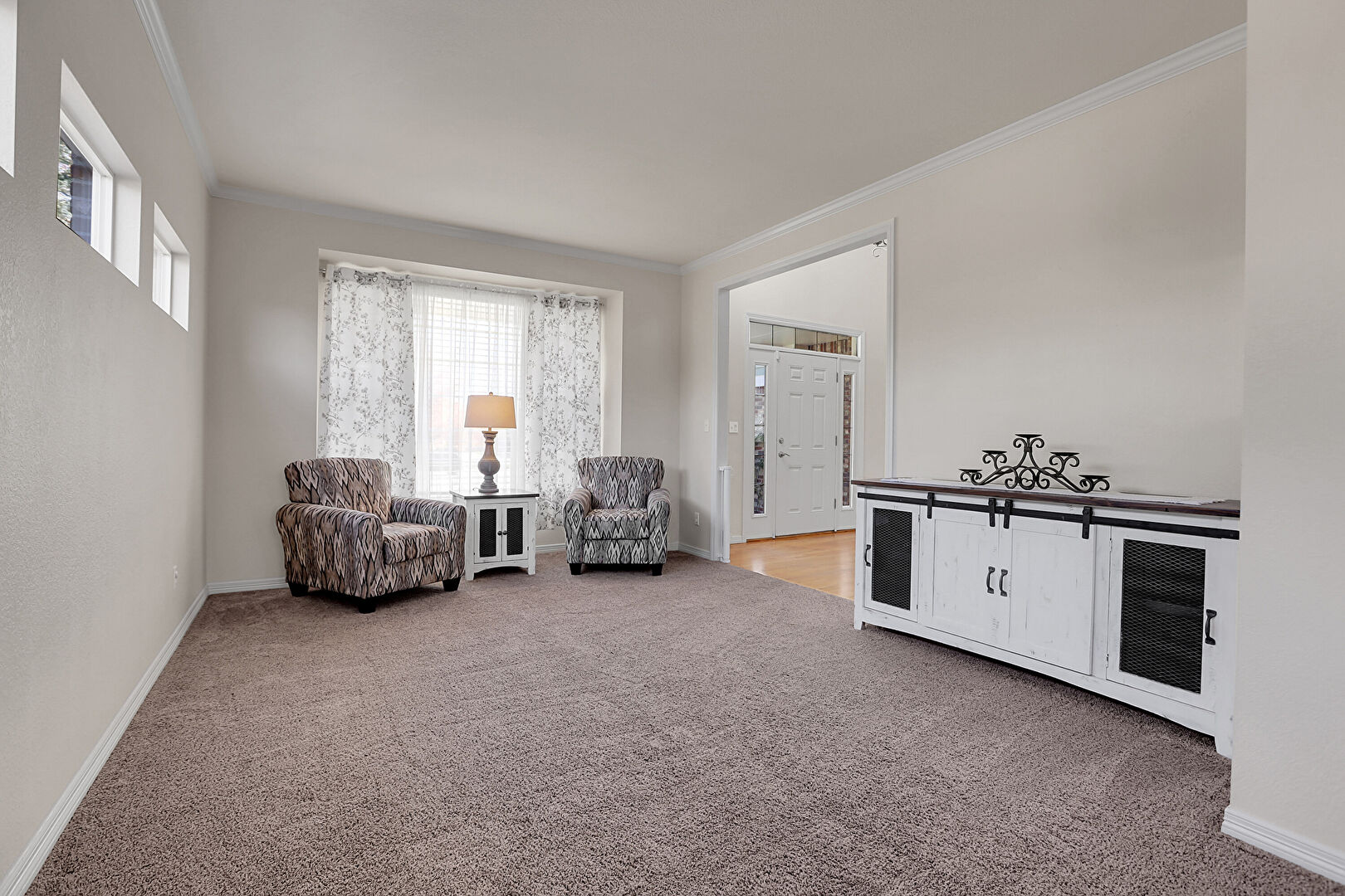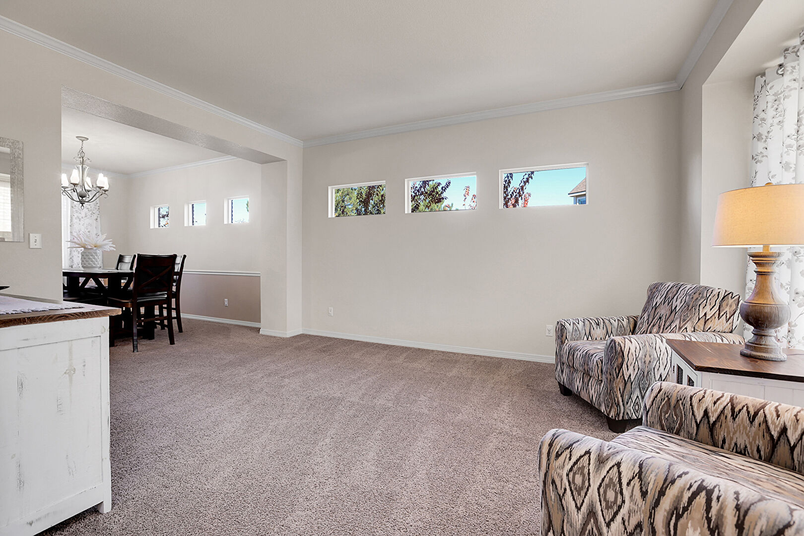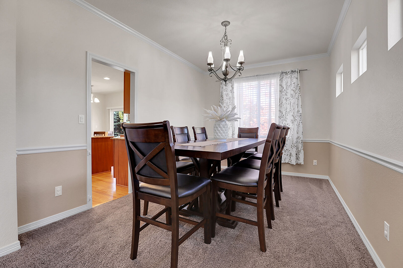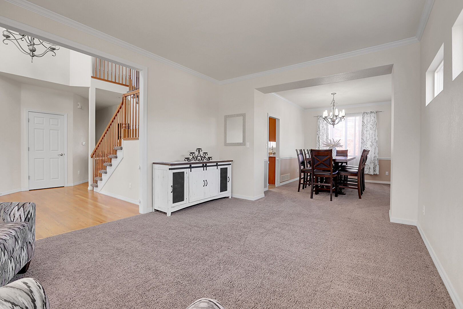 Baseboards Wall, Carpet, Crown Molding, Drywall, Natural Light, Notable Chandelier