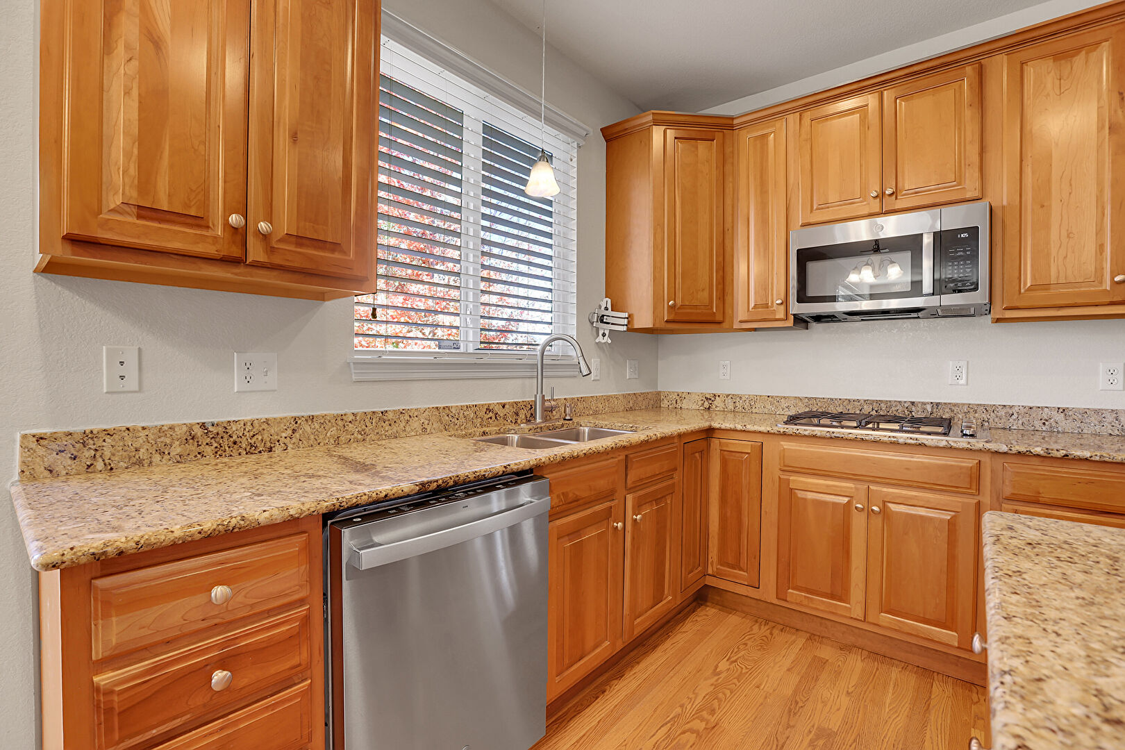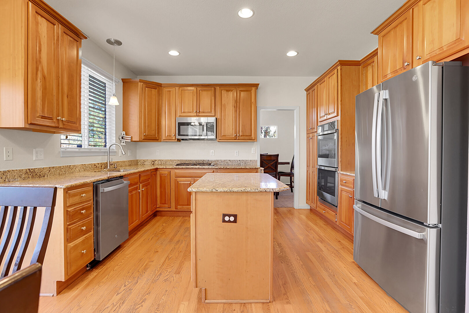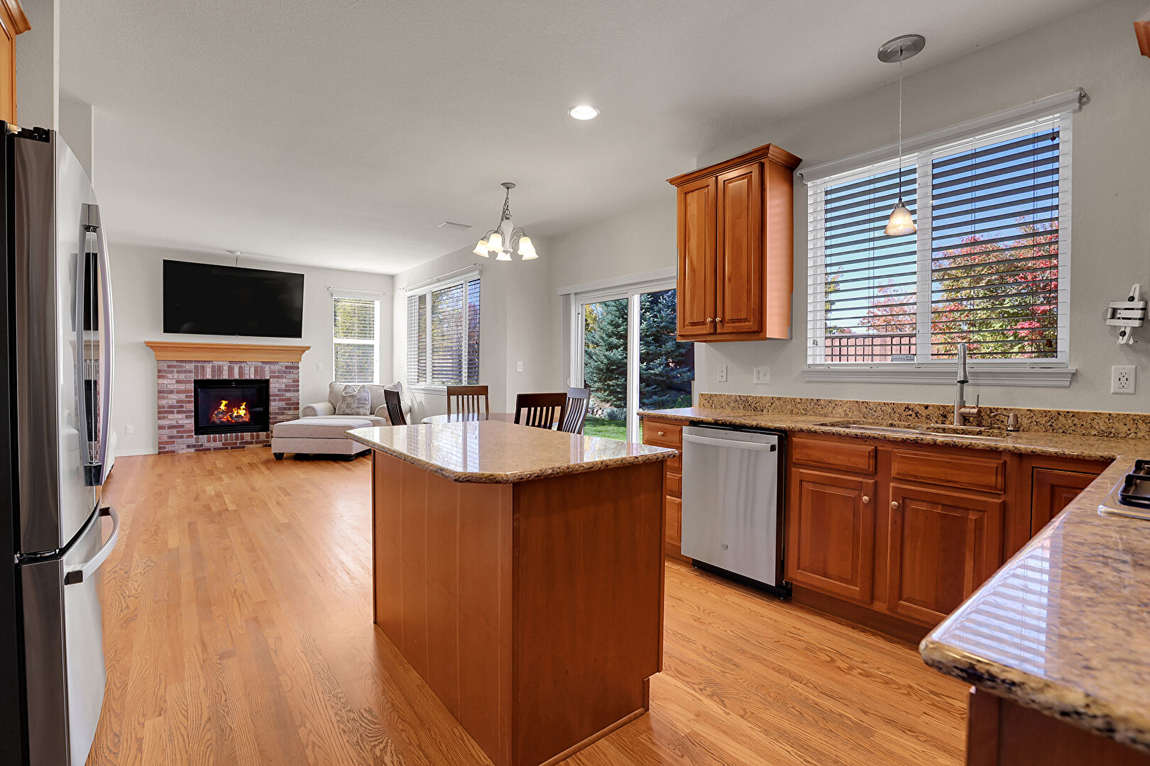 Baseboards Wall, Crown Molding Cabinets, Double Oven, Drywall, Fireplace, Kitchen Island, Medium Brown Cabinets, Natural Light, Notable Chandelier, Opens To Living Area, Pendant Lighting, Raised Cabinets, Recessed Lighting, Stone Countertops, U Shaped Kitchen, Vent, Washer Dryer, Wood Finish Floor, Crown Molding Cabinets, Medium Brown Cabinets, Pendant Lighting, Raised Cabinets