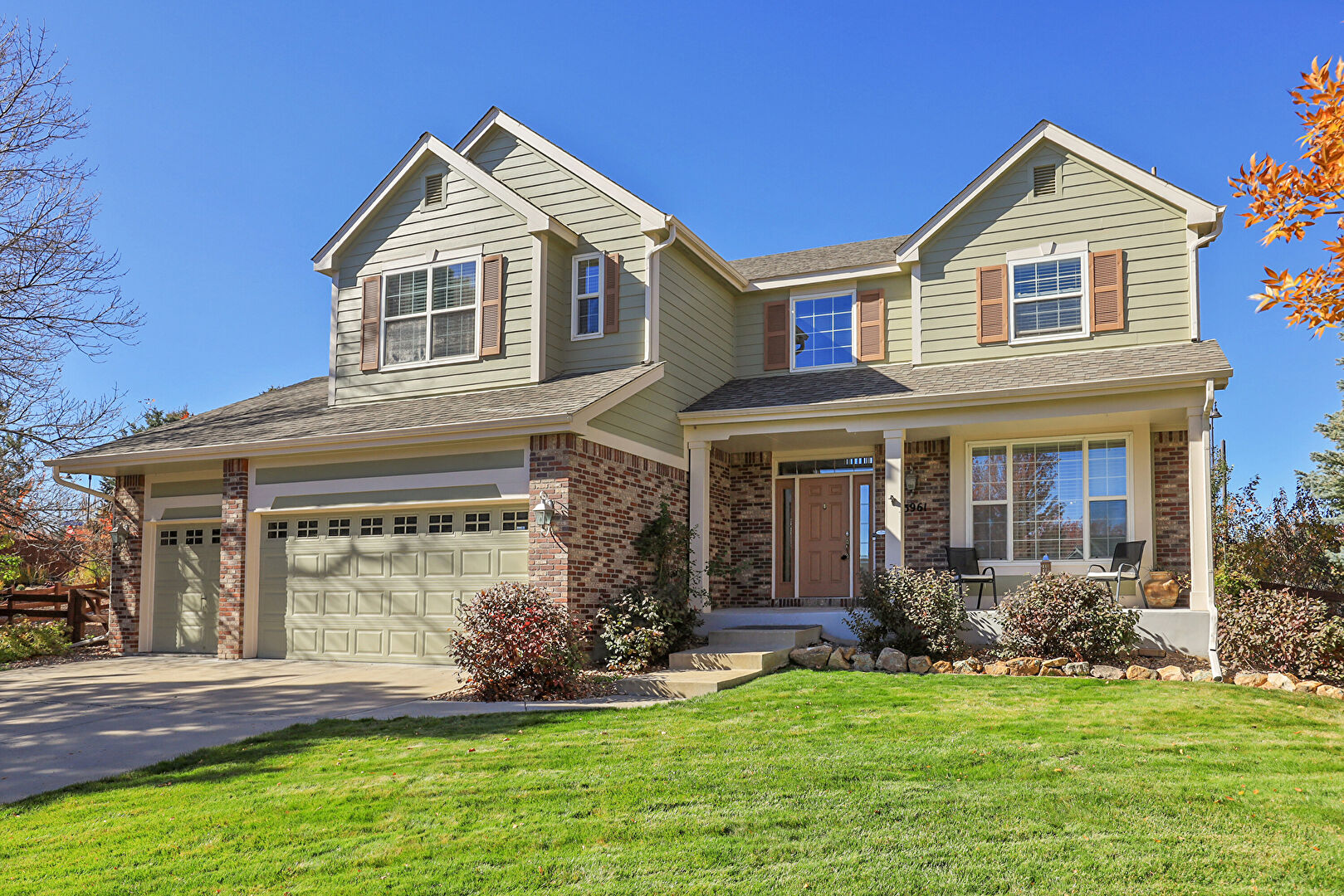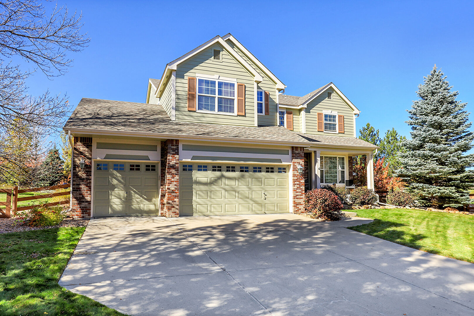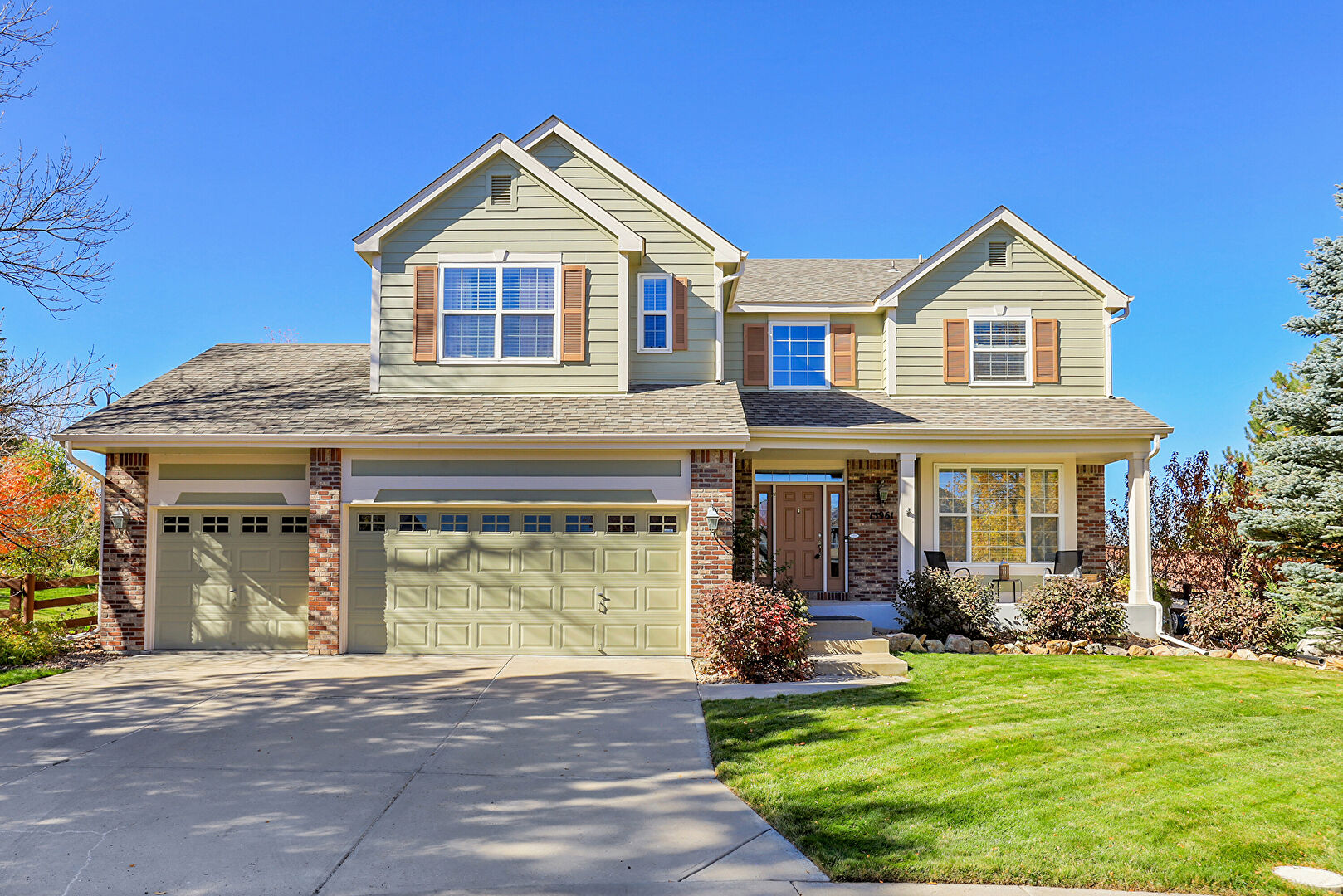 Brick Siding, Built In Garage, Downspout, Driveway, Fence, Gutters, Horizontal Siding, Lawn, Porch, Shingle Roof, Stone Siding, Brick Siding, Horizontal Siding, Lawn, Water Meter
