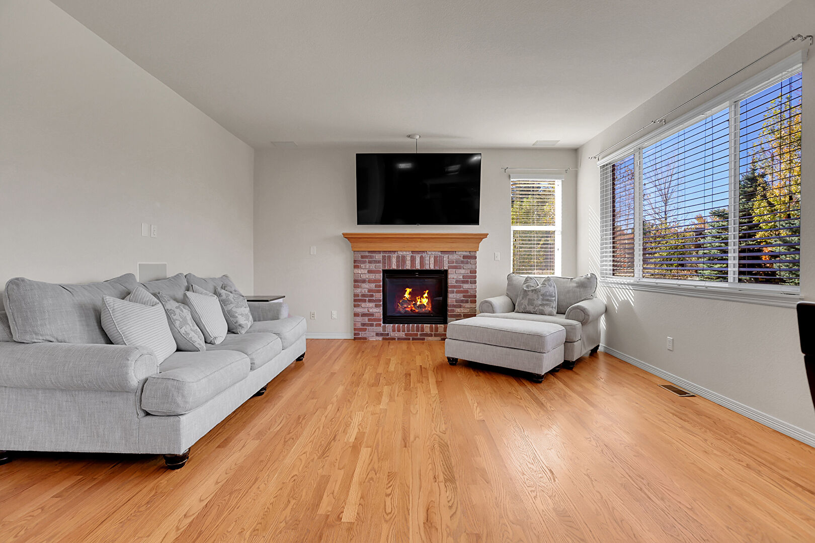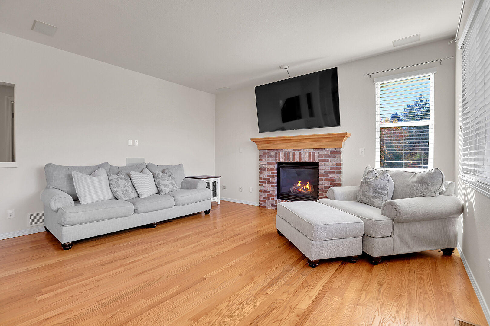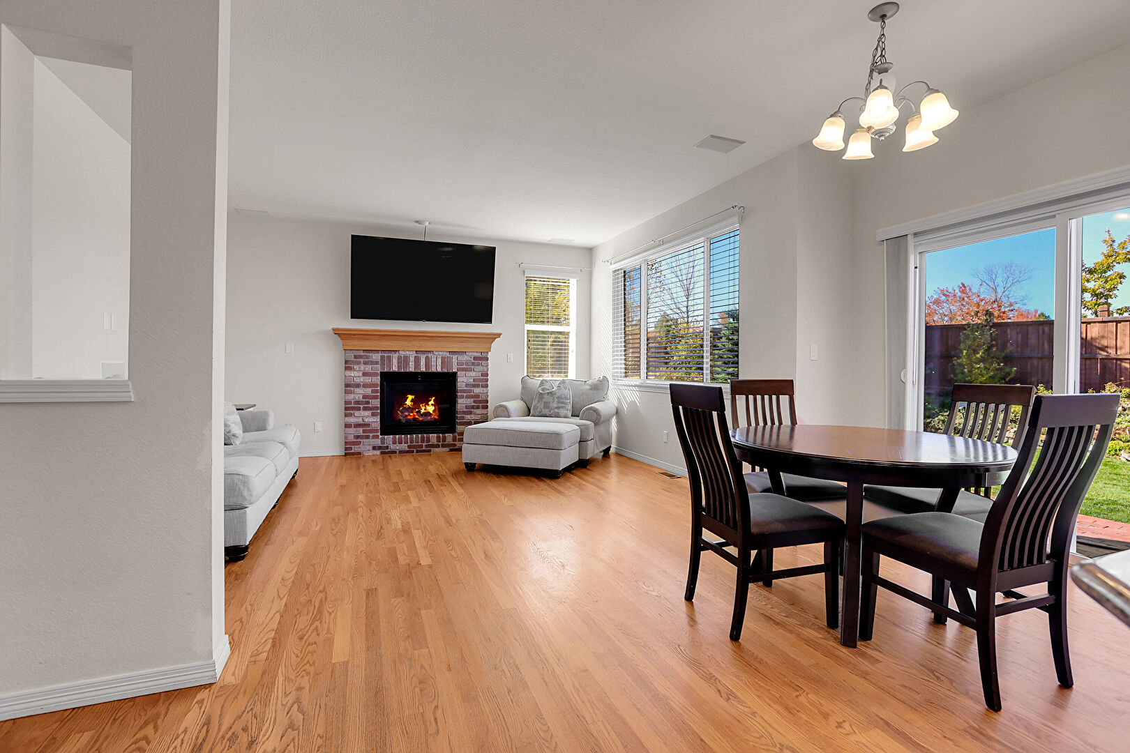 Baseboards Wall, Drywall, Fireplace, L Shaped Kitchen, Natural Light, Notable Chandelier, Recessed Lighting, Vent, Wood Finish Floor, Drywall, Natural Light, Wood Finish Floor