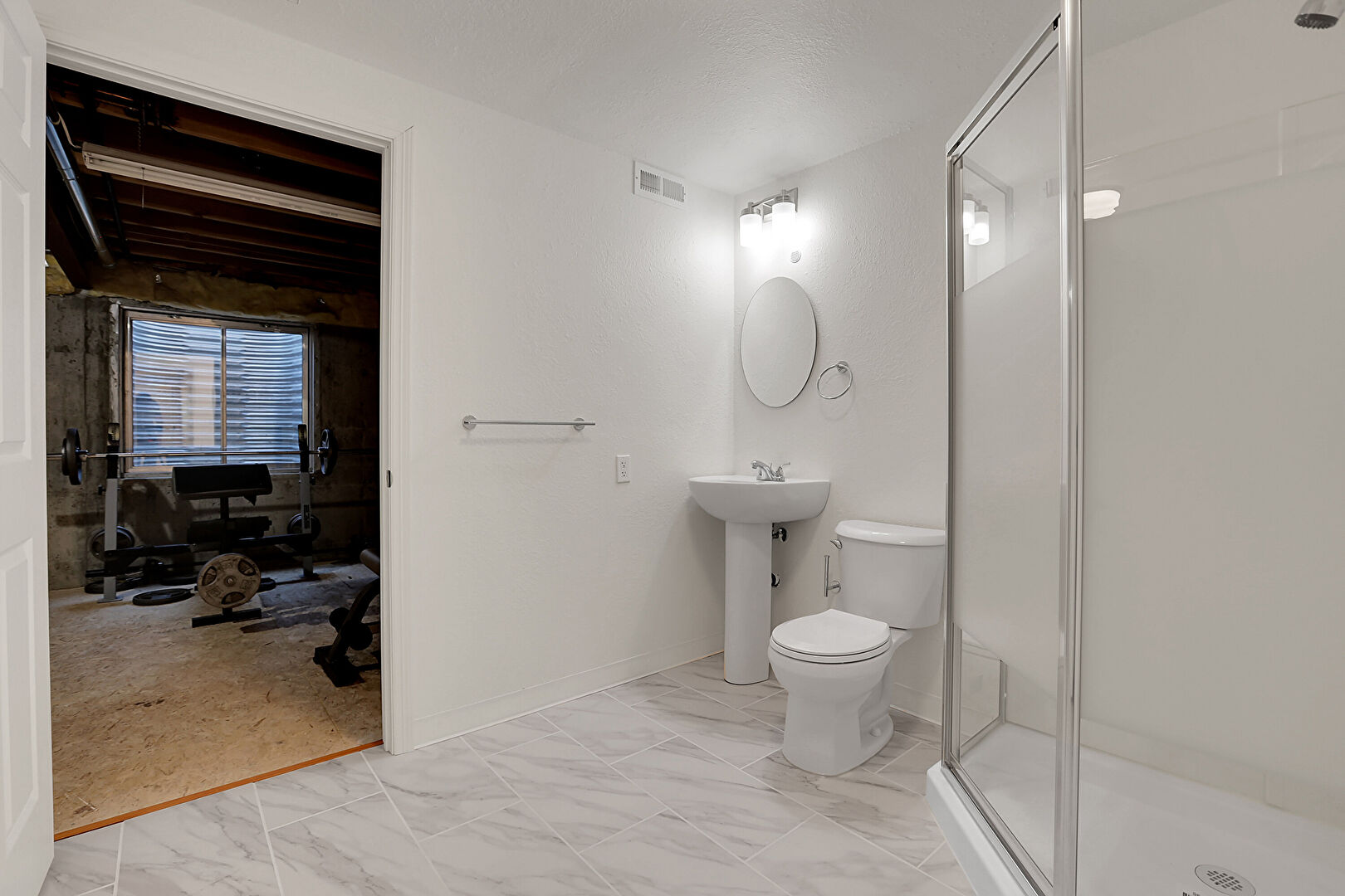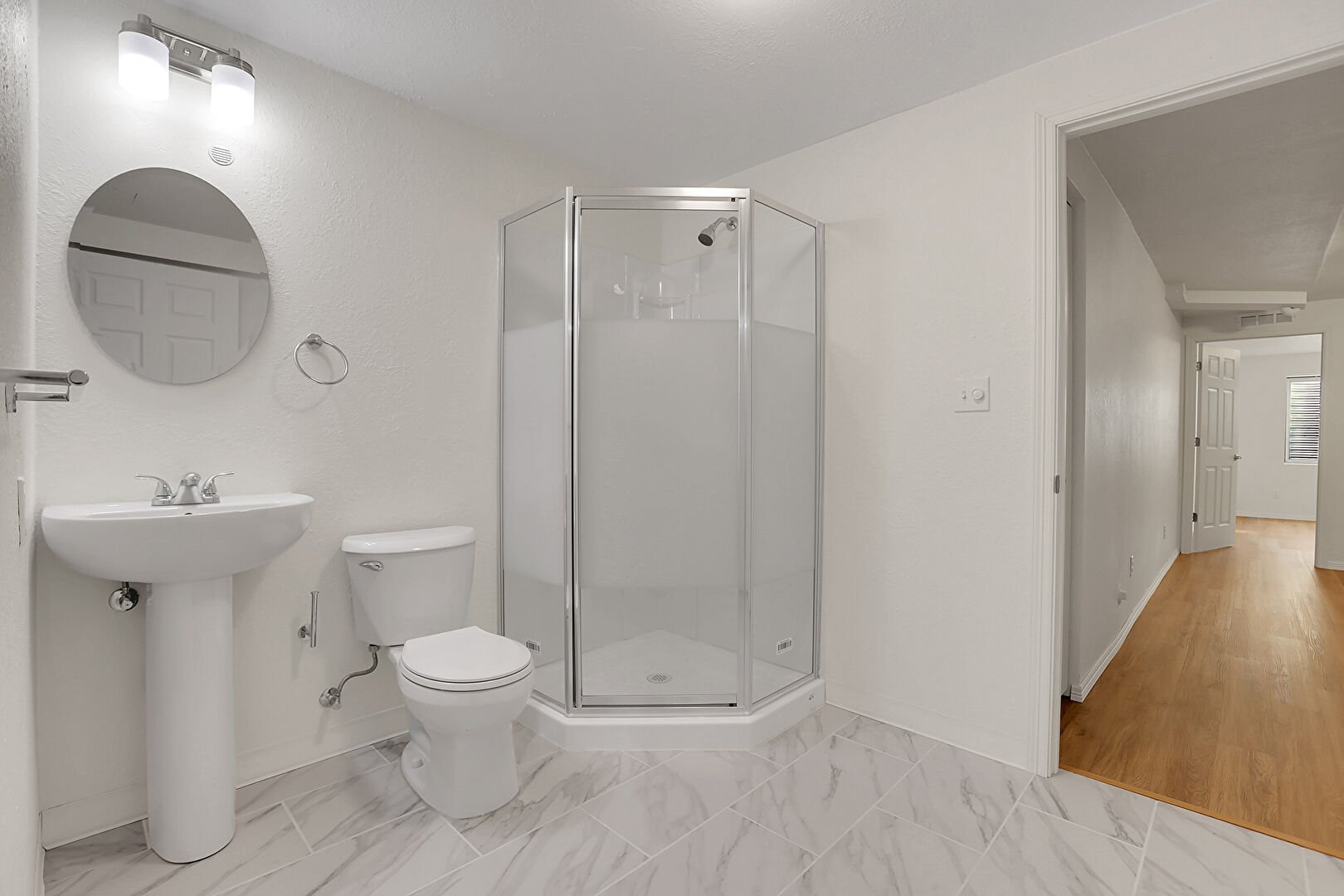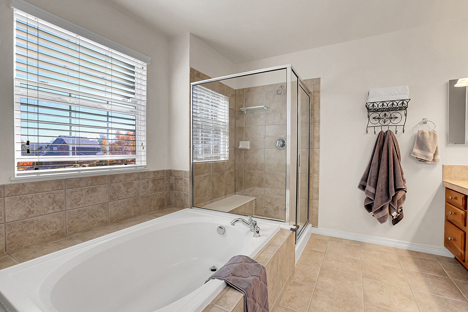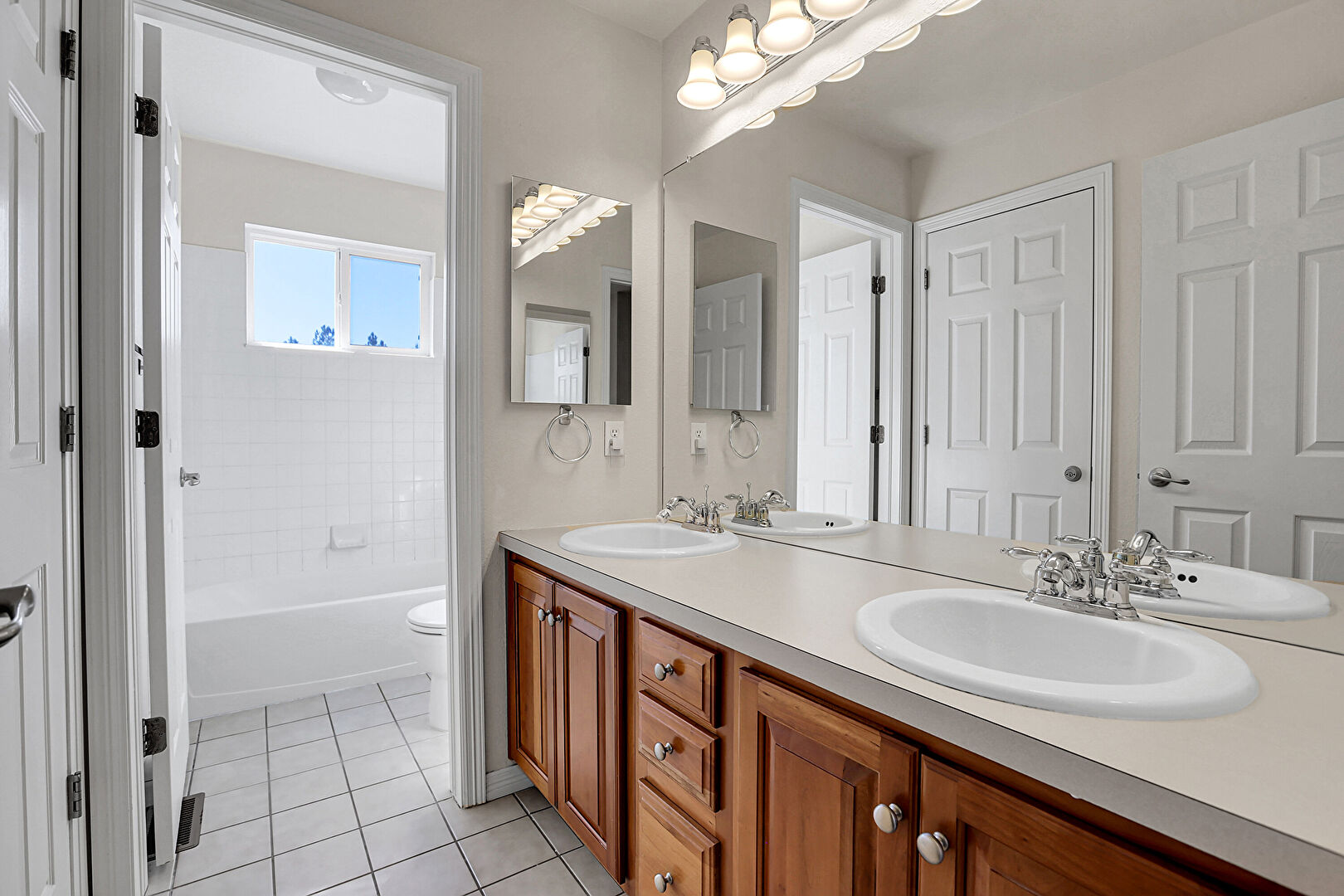 Baseboards Wall, Combined Bath Shower, Double Vanity, Drywall, Full Bathroom, Marble Finish Floor, Natural Light, Textured Wall, Tile Floor, Vanity, Vent, Walk In Closet, Water Closet, Baseboards Wall, Drywall, Full Bathroom, Natural Light, Textured Wall, Tile Floor, Two Single Vanities, Vanity