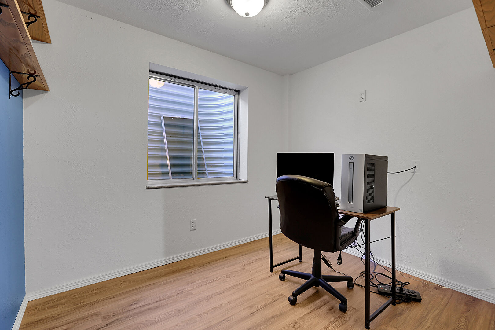 Natural Light, Office Area, Textured Ceiling, Textured Wall, Wood Finish Floor, Baseboards Wall