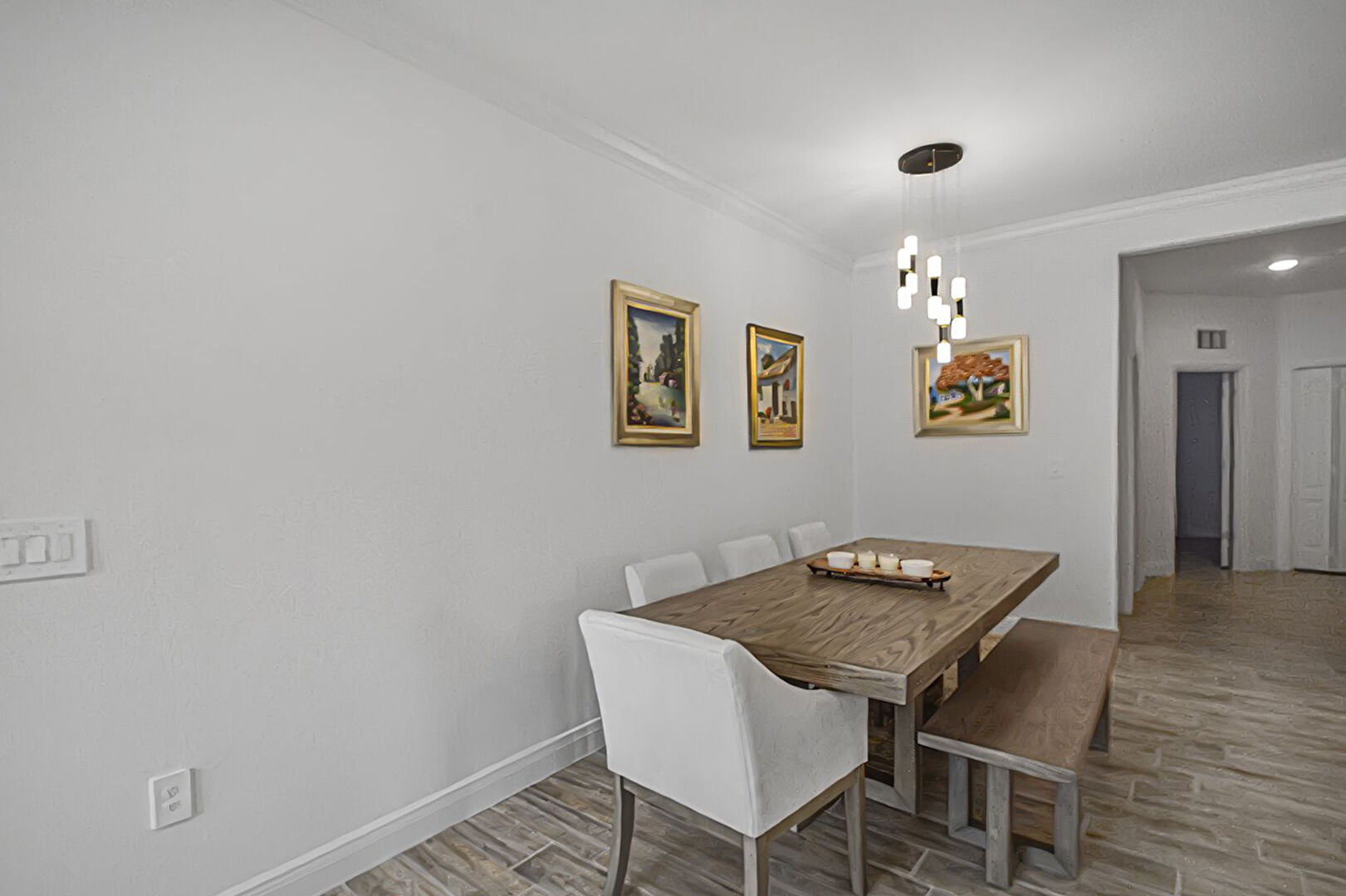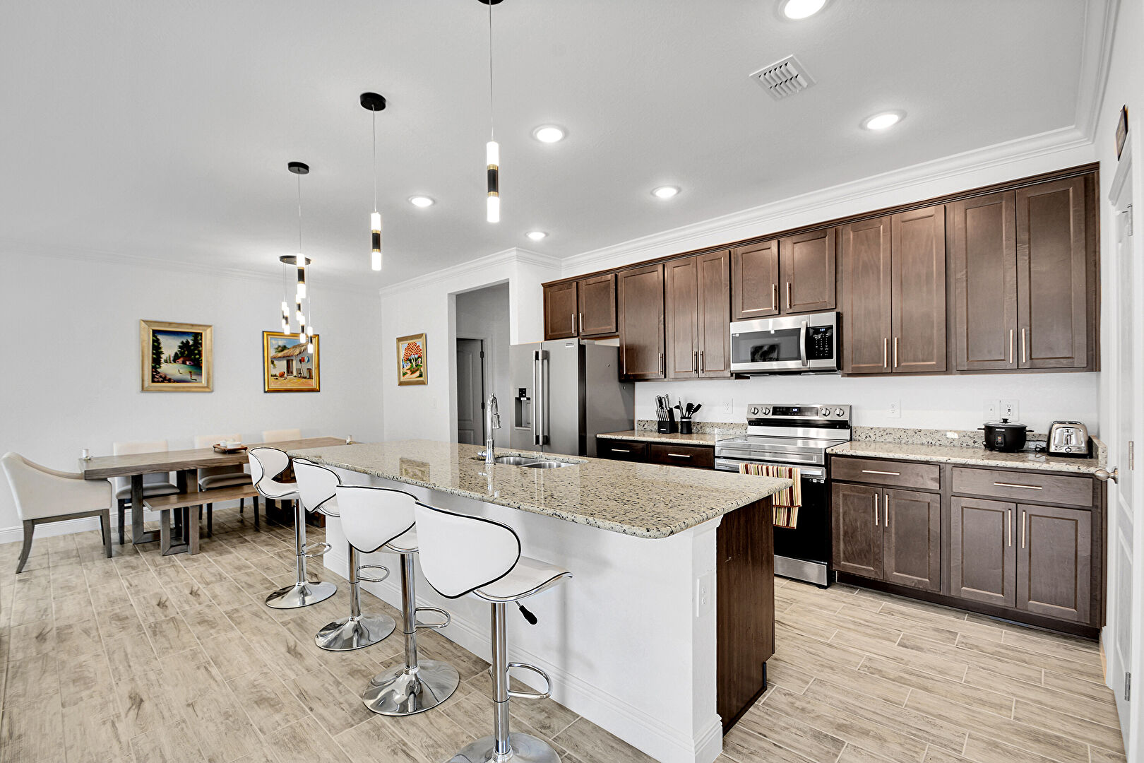 Baseboards Wall,  Crown Molding,  Crown Molding Cabinets,  Dark Brown Cabinets,  Drywall,  Kitchen Bar,  Kitchen Island,  One Wall Kitchen,  Pendant Lighting,  Recessed Lighting,  Shaker Cabinets,  Stone Countertops,  Vent,  Wood Finish Floor, Natural Light, Stone Countertops