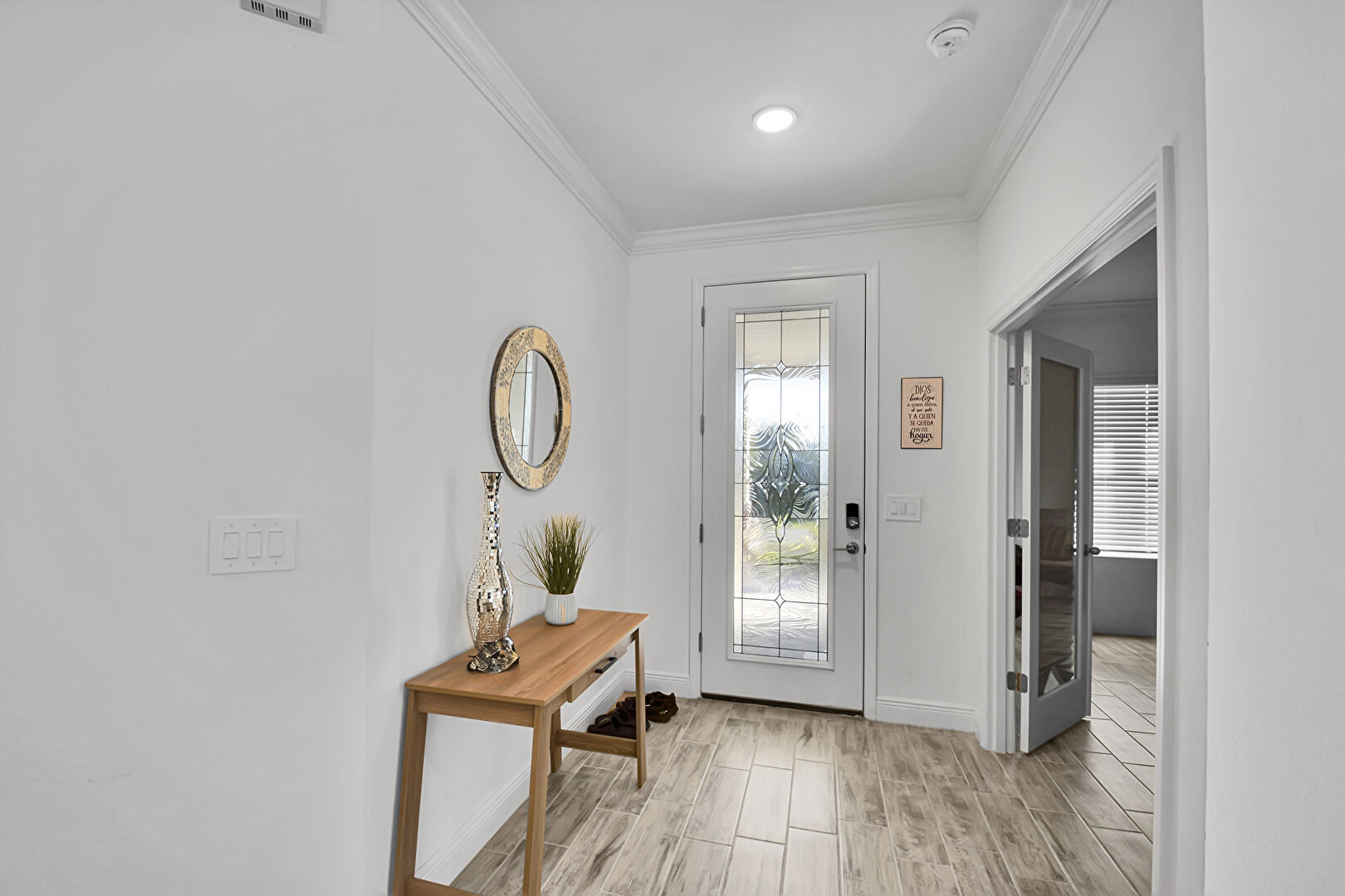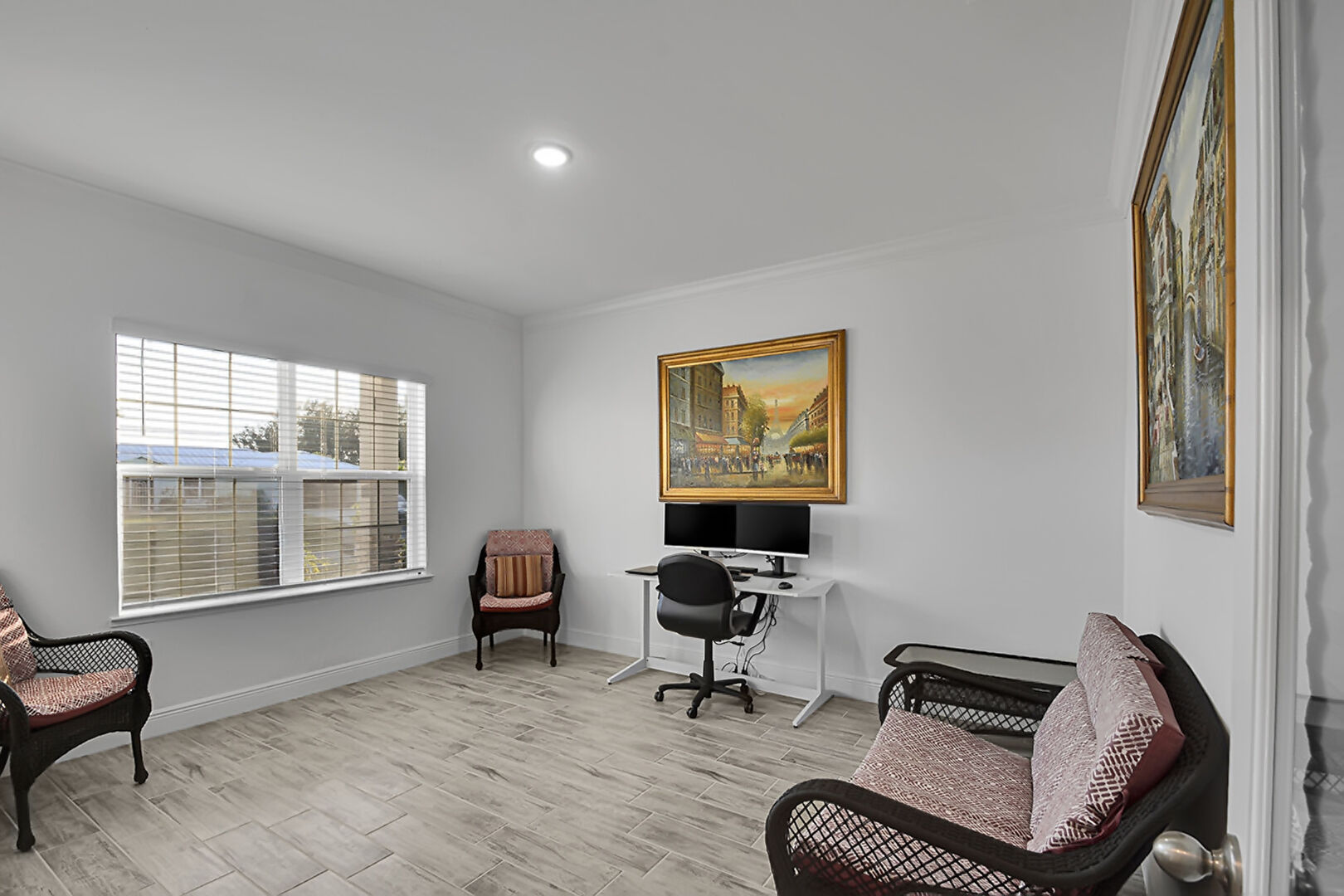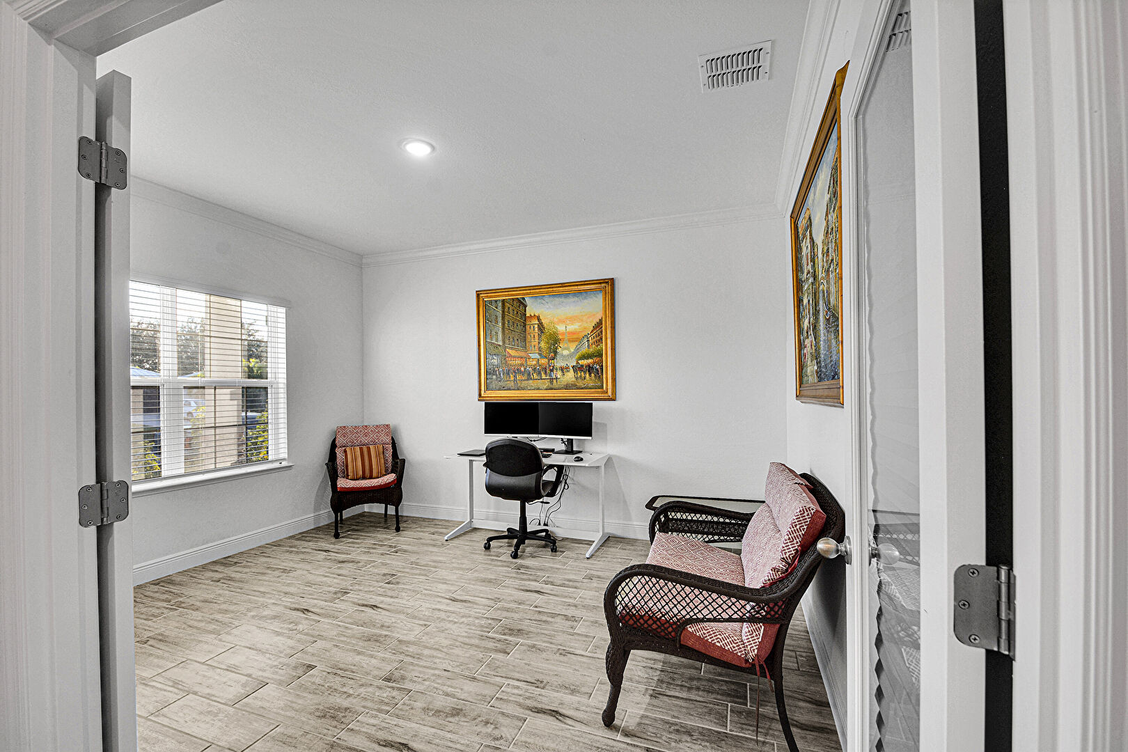 Baseboards Wall,  Crown Molding,  Drywall,  French Doors,  Natural Light,  Office Area,  Recessed Lighting,  Vent,  Wood Finish Floor, Baseboards Wall, Drywall, Office Area