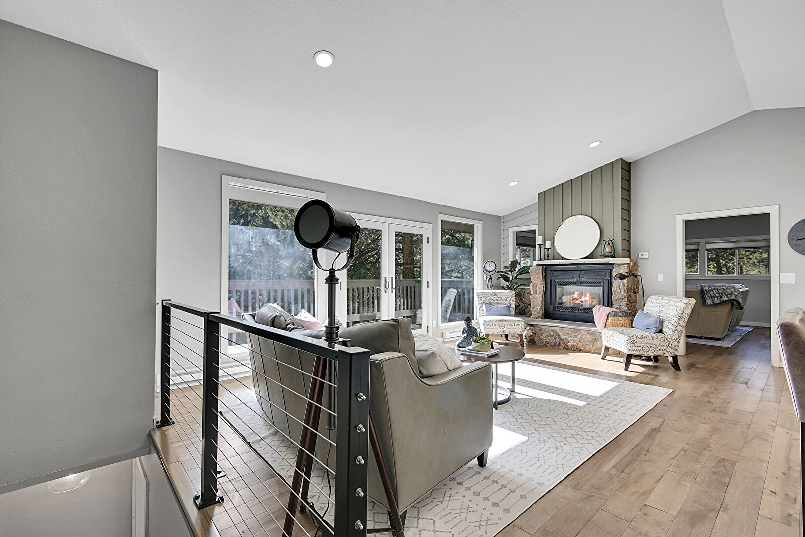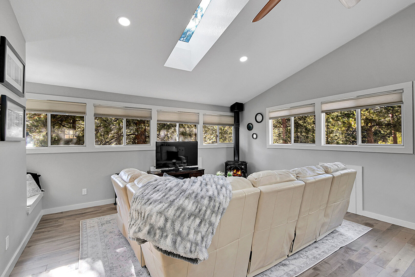 Baseboard Radiator, Baseboards Wall, Cathedral Ceiling, Ceiling Fan, Drywall, Fireplace, French Doors, High Ceiling, Natural Light, Notable Chandelier, Recessed Lighting, Skylight, Vaulted Ceiling, Wood Finish Floor, Baseboards Wall, Cathedral Ceiling, High Ceiling, Natural Light, Notable Chandelier, Recessed Lighting, Skylight, Wood Stove