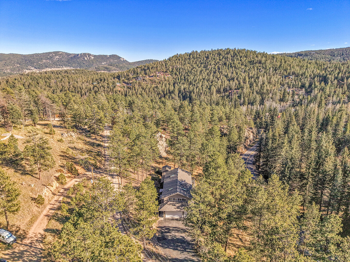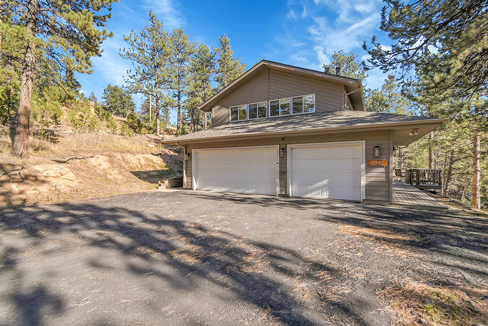Balcony, Built In Garage, Deck, Driveway, Fence, Forest View, Horizontal Siding, Mountain View, Outdoor Structure, Shingle Roof, Vertical Siding, Woods View, Deck, Forest View, Mountain View, Shed
