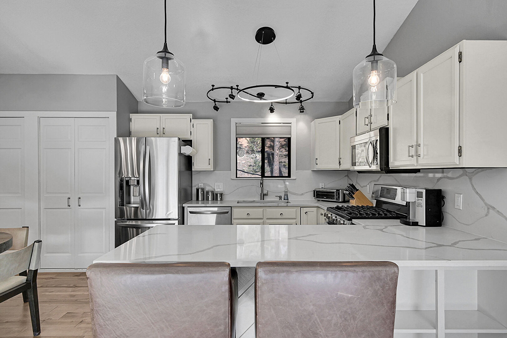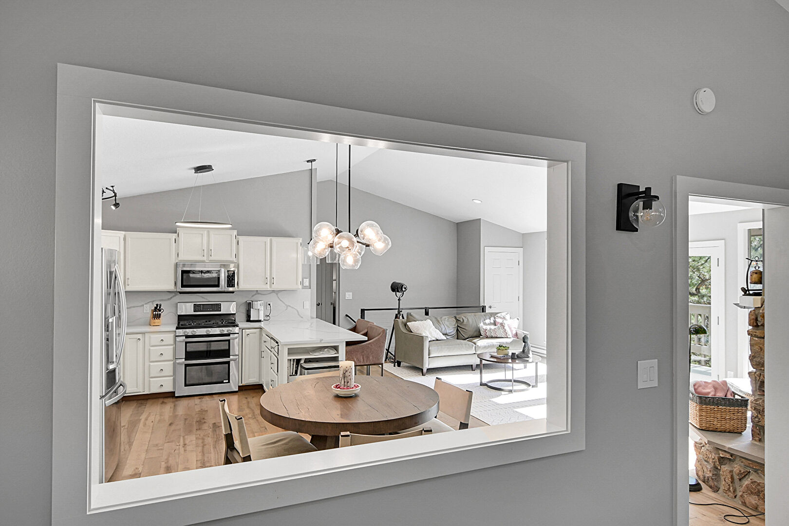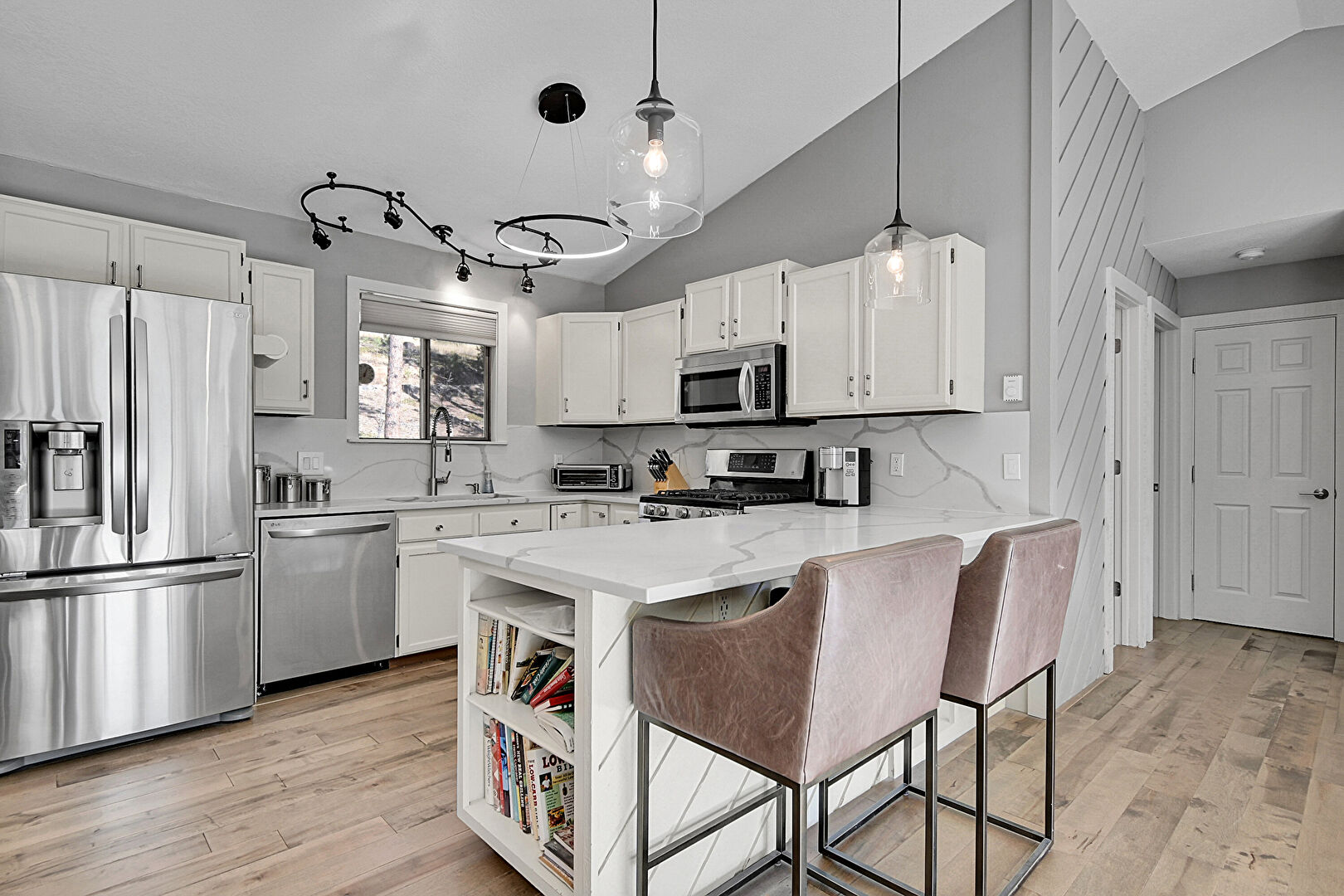 Baseboards Wall, Cathedral Ceiling, Drywall, Fireplace, French Doors, High Ceiling, Kitchen Bar, Kitchen Peninsula, Natural Light, Notable Chandelier, Open Shelves, Opens To Living Area, Pass Through Window, Pendant Lighting, Recessed Lighting, Shaker Cabinets, Smoke Carbon Monoxide Detector, Stone Countertops, Toaster, U Shaped Kitchen, Vaulted Ceiling, Vent, Visible Hinge Cabinets, Wood Finish Floor, Cathedral Ceiling, Kitchen Peninsula, Opens To Living Area, Shaker Cabinets, U Shaped Kitchen, Wood Finish Floor