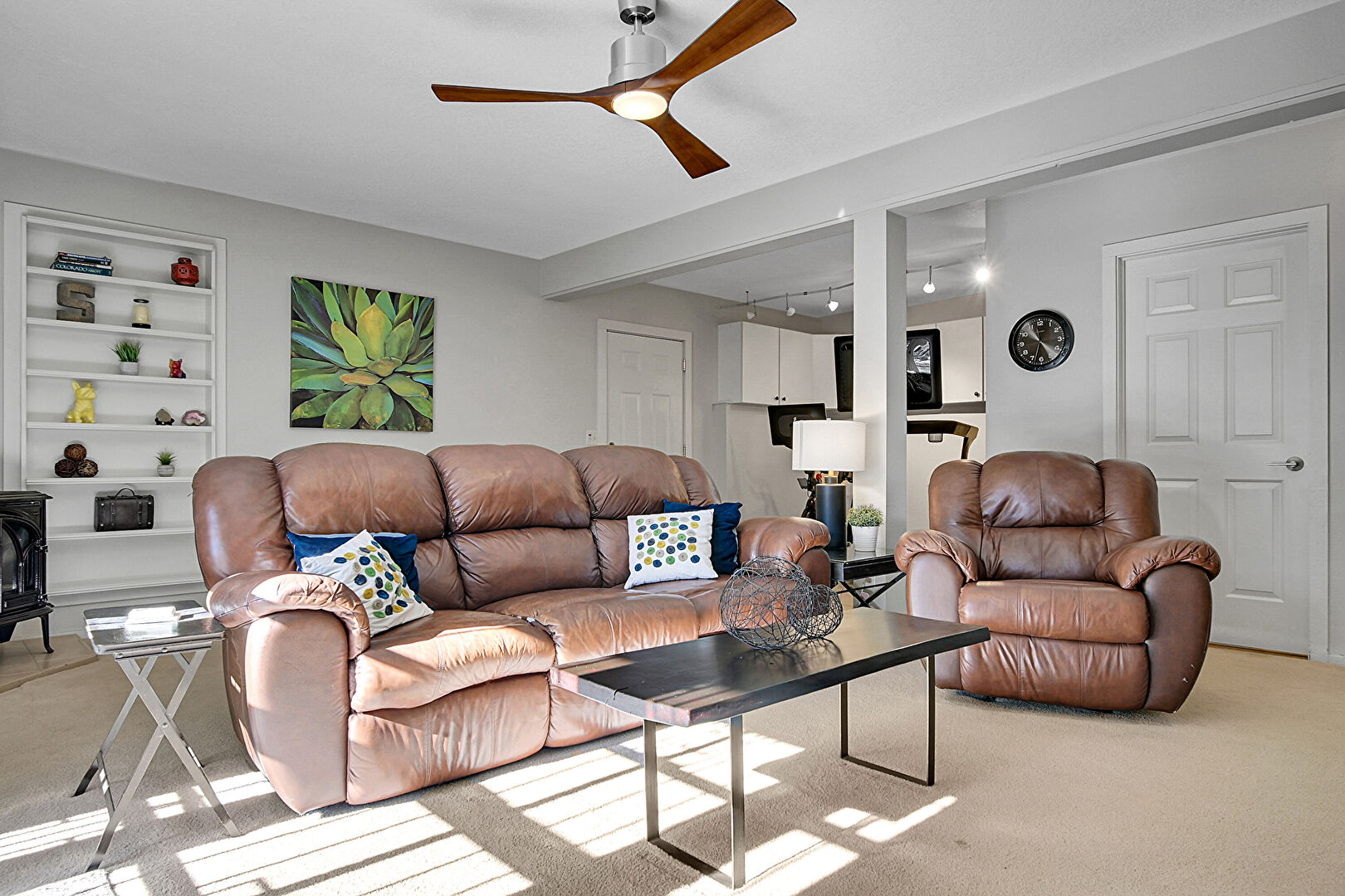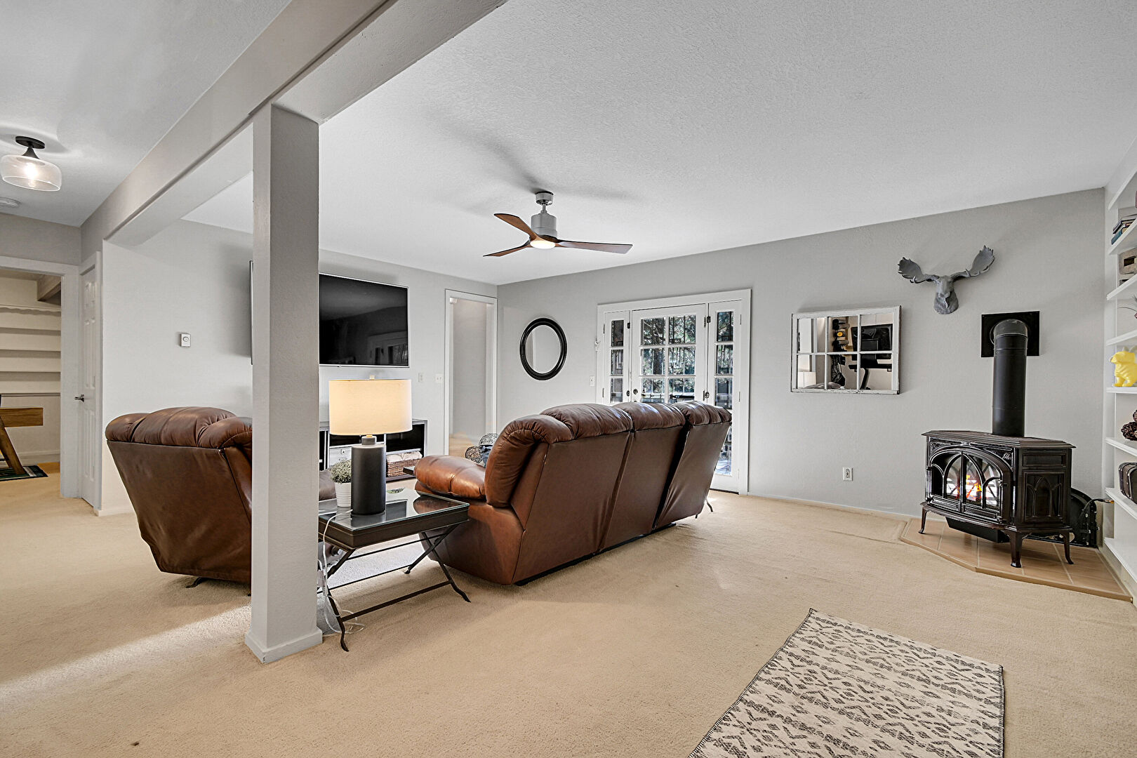 Baseboards Wall, Built In Shelves, Carpet, Ceiling Fan, Drywall, Natural Light, Textured Ceiling, Track Lighting, Wood Stove, Baseboards Wall, Ceiling Fan, French Doors