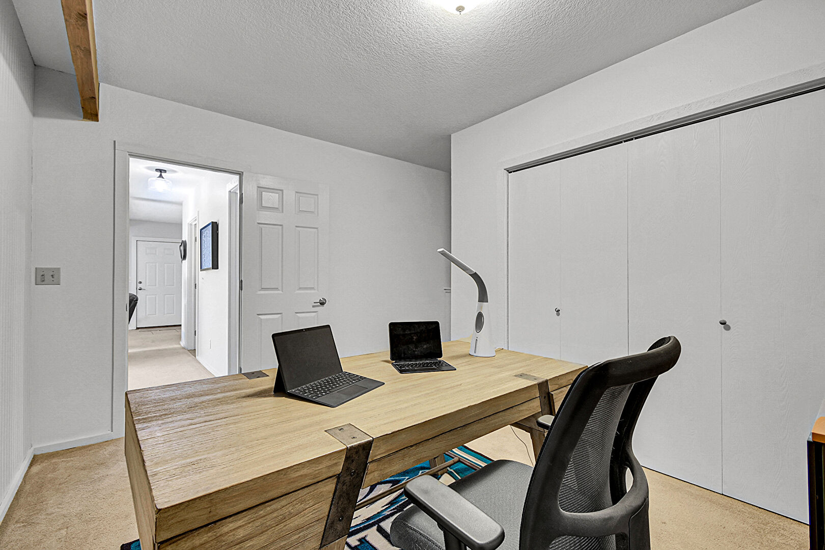 Baseboards Wall, Built In Shelves, Carpet, Drywall, Office Area, Textured Ceiling, Carpet, Textured Ceiling