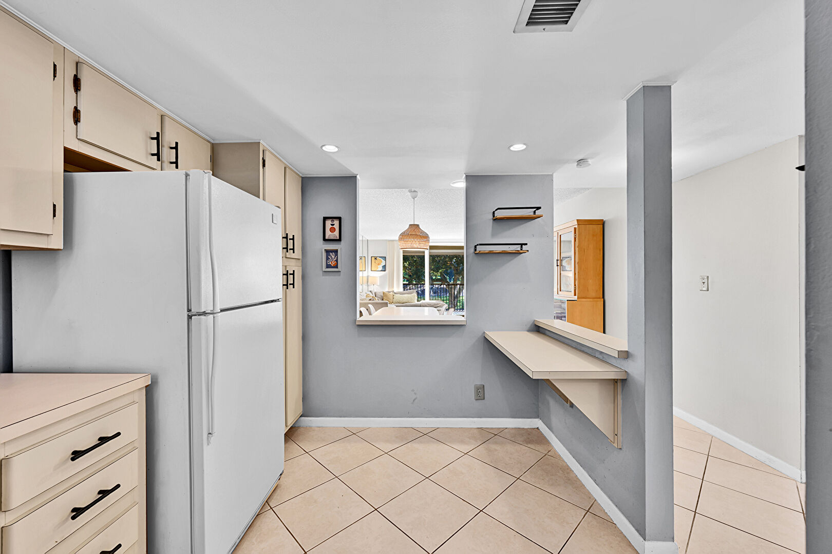 Baseboards Wall, Cream Cabinets, Drywall, Natural Light, Open Shelves, Pass Through Window, Pendant Lighting, Recessed Lighting, Tile Floor, Vent, Visible Hinge Cabinets, Natural Light, Tile Floor
