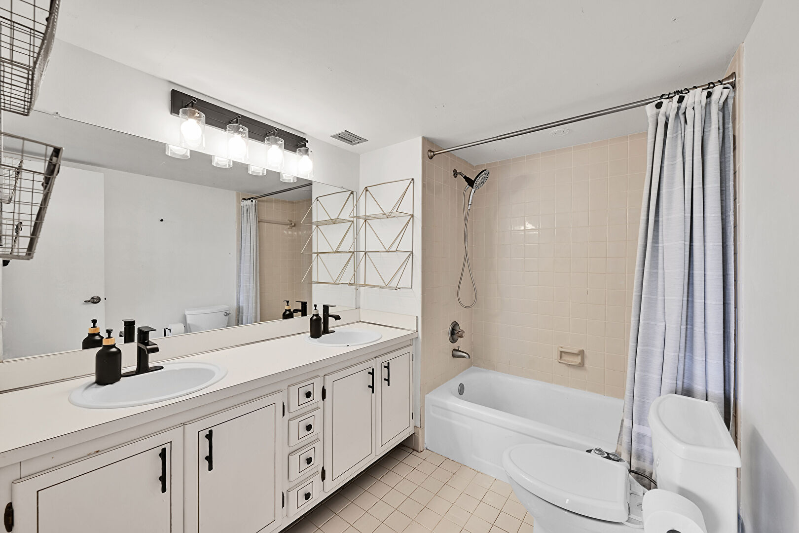 Combined Bath Shower, Double Vanity, Drywall, Full Bathroom, Natural Light, Tile Floor, Vanity, Vent, Drywall, Full Bathroom