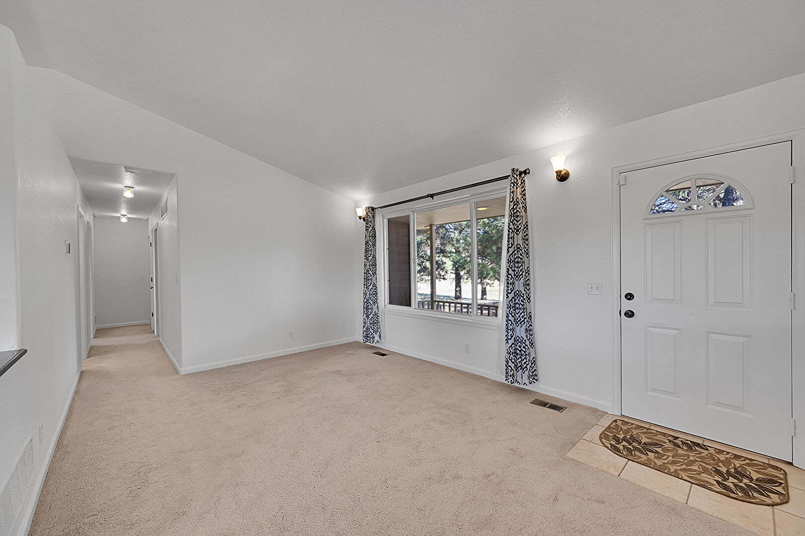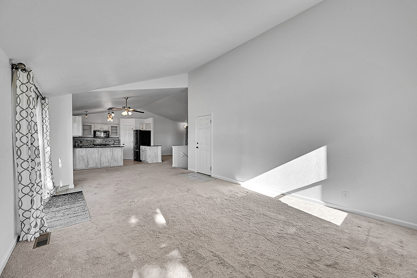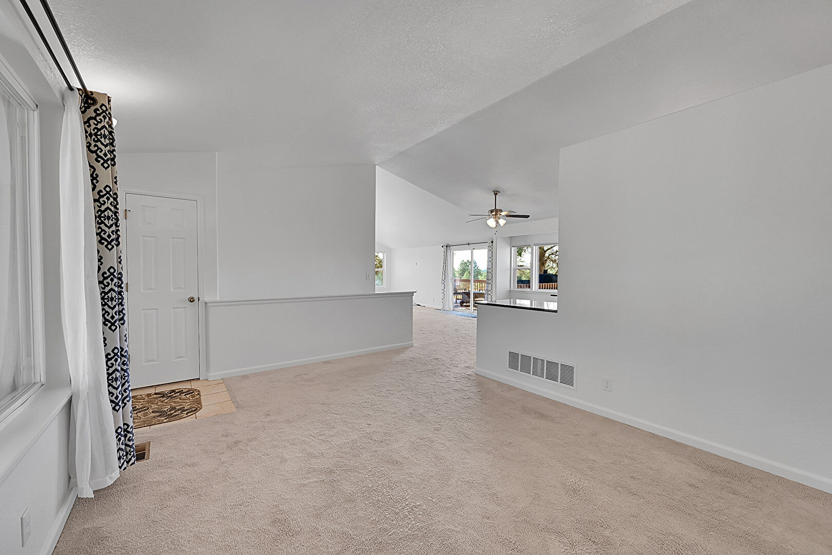 Baseboards Wall, Carpet, Ceiling Fan, Drywall, Natural Light, Textured Ceiling, Tile Floor, Vaulted Ceiling, Vent, Baseboards Wall, Vaulted Ceiling