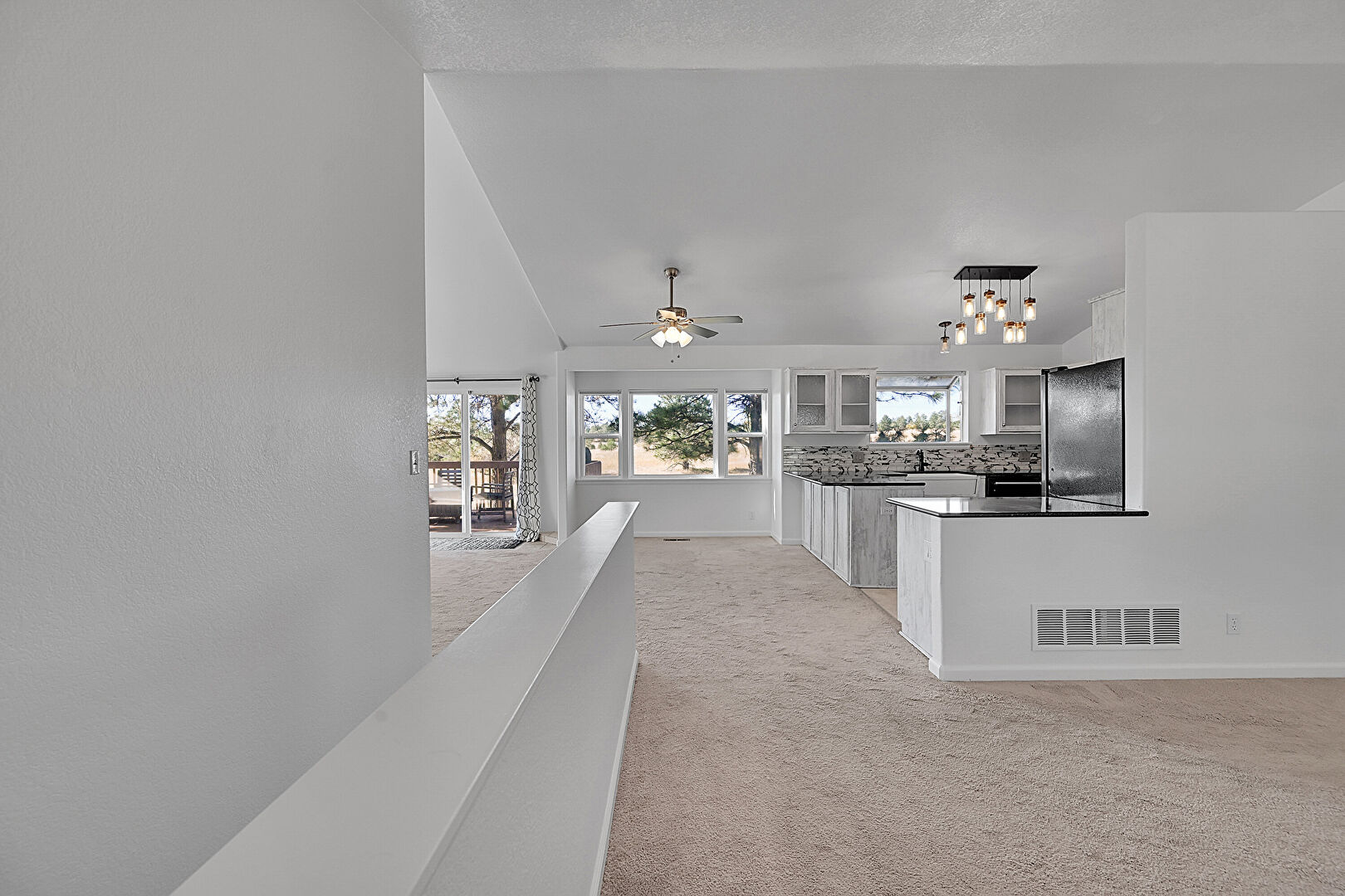 Baseboards Wall, Ceiling Fan, Drywall, Glass Insert Cabinets, Kitchen Bar, Kitchen Peninsula, Natural Light, Notable Chandelier, Opens To Living Area, Pendant Lighting, Textured Ceiling, Vaulted Ceiling, Vent, Carpet