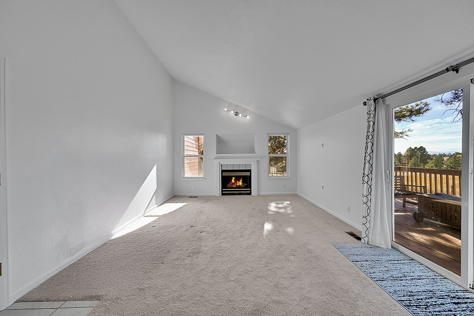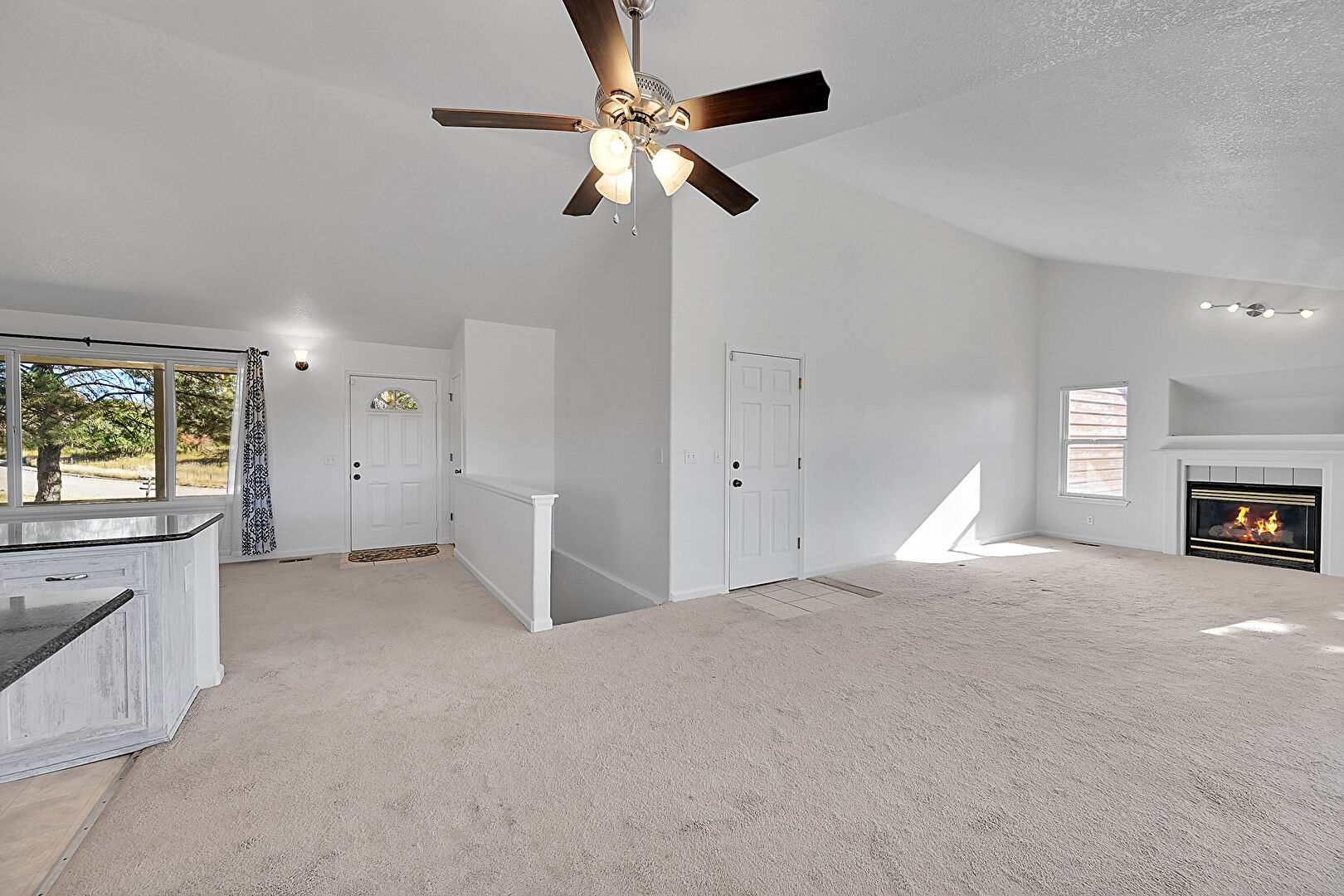 Baseboards Wall, Carpet, Ceiling Fan, Drywall, Fireplace, High Ceiling, Natural Light, Vaulted Ceiling, Vent, Carpet, Drywall
