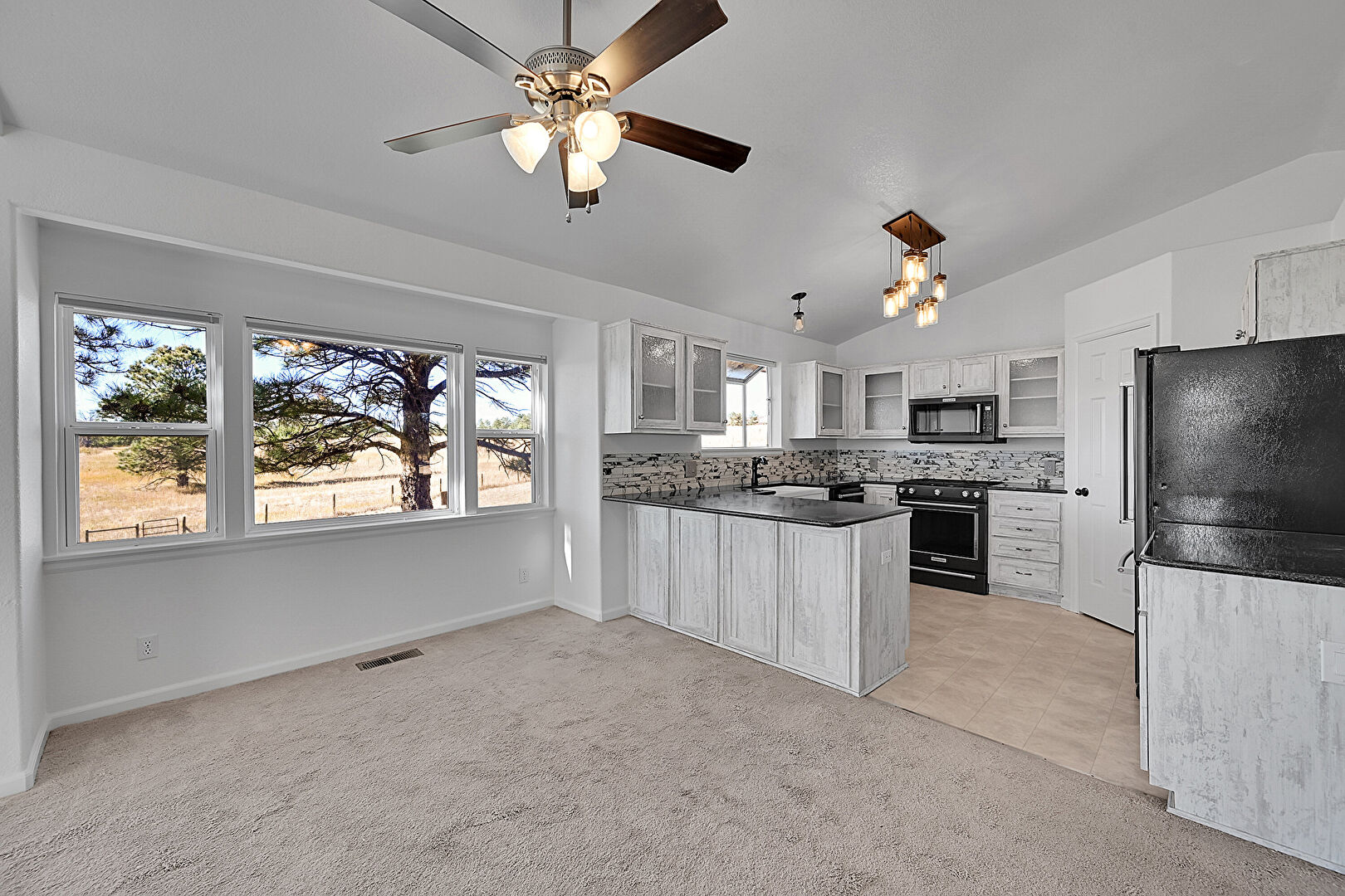 Baseboards Wall, Carpet, Ceiling Fan, Drywall, G Shaped Kitchen, Glass Insert Cabinets, High Ceiling, Kitchen Peninsula, Natural Light, Pendant Lighting, Shaker Cabinets, Textured Ceiling, Tile Floor, Vaulted Ceiling, Vent, Fireplace, Opens To Living Area
