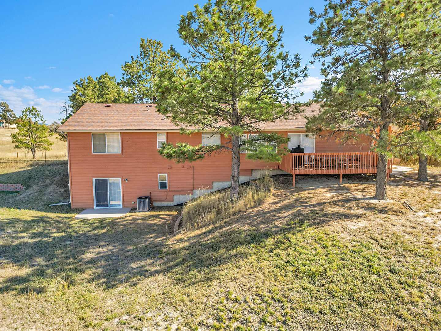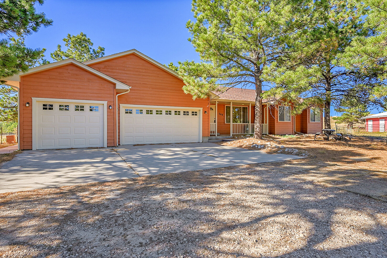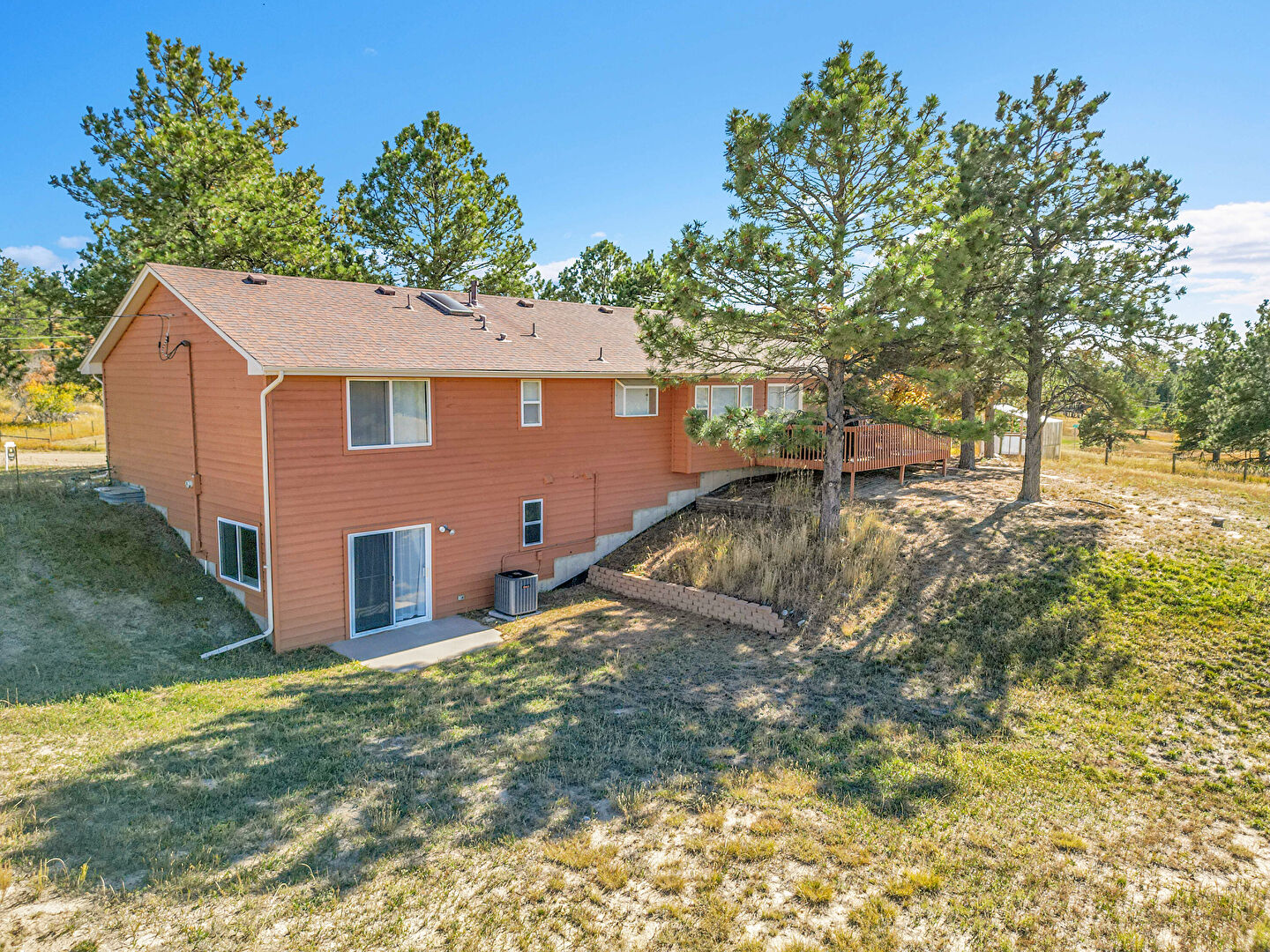 Basement Walk Out, Central Ac, Concrete Foundation, Downspout, Driveway, Gutters, Horizontal Siding, Lawn, Outdoor Structure, Patio, Pole Building, Deck, Garage, Horizontal Siding, Porch, Rural View