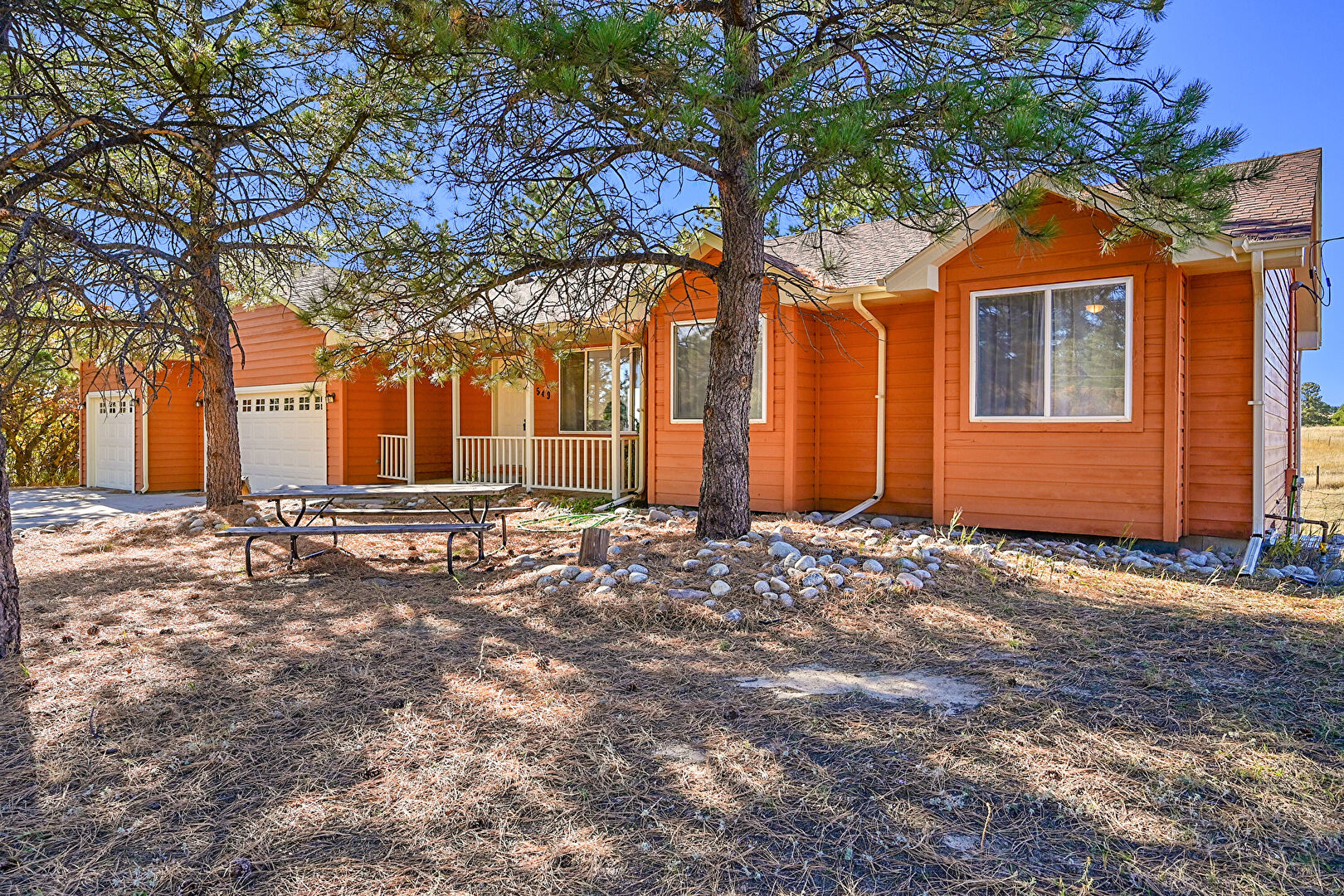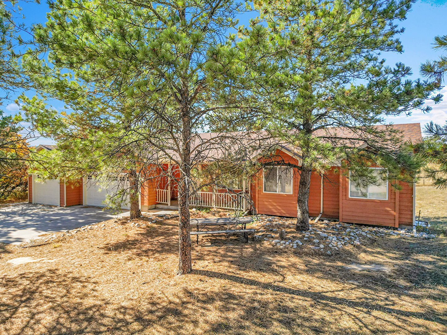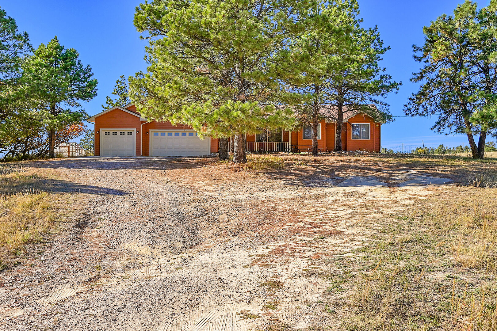 Basement Walk Out, Central Ac, Concrete Foundation, Downspout, Driveway, Gutters, Horizontal Siding, Lawn, Outdoor Structure, Patio, Pole Building, Deck, Garage, Horizontal Siding, Porch, Rural View