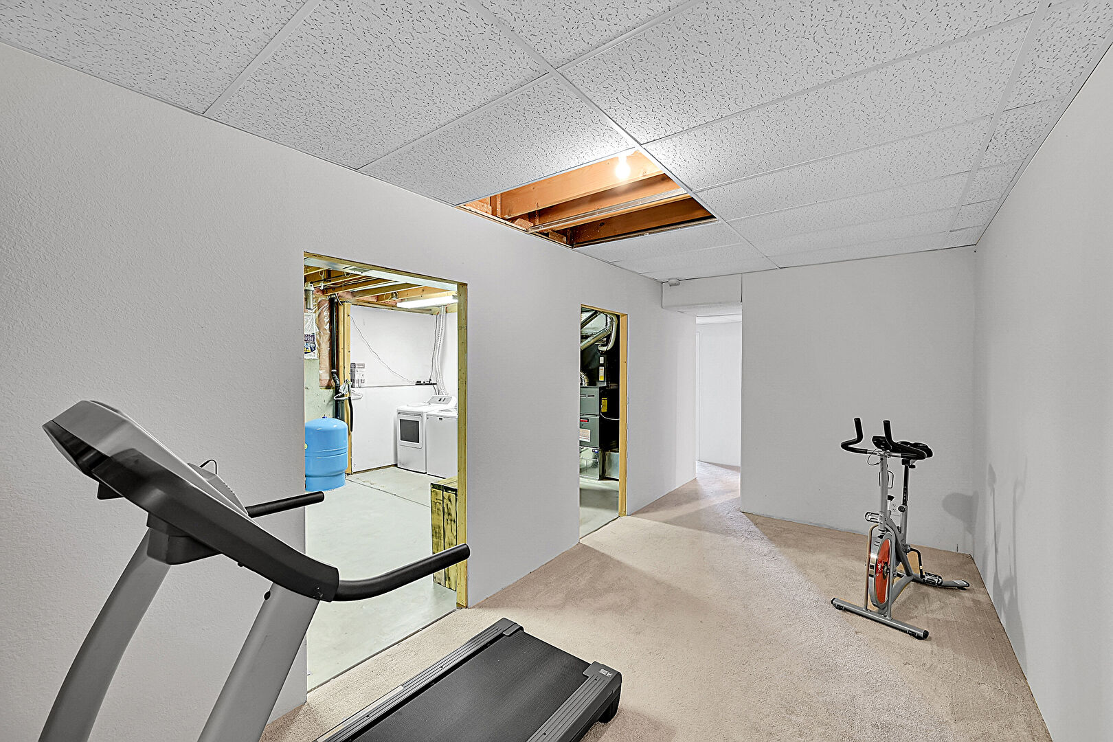 Basement, Carpet, Drop Ceiling, Drywall, Laundry, Water Pressure Tank, Carpet, Drywall