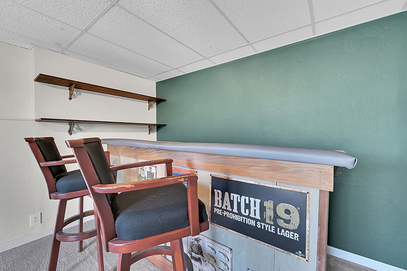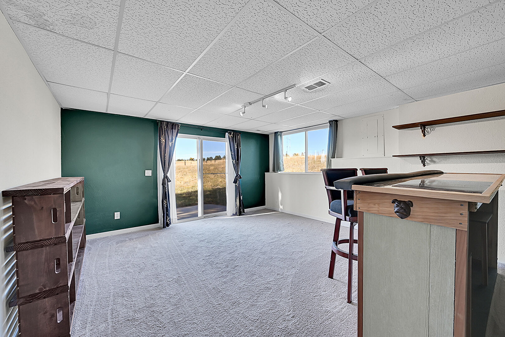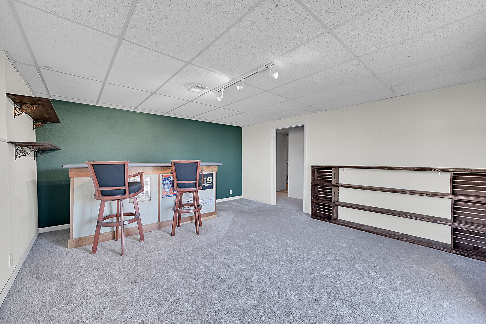 Baseboards Wall, Basement, Carpet, Drop Ceiling, Drywall, Indoor Bar, Natural Light, Open Shelves, Track Lighting, Vent, Baseboards Wall, Drop Ceiling, Textured Wall