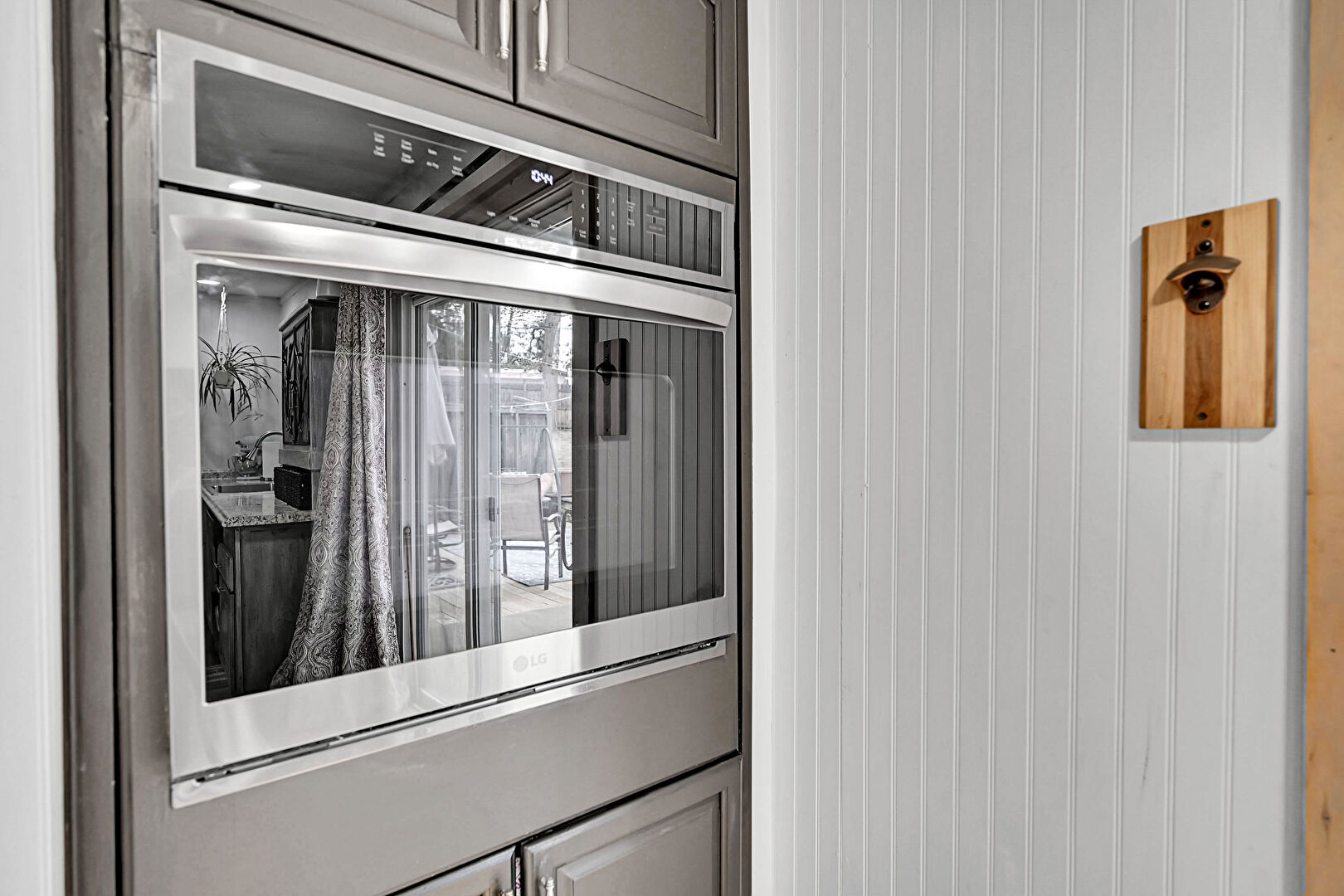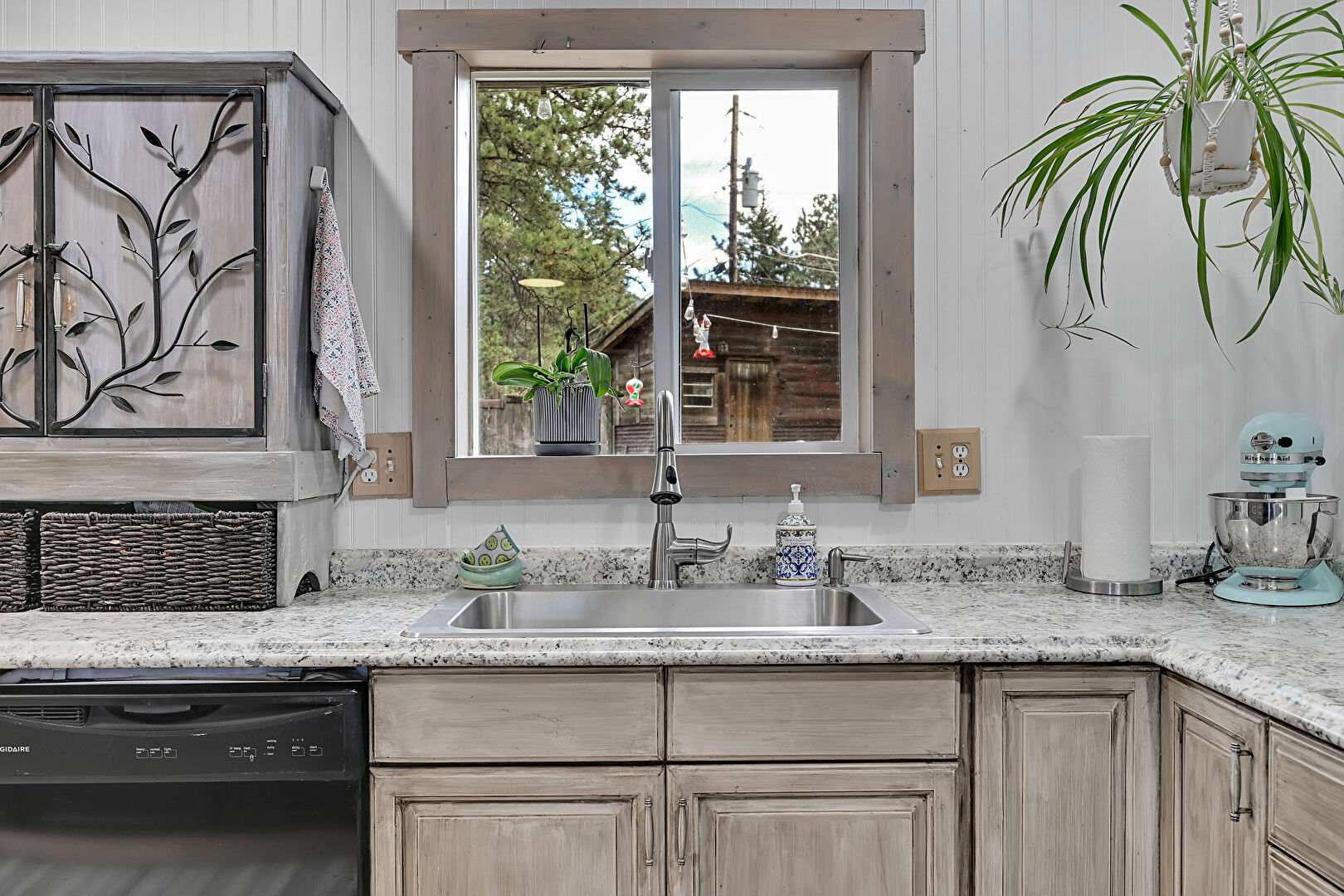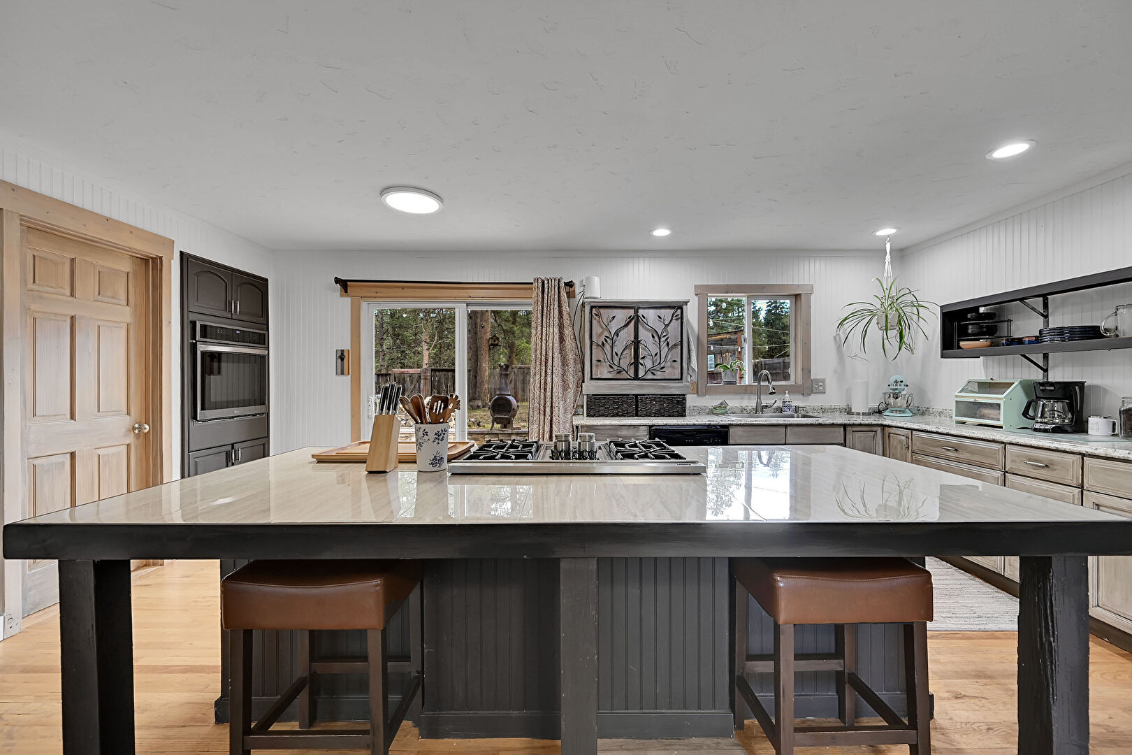 Arched Cabinets, Baseboards Wall, Crown Molding, Drywall, Fireplace, Gray Cabinets, Kitchen Bar, Kitchen Island, L Shaped Kitchen, Natural Light, Open Shelves, Opens To Living Area, Raised Cabinets, Recessed Lighting, Stone Countertops, Toaster, U Shaped Kitchen, Wood Finish Floor, Wood Wall, Black Cabinets, Natural Light, Opens To Living Area, Raised Cabinets, Recessed Lighting